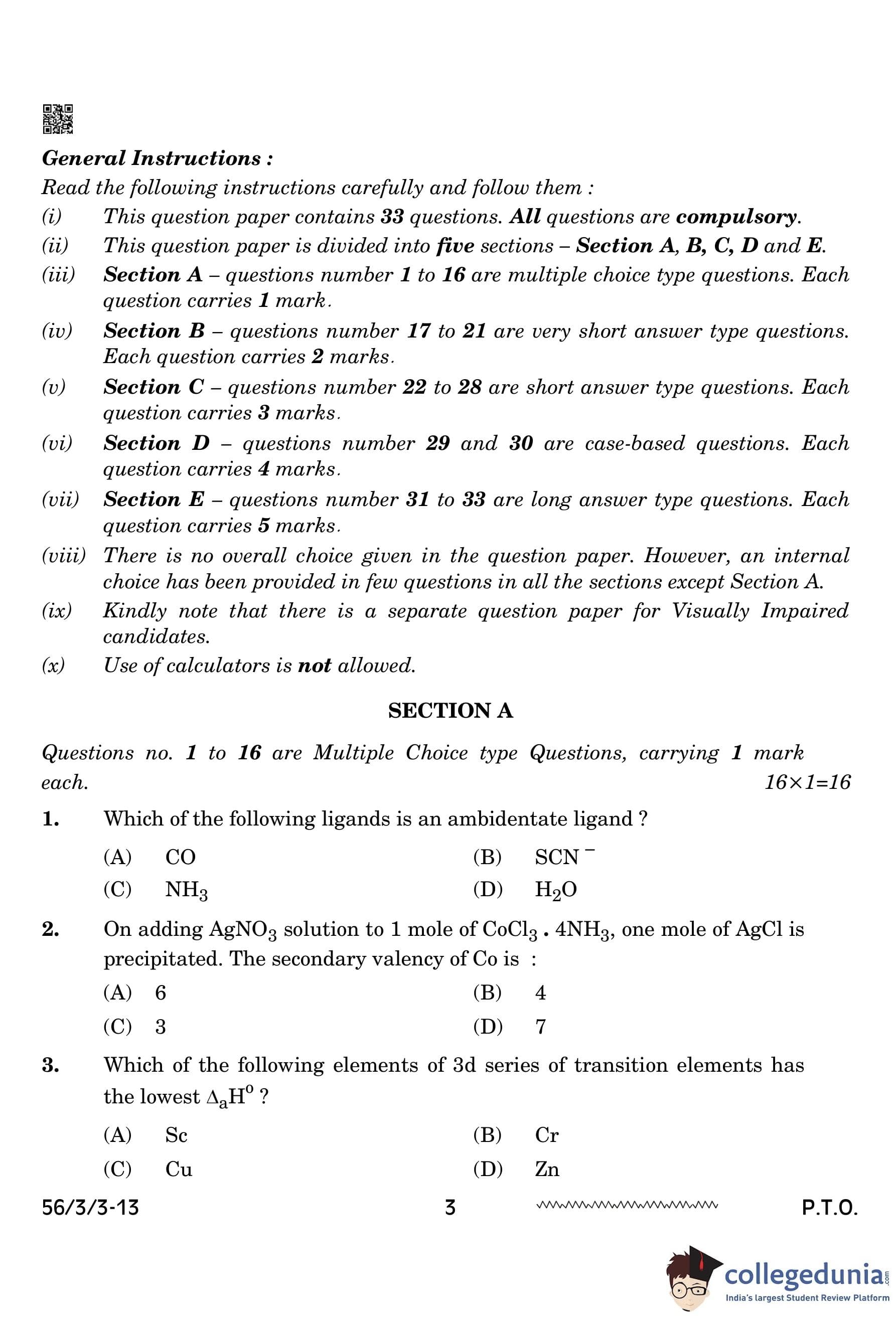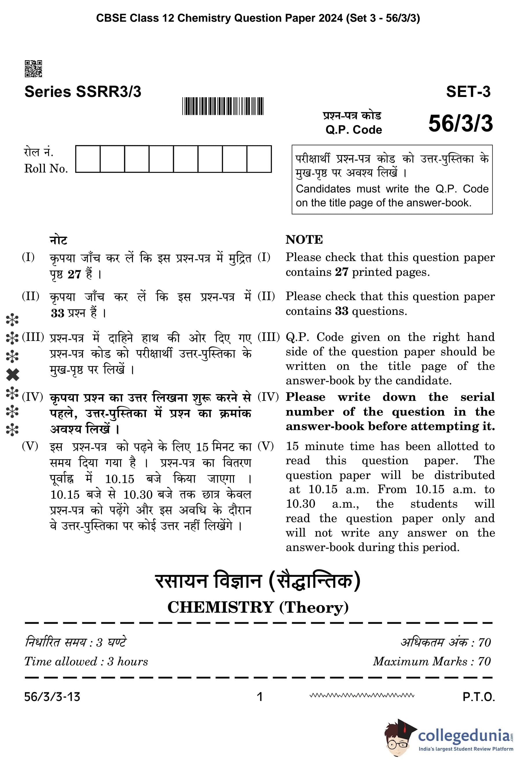 CBSE Class 12 Chemistry Question Paper 2024 PDF (Set 3 - 56/3/3) is available for download here. CBSE conducted the Chemistry exam on February 27, 2024, from 10:30 AM to 1:30 PM. The total marks for the theory paper are 70. The question paper contains 20% MCQ-based questions, 40% competency-based questions, and 40% short and long answer type questions.