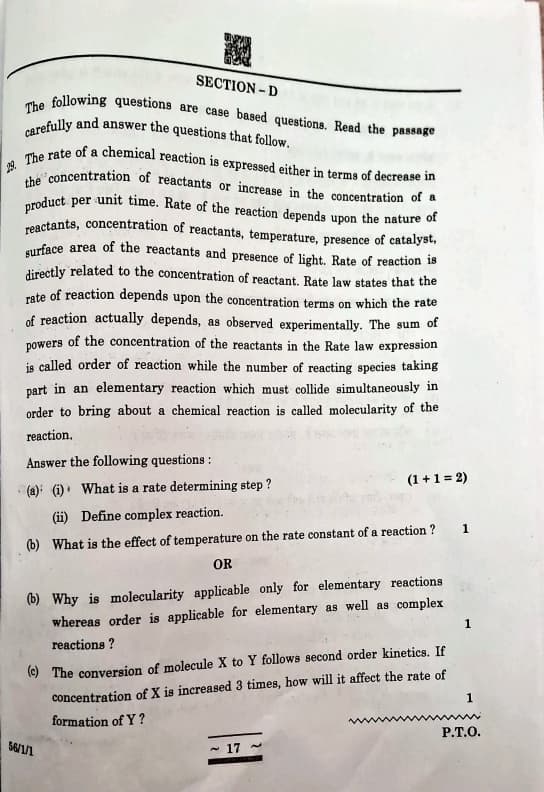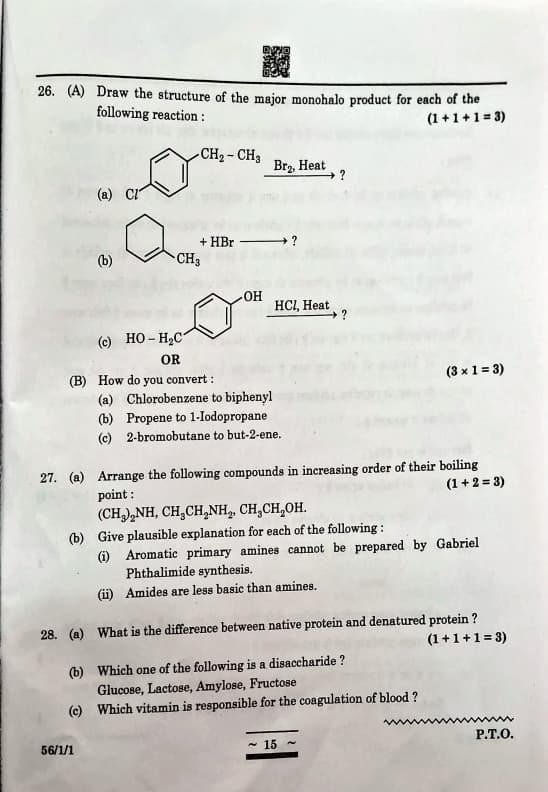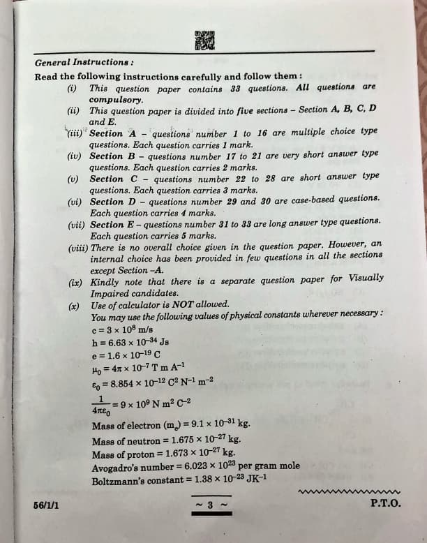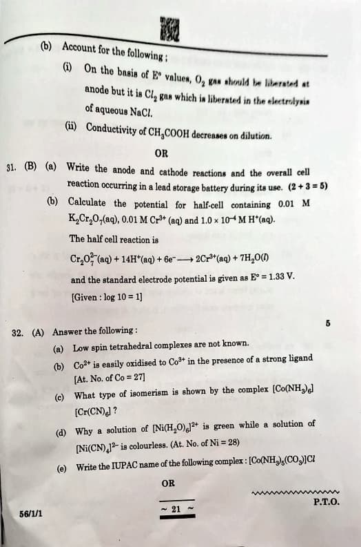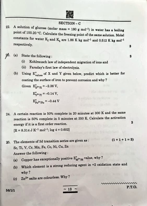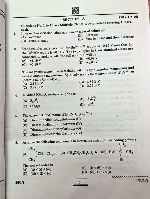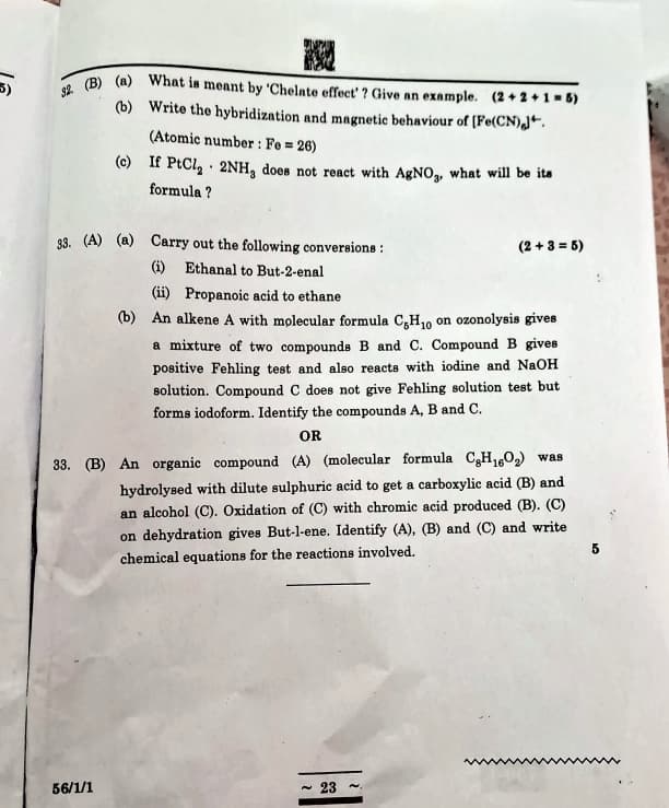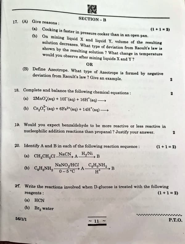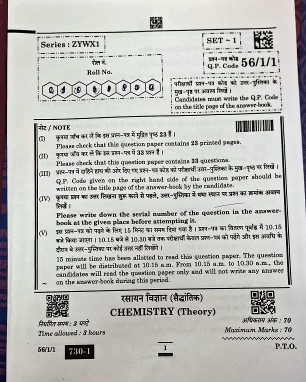 CBSE Class 12 Chemistry Question Paper 2025 (Set 1-56/1/1) with Answer Key