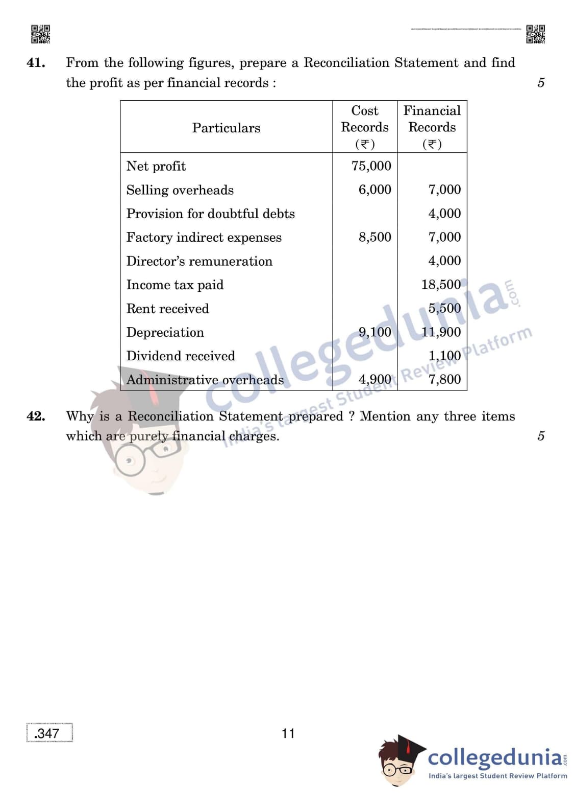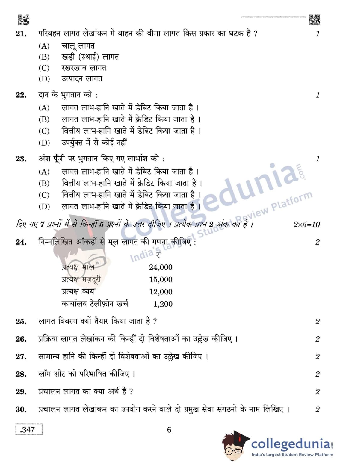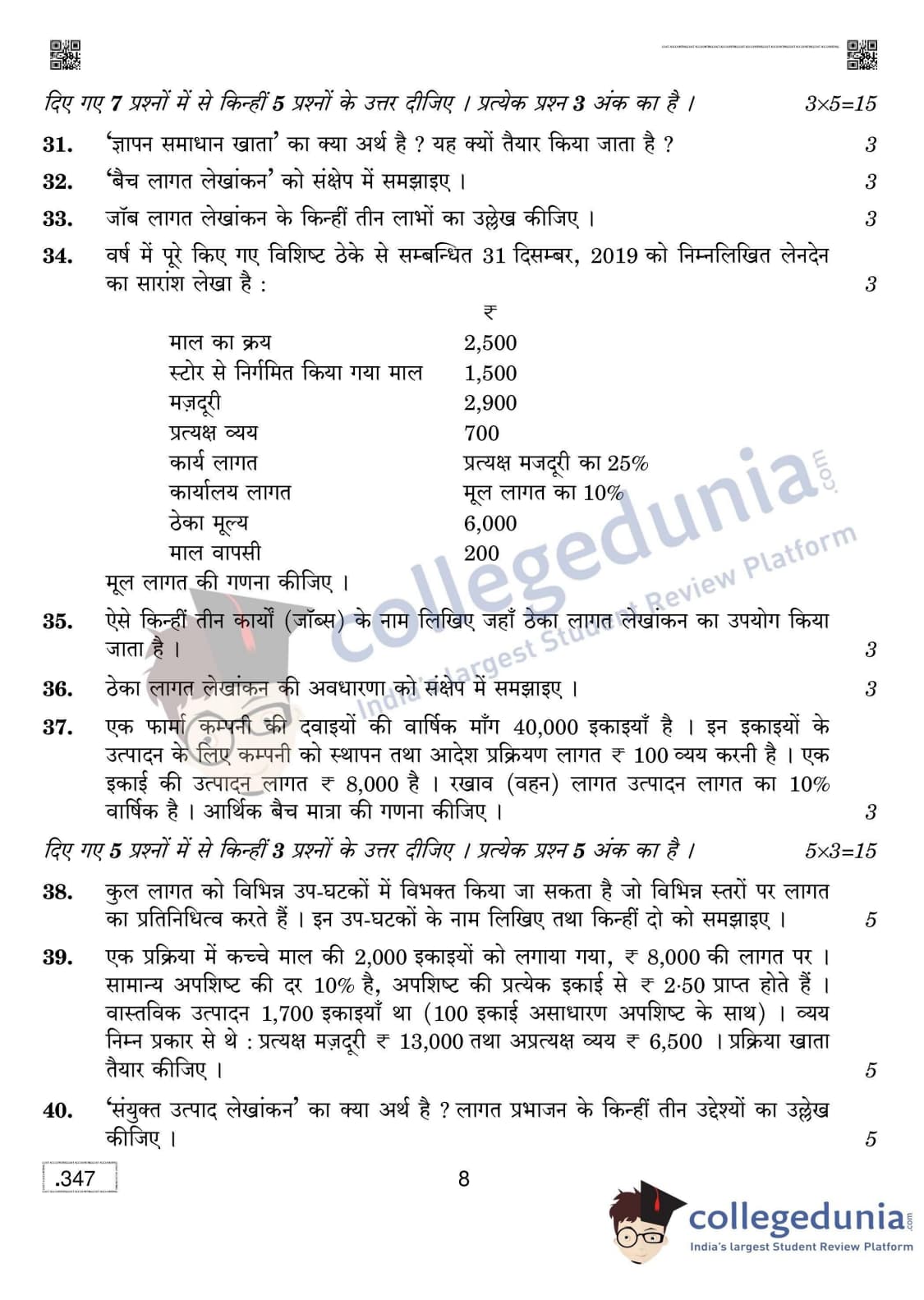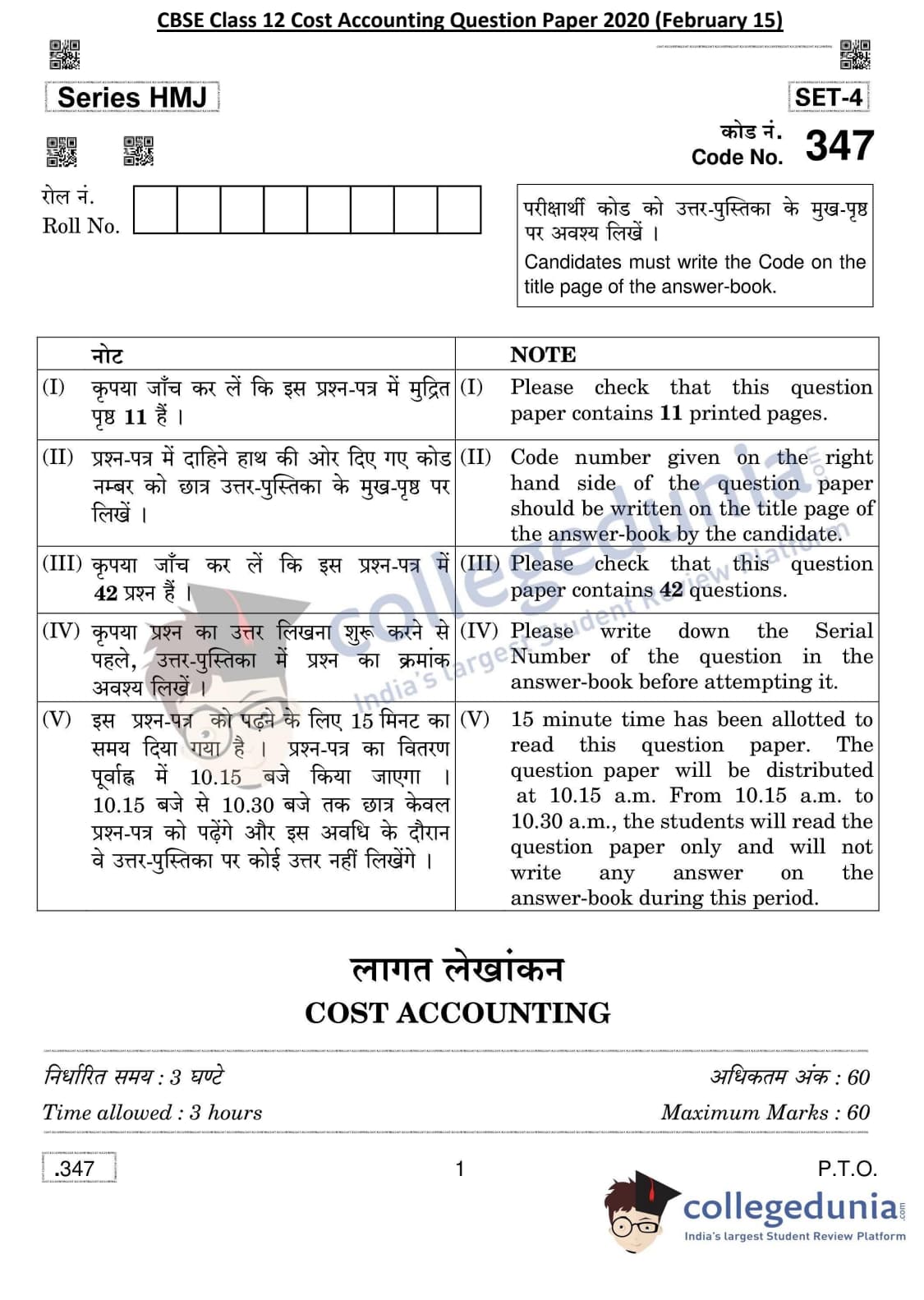 CBSE Class 12 Cost Accounting Question Paper 2020 with Answer Key (February 15)
