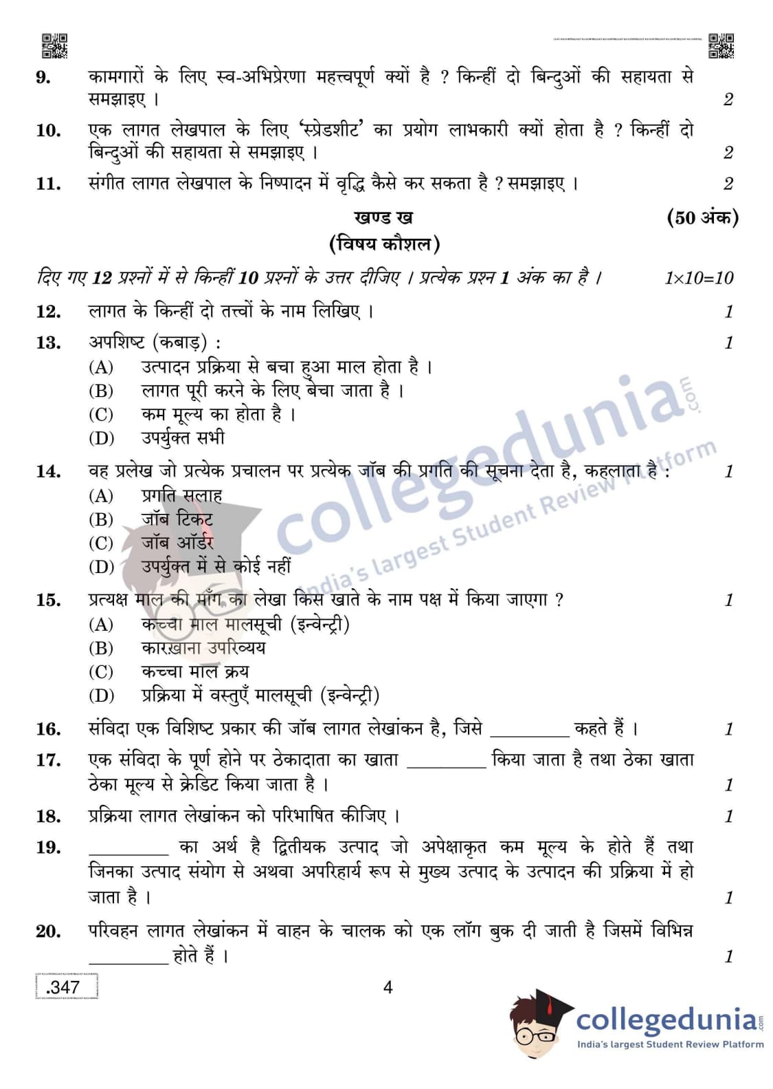 CBSE Class 12 Cost Accounting Question Paper 2020 with Answer Key Set 4 is available for download. The exam was conducted by the Central Board of Secondary Education on February 15, 2020 in the Morning Session 10:30 AM to 1:30 PM. The medium of paper was English & Hindi. The question paper comprised a total of 42 questions divided among 2 sections.