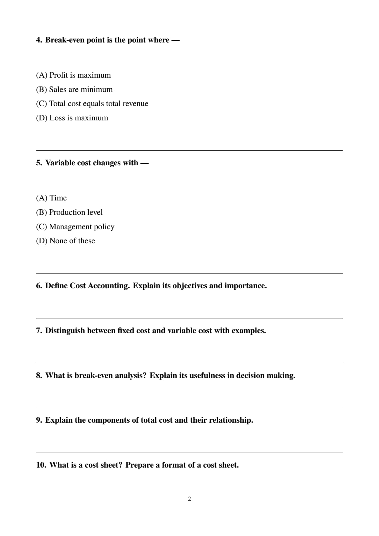 Fixed costs remain constant irrespective of production (e.g., rent, salaries). Variable costs change with output (e.g., raw materials, direct labour). Quick Tip: Fixed = Constant total, Variable = Changes with output