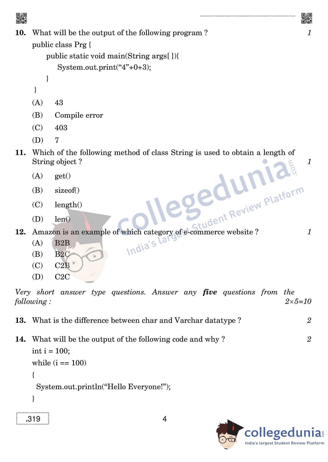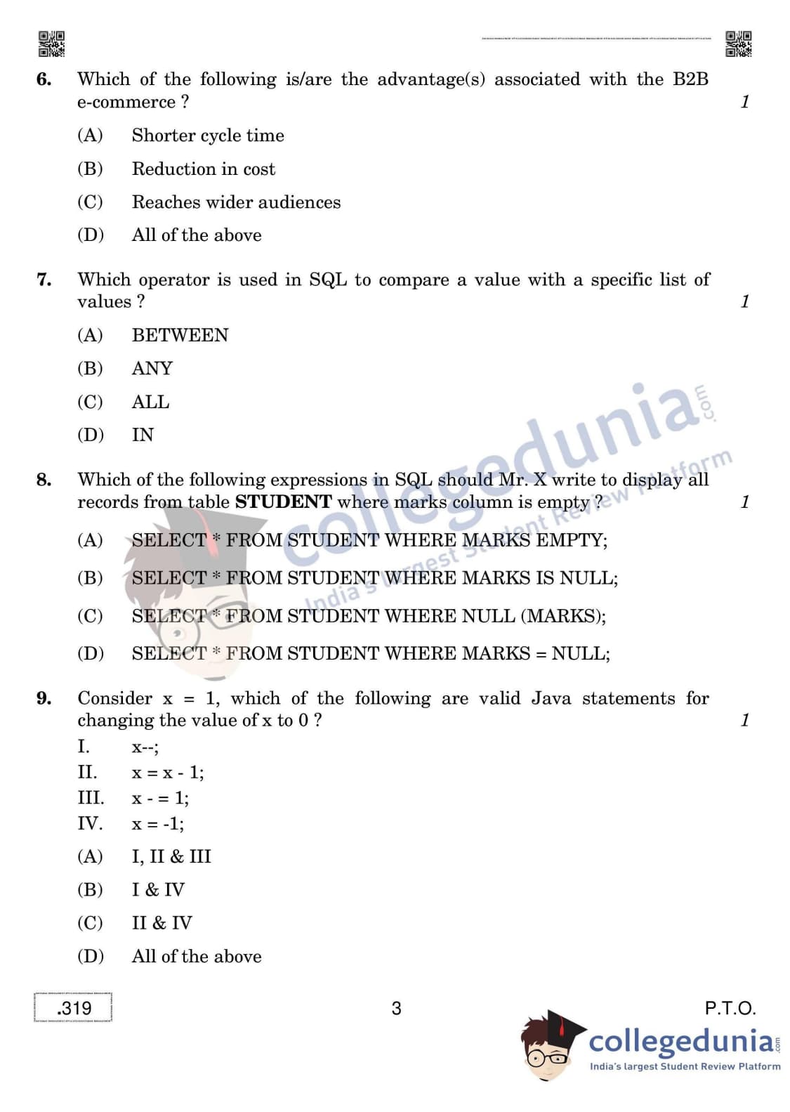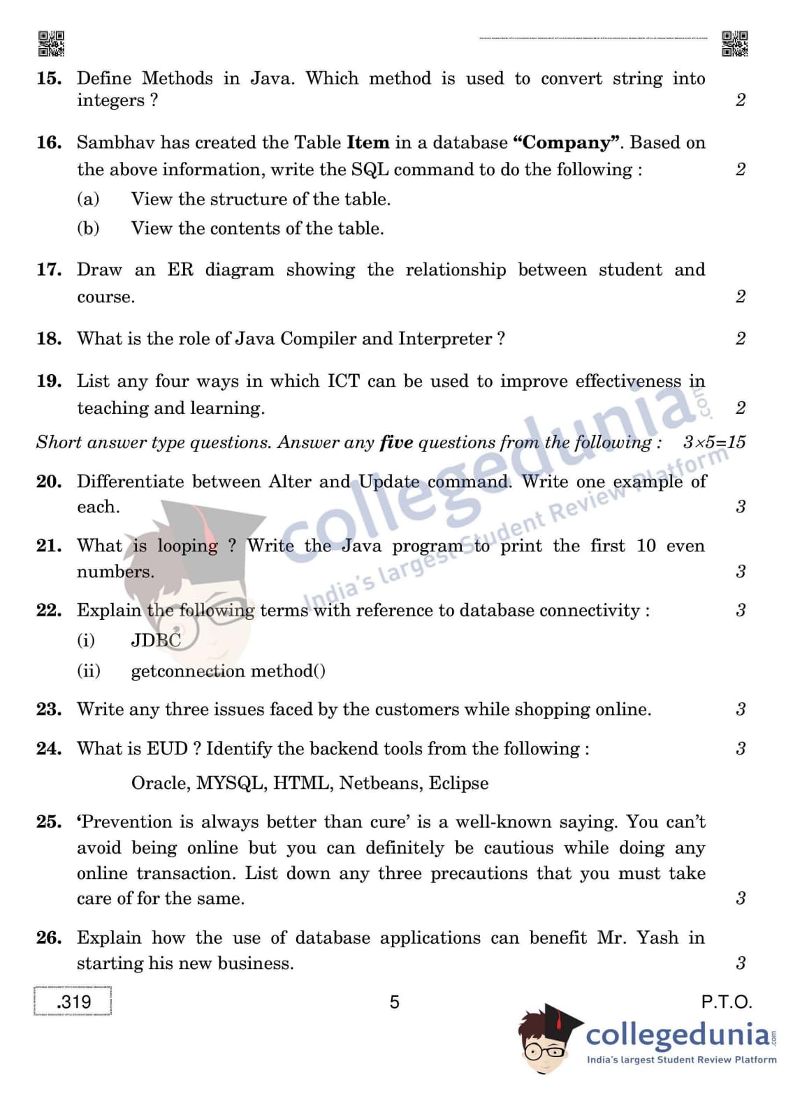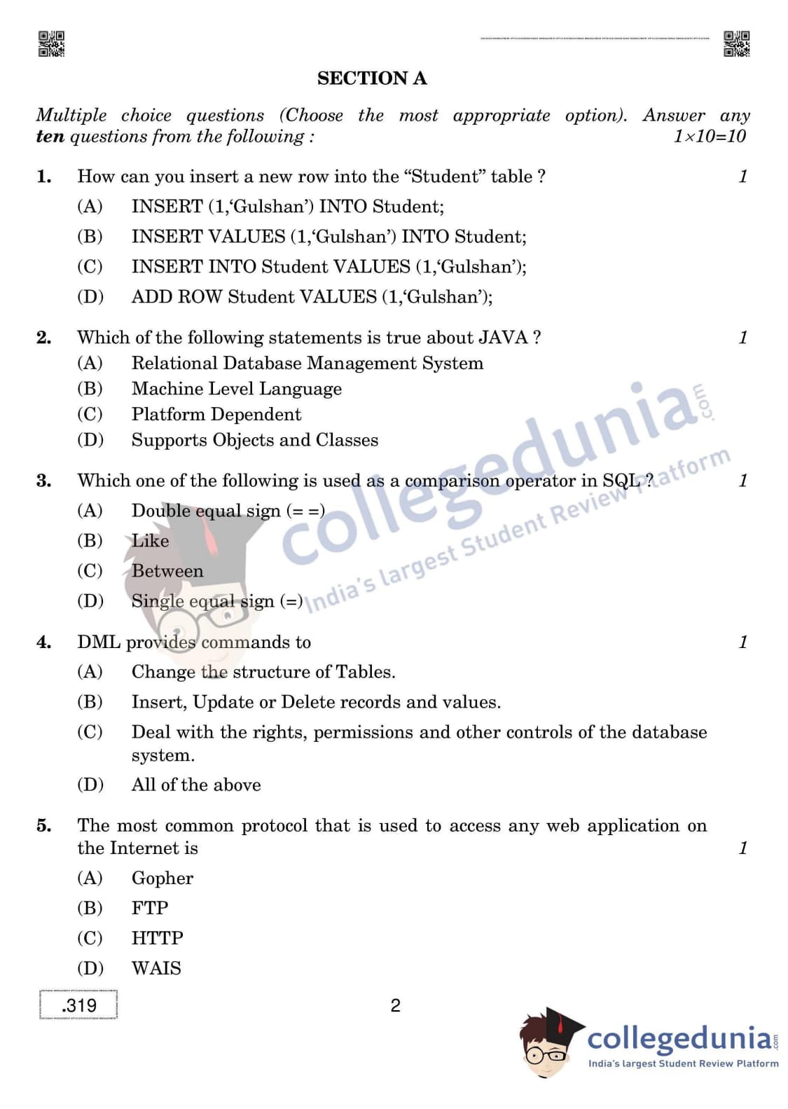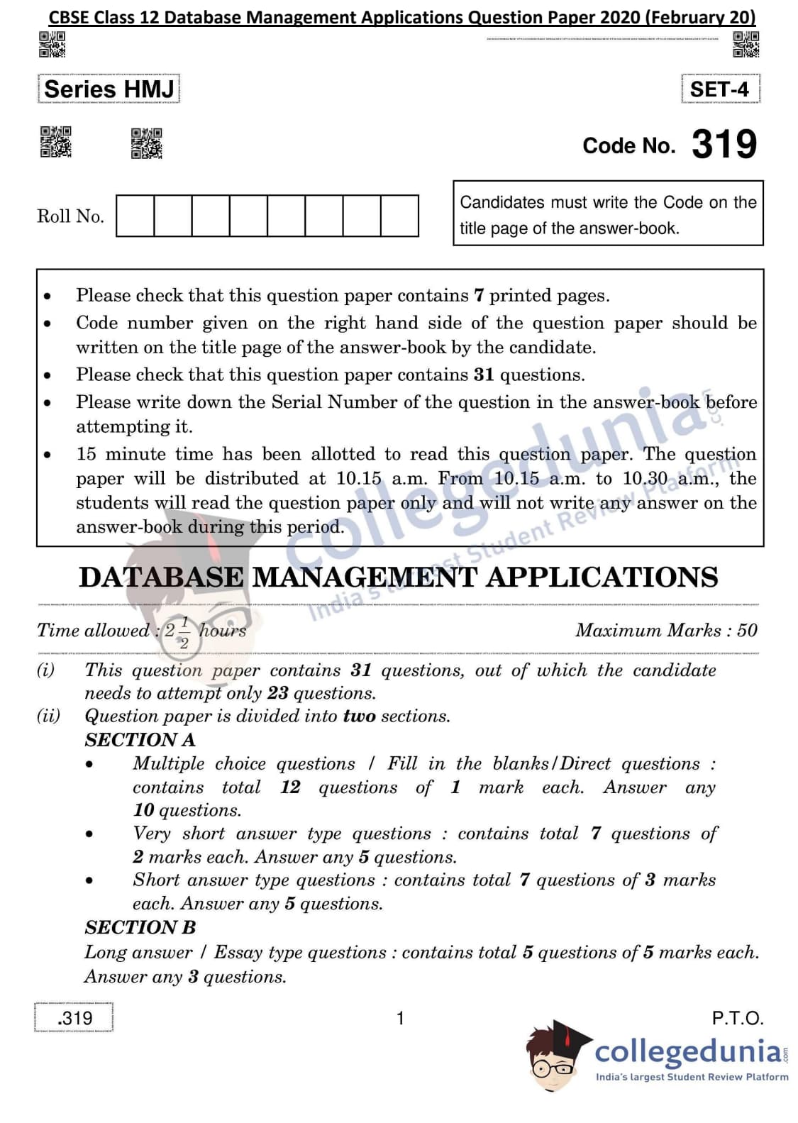 CBSE Class 12 Database Management Applications Question Paper 2020 with Answer Key Set 4 is available for download. The exam was conducted by the Central Board of Secondary Education on February 20, 2020 in the Morning Session 10:30 AM to 1:00 PM. The medium of paper was English & Hindi. The question paper comprised a total of 31 questions divided among 2 sections.