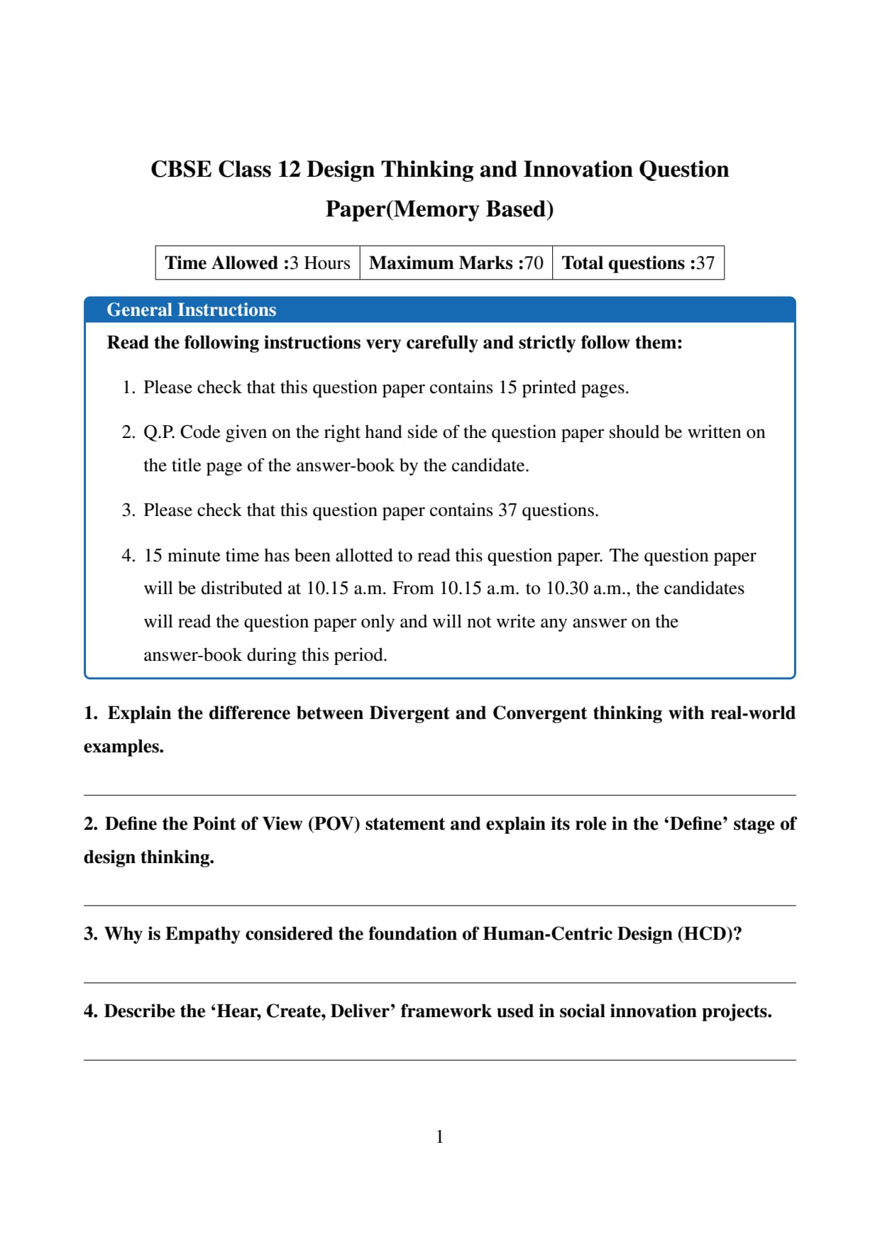The CBSE Class 12 Design Thinking and Innovation Question Paper 2026 is available for download here of CBSE Board Exam 2026. This CBSE 12th Design Thinking and Innovation solved question paper includes detailed solutions, answer key, and the latest CBSE marking scheme to help students understand the exam pattern and important topics.