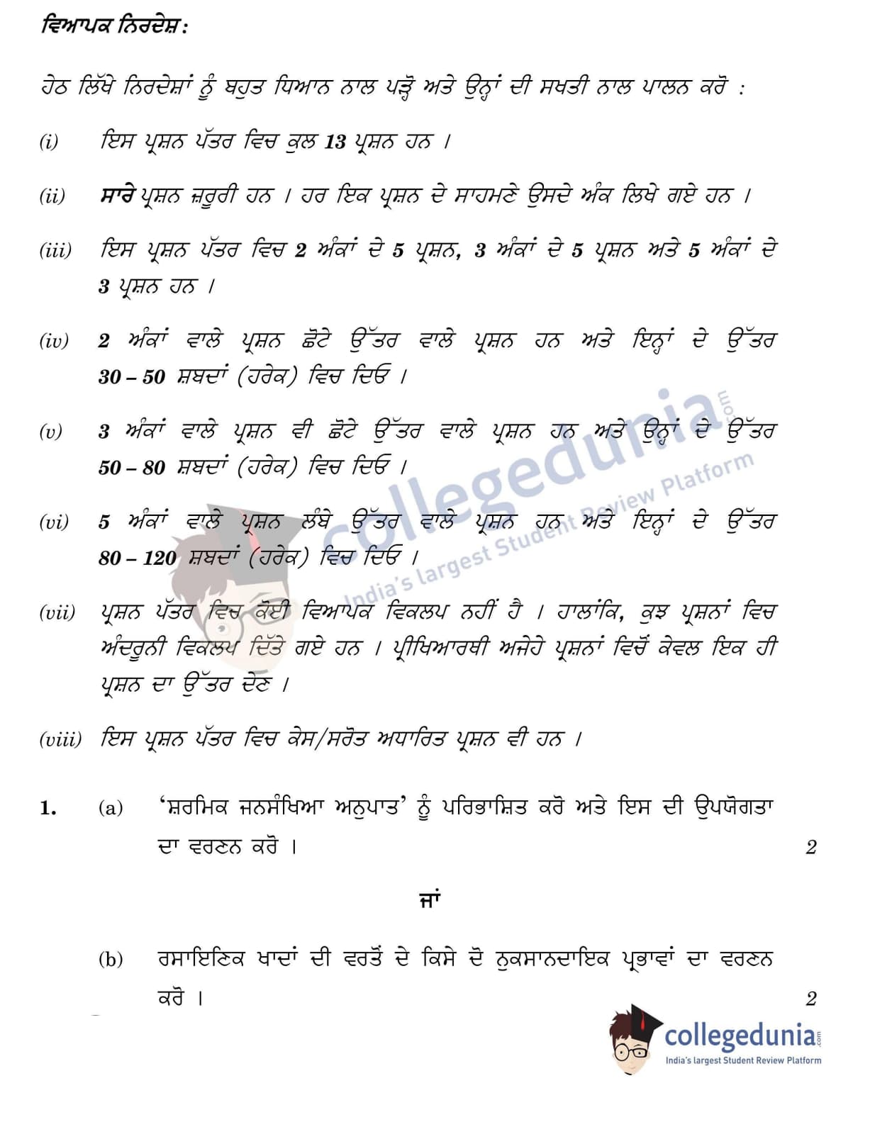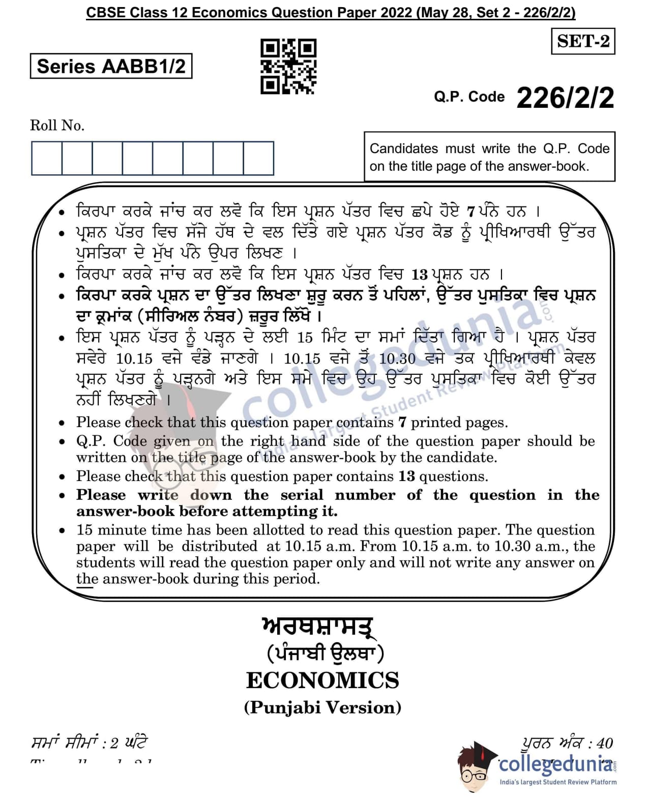 CBSE Class 12 2022 Economics Question Paper Set 2 - 226/2/2 with Answer Key pdf is available for download. The exam was conducted by Central Board of Secondary Education on May 28, 2022 in the Morning Session 10:30 AM to 12:30 PM. The medium of paper was Punjabi. In terms of difficulty level, CBSE Class 12 Economics paper was of Moderate level. The question paper comprised a total of 13 questions.