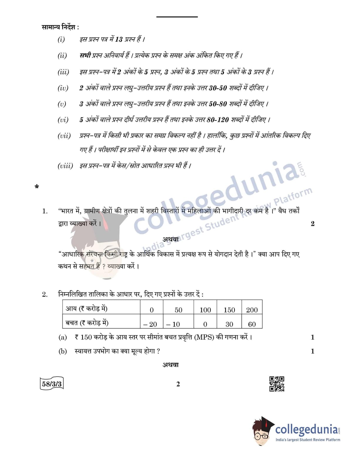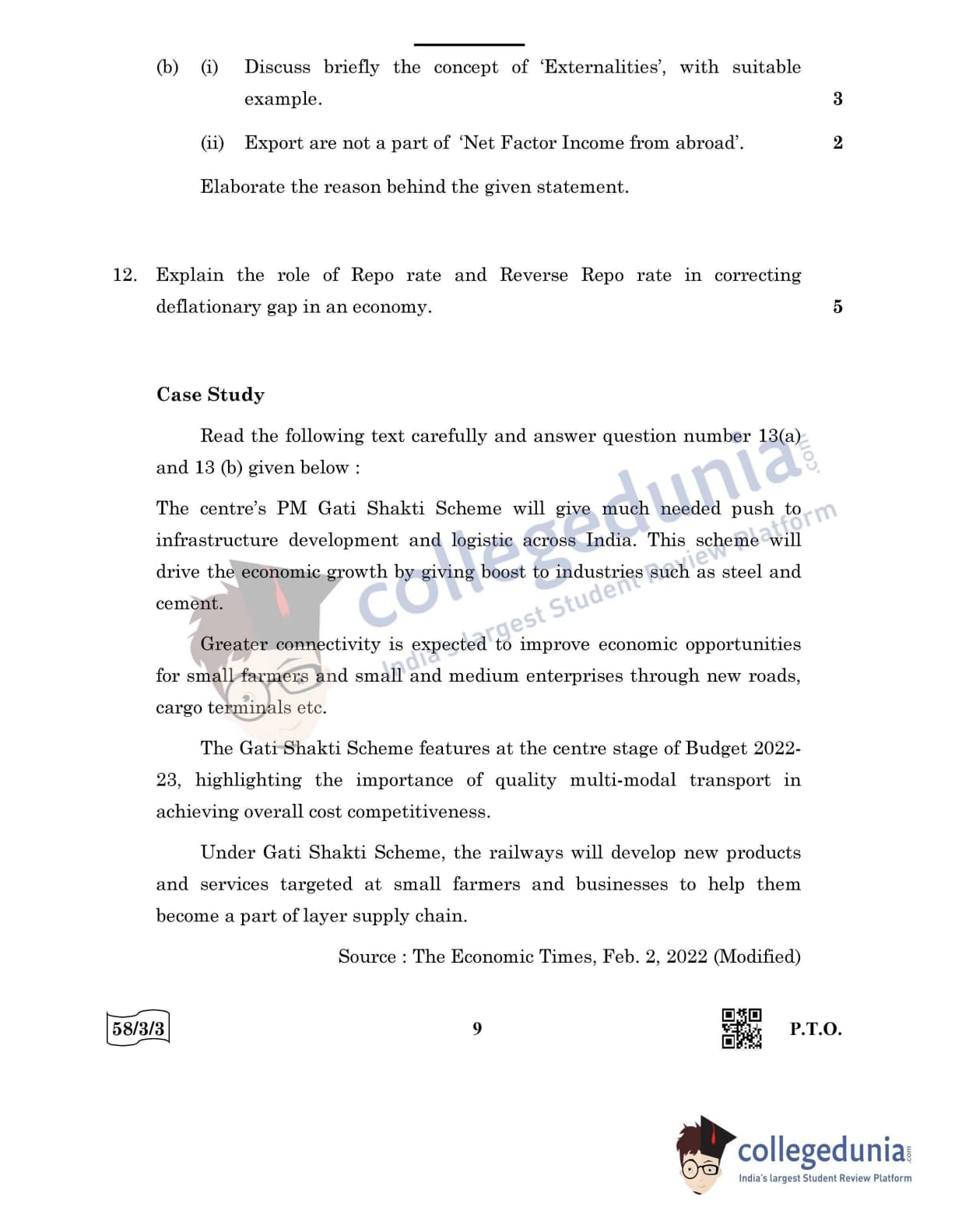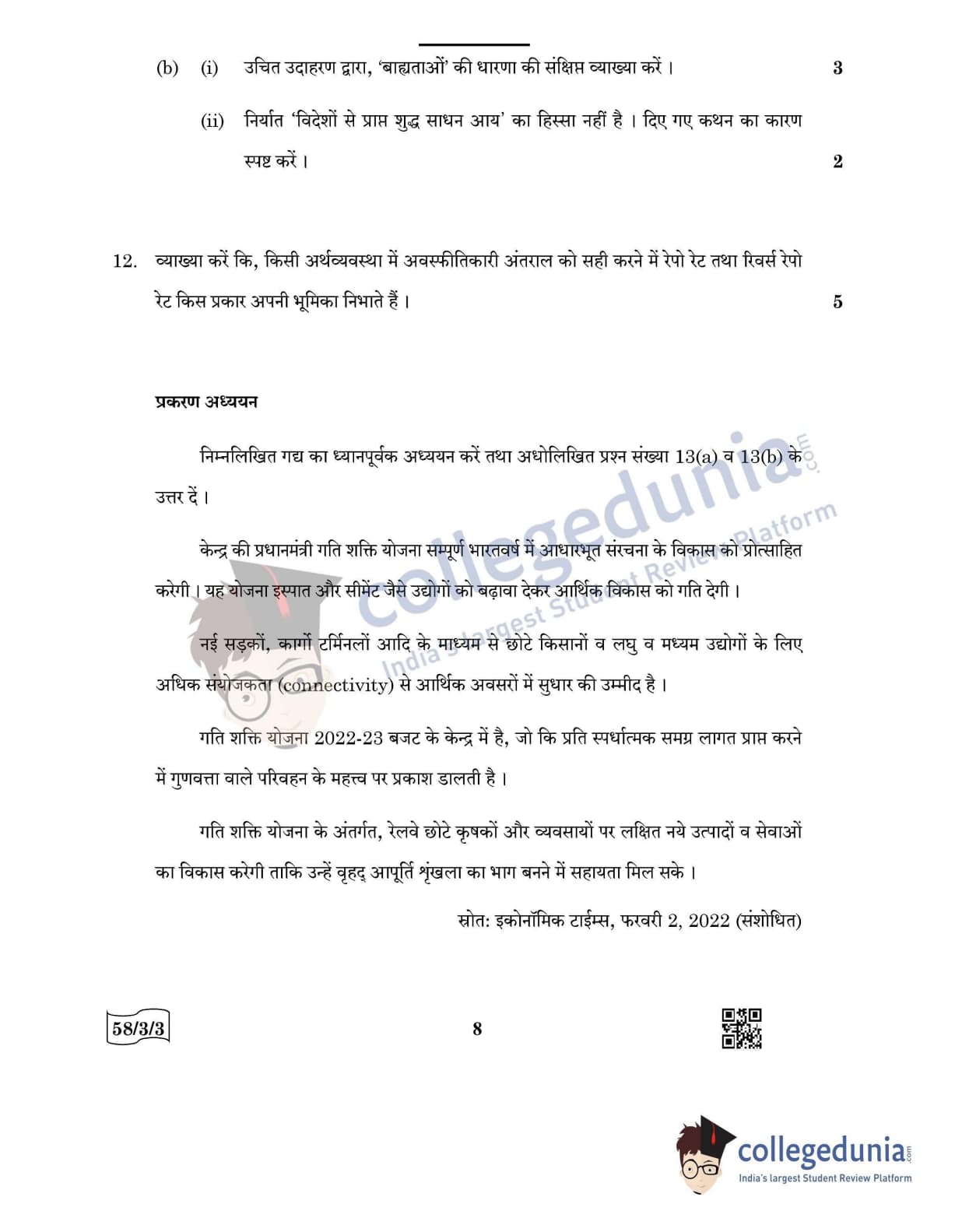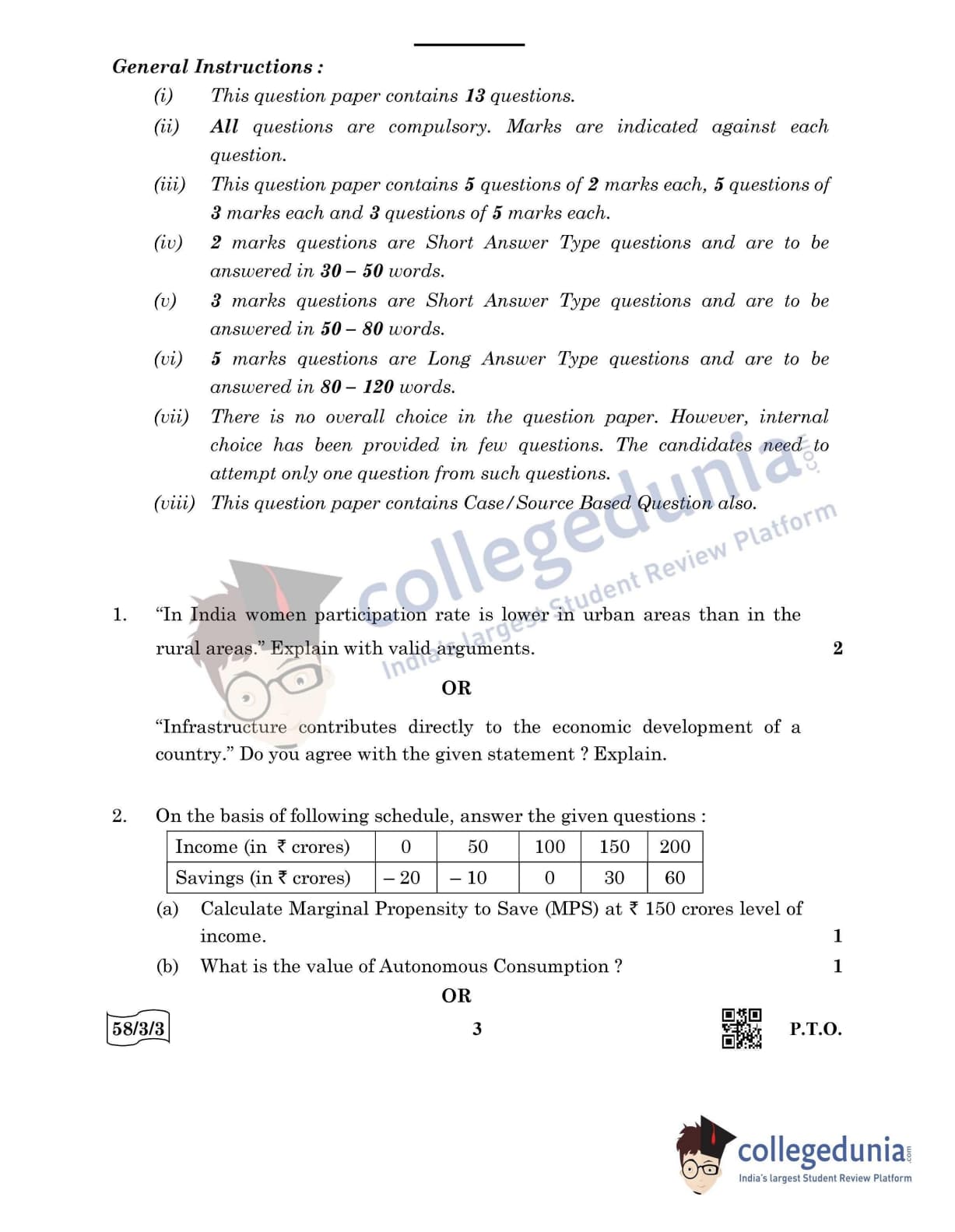 CBSE Class 12 Economics Question Paper 2022 with Answer Key (May 28, Set 3 - 58/3/3- Morning Session)