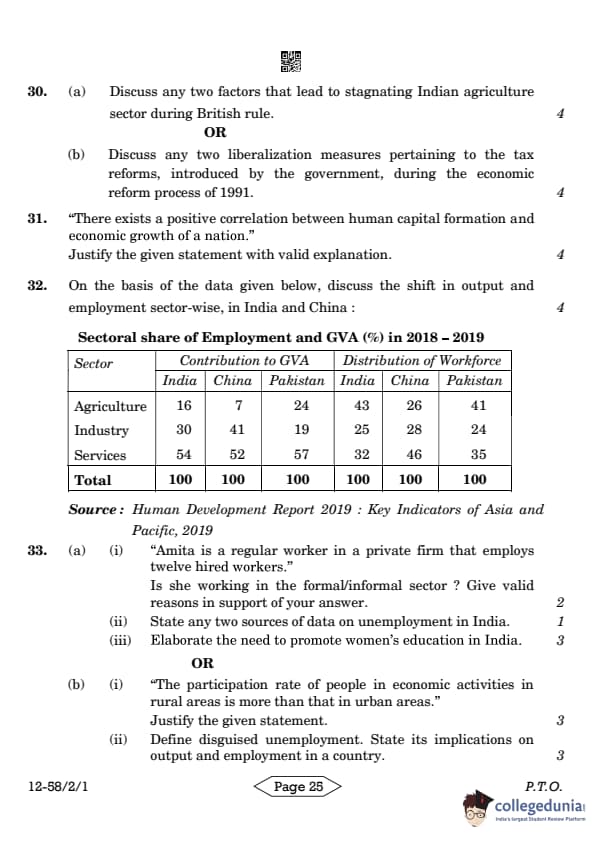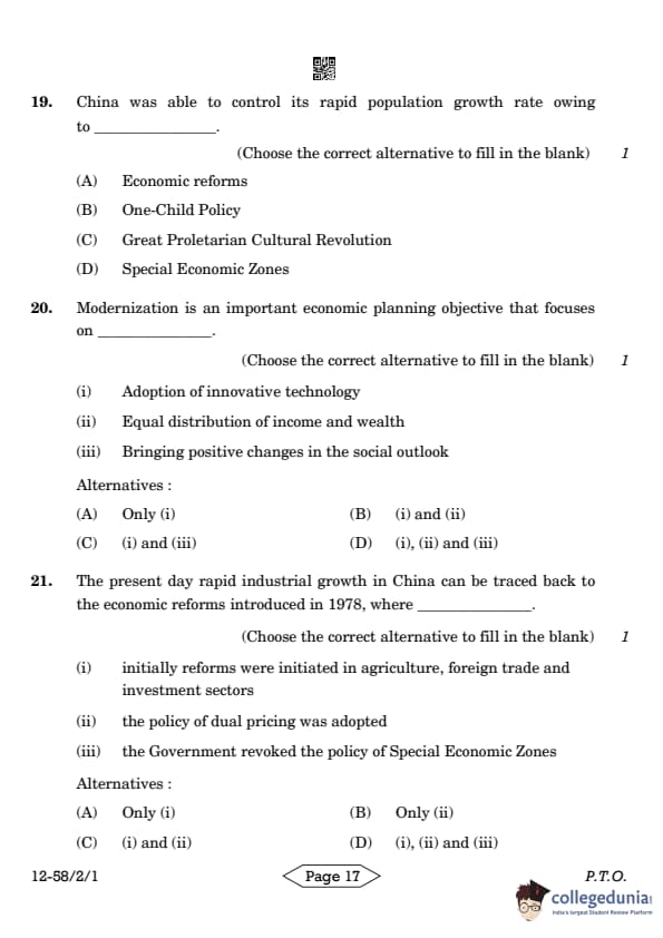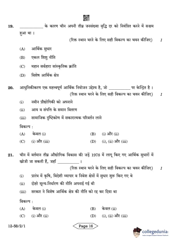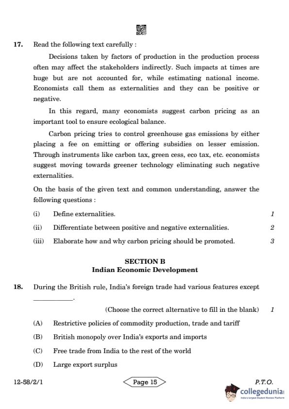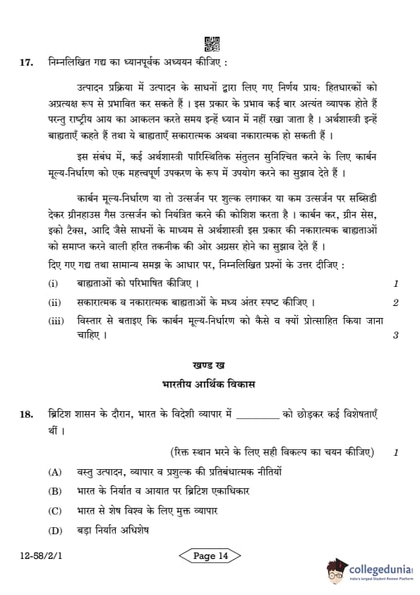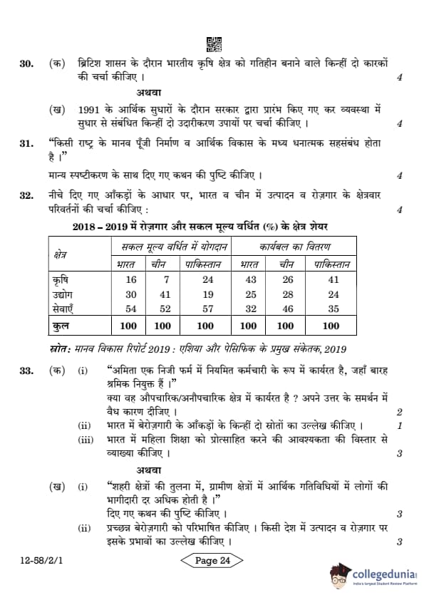 CBSE Class 12 Economics Question Paper 2024 (Set 1- 58/2/1) with Answer Key