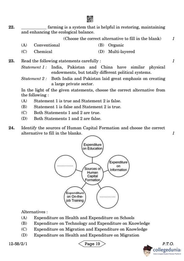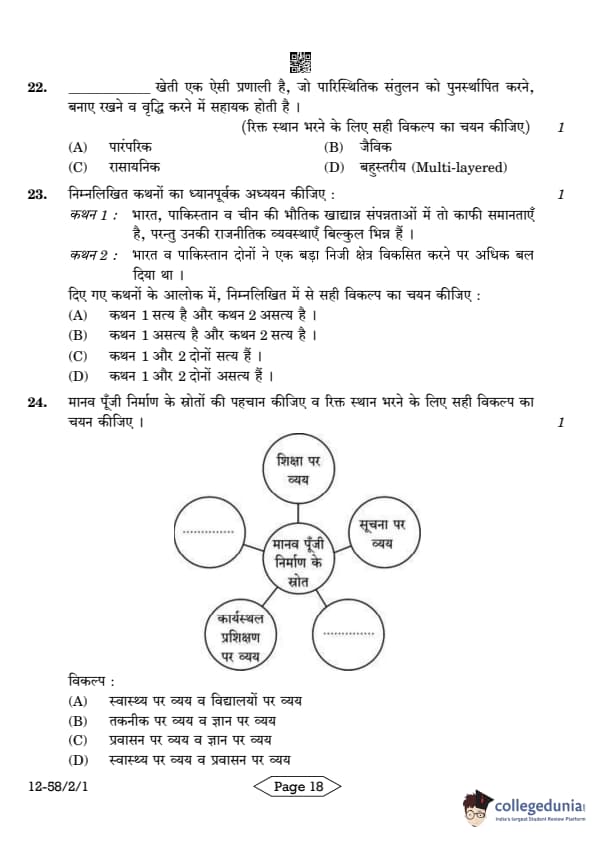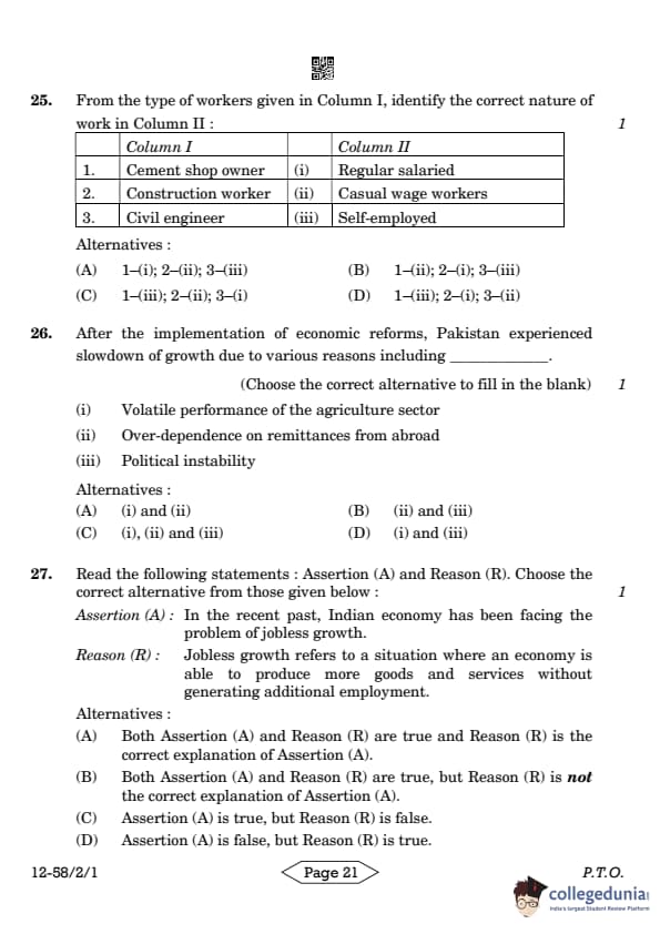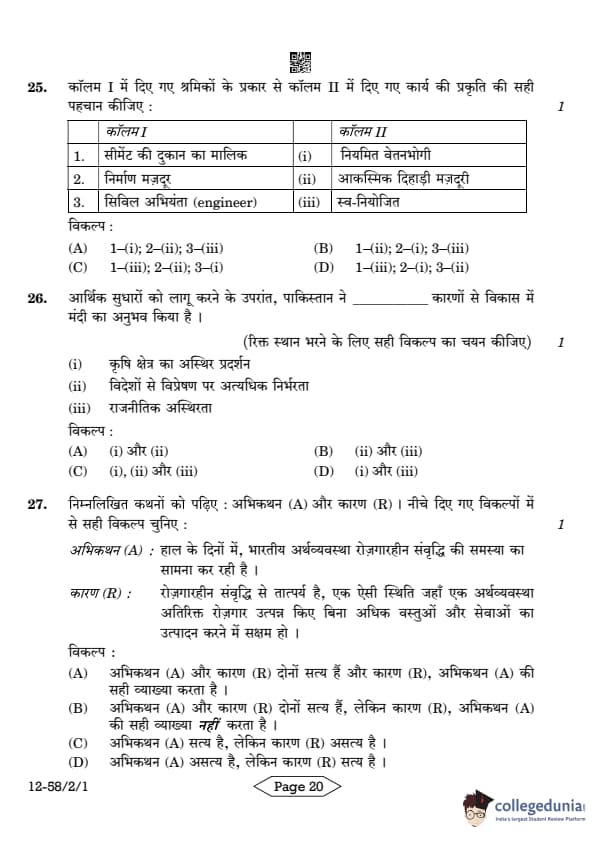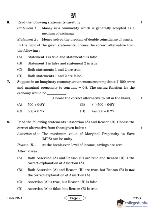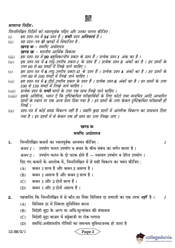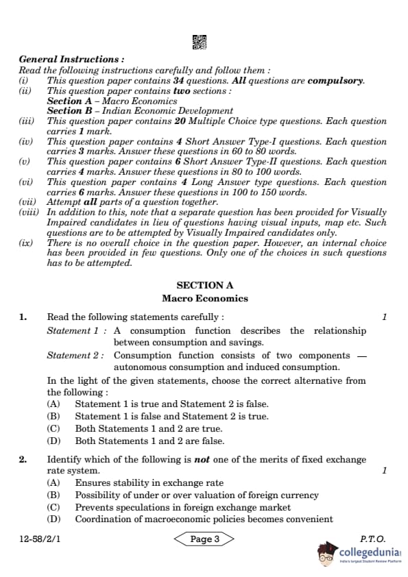CBSE Class 12 Economics Question Paper 2024 PDF (Set 1- 58/2/1) is available for download here. CBSE conducts the Economics exam on March 18, 2024 from 10:30 AM to 1:30 PM. The total marks for the theory paper are 80. The question paper contains 20% MCQ-based questions, 40% competency-based questions, and 40% short and long answer type questions. Candidates can use the link below to download the CBSE Class 12 Economics Set 1 Question Paper with detailed solutions.