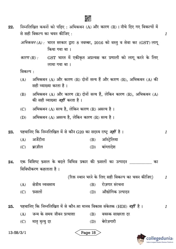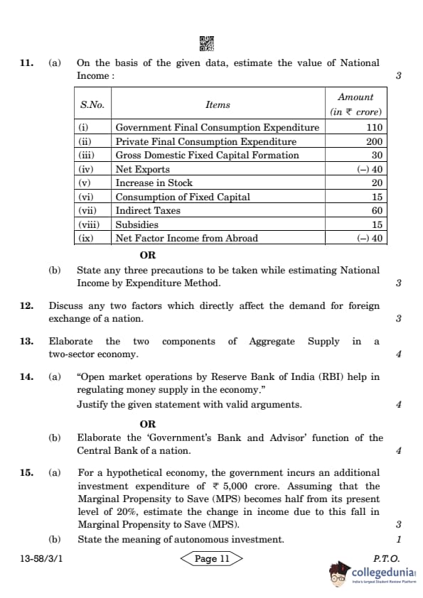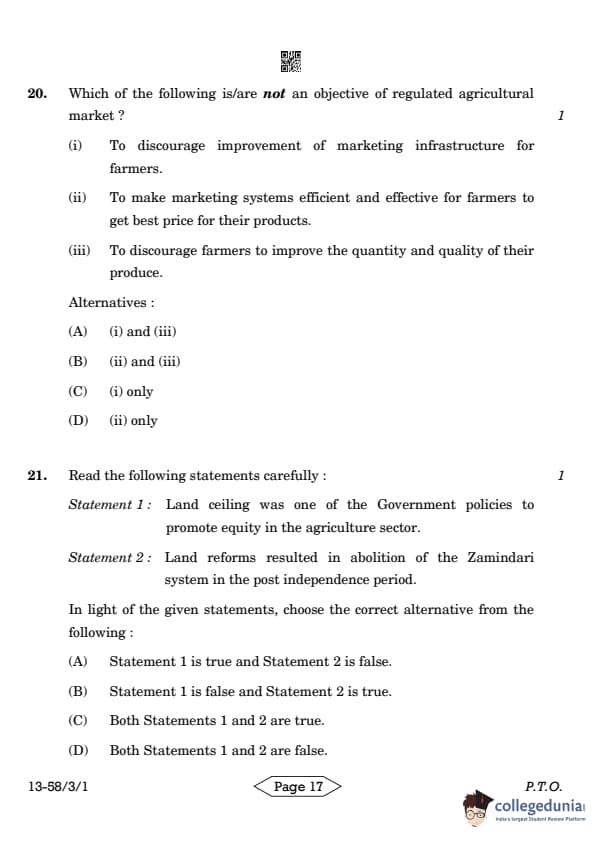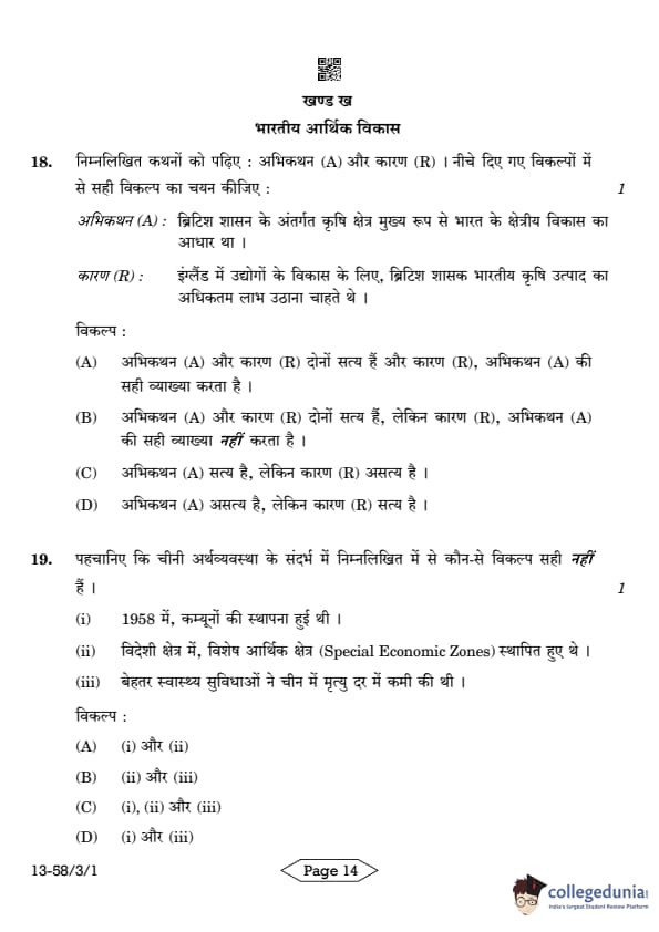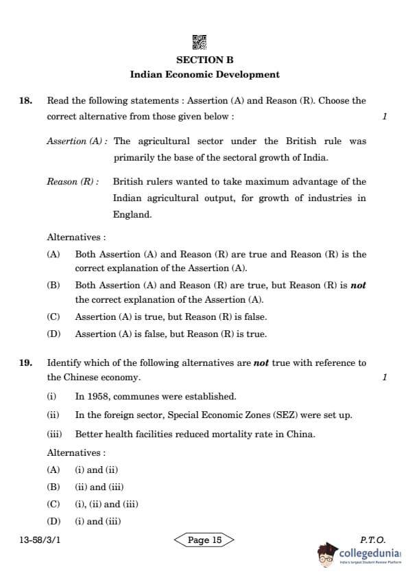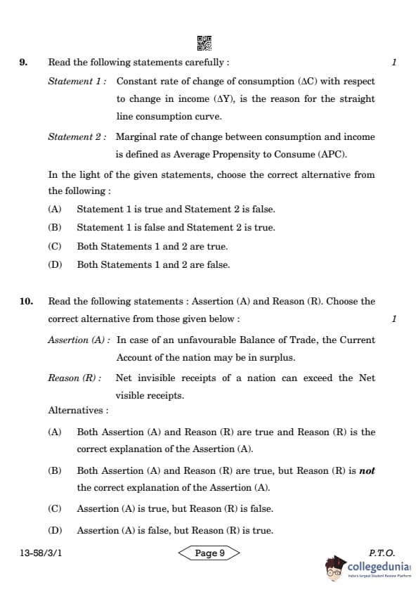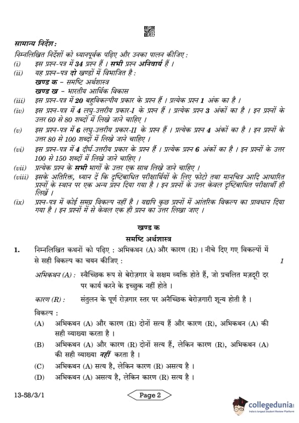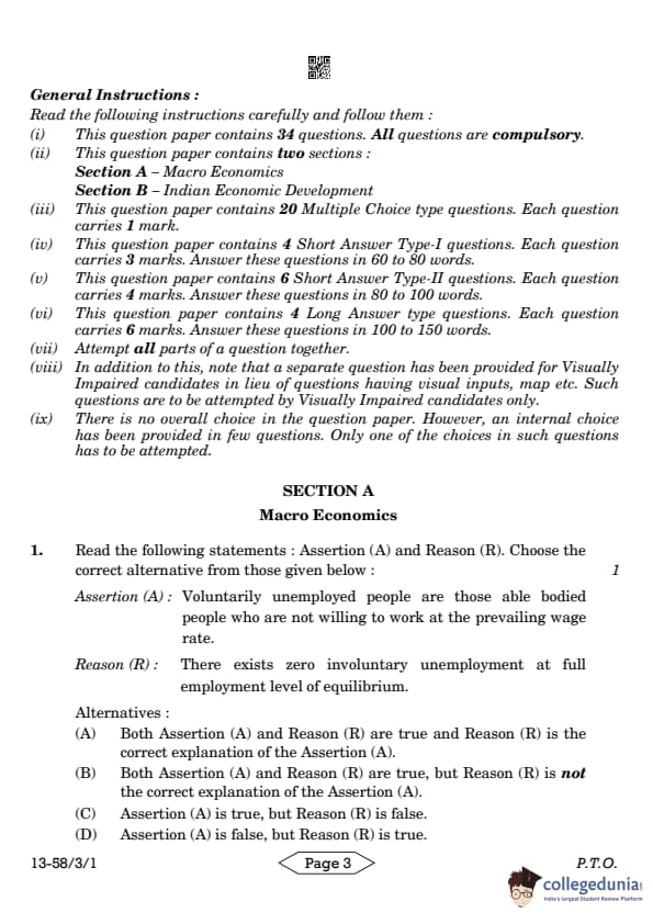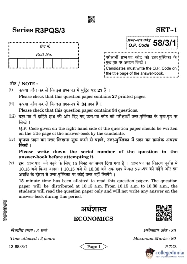 CBSE Class 12 Economics Question Paper 2024 PDF (Set 1- 58/3/1) is available for download here. CBSE conducted the Economics exam on March 18, 2024 from 10:30 AM to 1:30 PM. The total marks for the theory paper are 80. The question paper will contain 20% MCQ-based questions, 40% competency-based questions, and 40% short and long answer type questions. Candidates can use the link below to download the CBSE Class 12 Economics Set 1 Question Paper with detailed solutions.