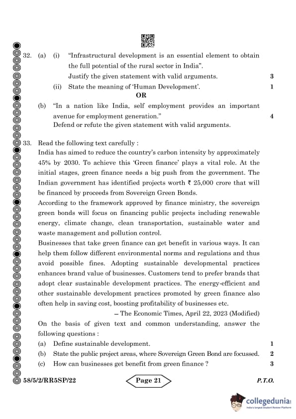 Read the following text carefully: India has aimed to reduce the country's carbon intensity by approximately 45 percent by 2030. To achieve this ‘Green finance' plays a vital role. At the initial stages, green finance needs a big push from the government. The Indian government has identified projects worth Rs. 25,000 crore that will be financed by proceeds from Sovereign Green Bonds. According to the framework approved by finance ministry, the sovereign green bonds will focus on financing public projects including renewable energy, climate change, clean transportation, sustainable water and waste management and pollution control. Businesses that take green finance can get benefit in various ways. It can help them follow different environmental norms and regulations and thus avoid possible fines. Adopting sustainable developmental practices enhances brand value of businesses. Customers tend to prefer brands that adopt clear sustainable development practices. The energy-efficient and other sustainable development practices promoted by green finance also often help in saving cost, boosting profitability of businesses etc. -The Economic Times, April 22, 2023 (Modified) On the basis of given text and common understanding, answer the following questions: (a) Define sustainable development. (b) State the public project areas where Sovereign Green Bonds are focused. (c) How can businesses benefit from green finance?