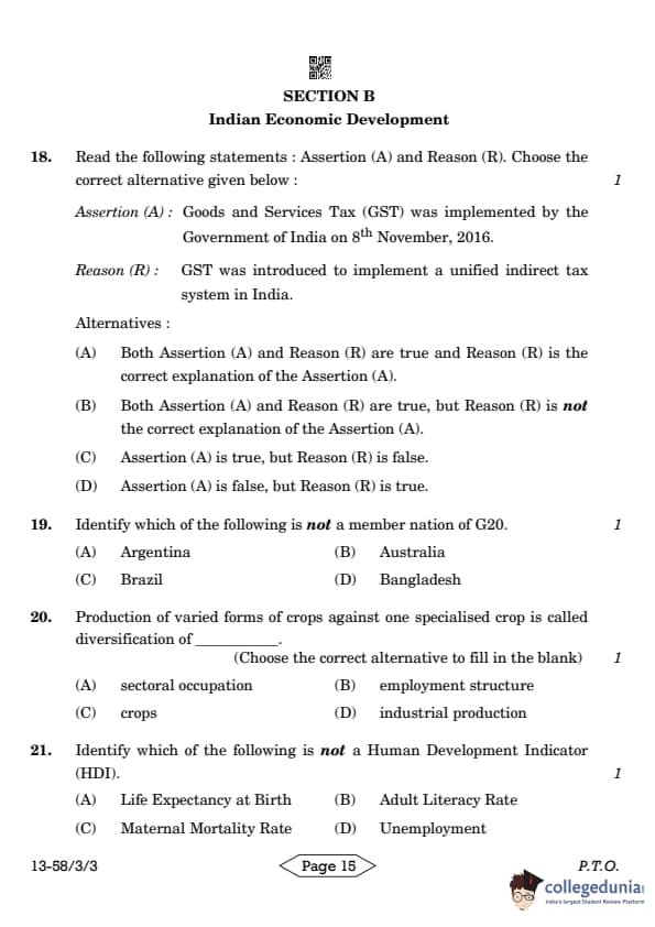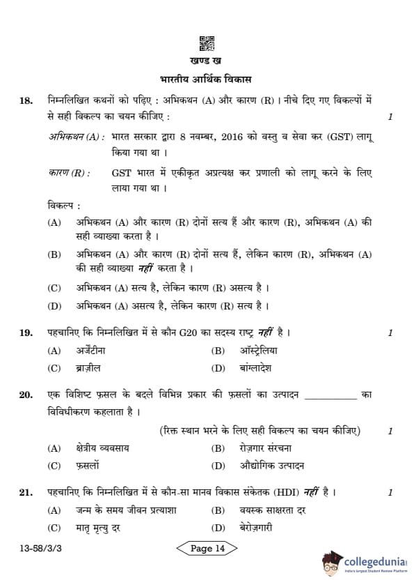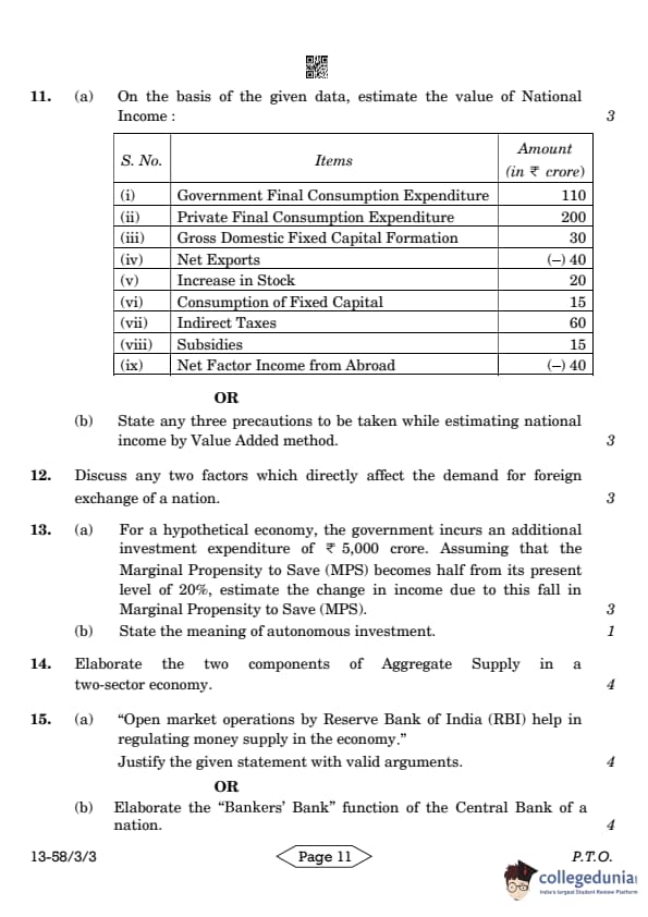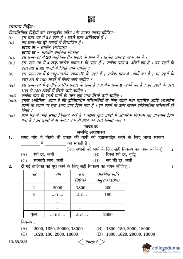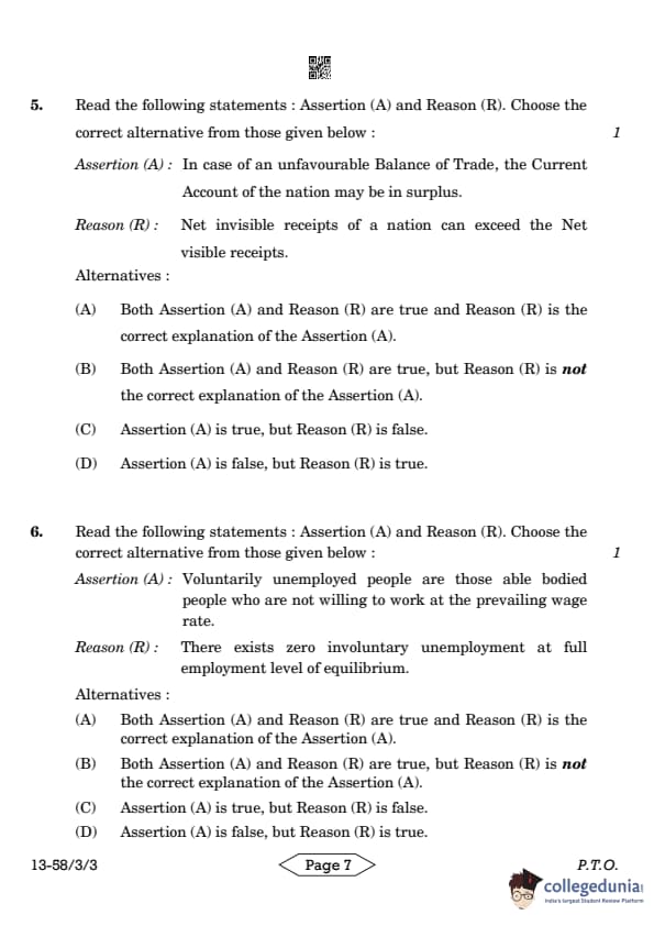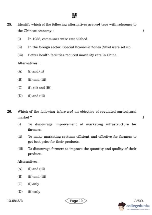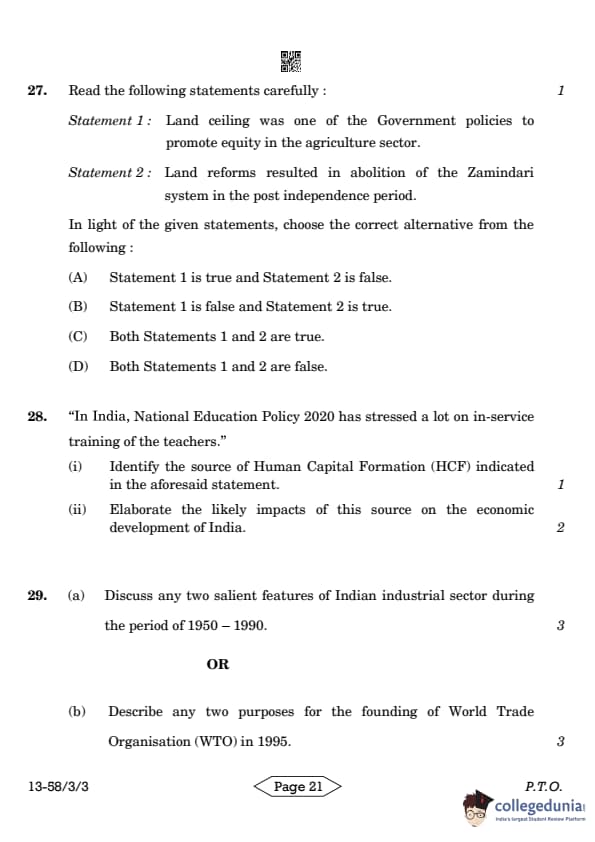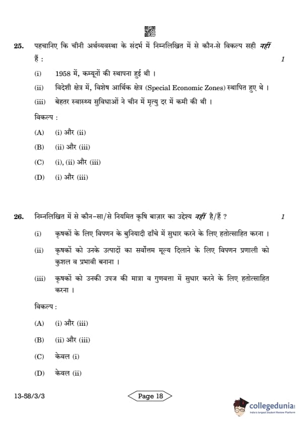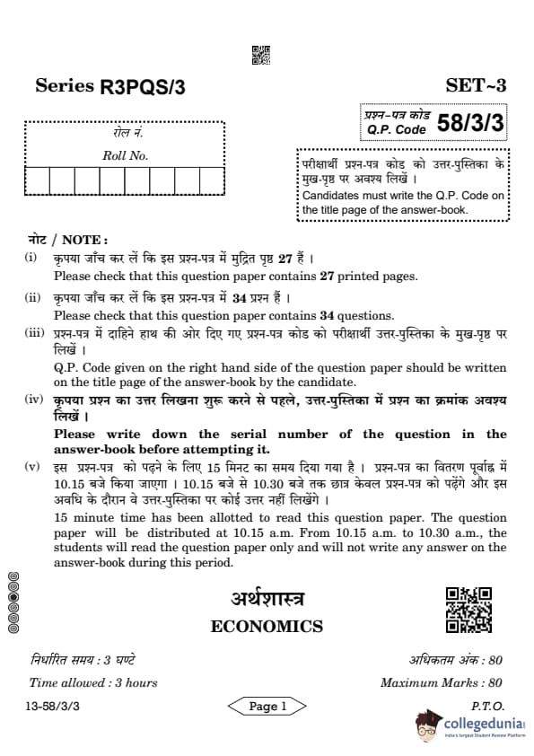 CBSE Class 12 Economics Question Paper 2024 PDF (Set 3- 58/3/3) is available for download here. CBSE conducted the Economics exam on March 18, 2024 from 10:30 AM to 1:30 PM. The total marks for the theory paper are 80. The question paper contains 20% MCQ-based questions, 40% competency-based questions, and 40% short and long answer type questions. Candidates can use the link below to download the CBSE Class 12 Economics Set 3 Question Paper with detailed solutions.