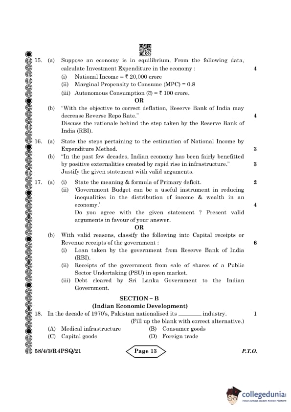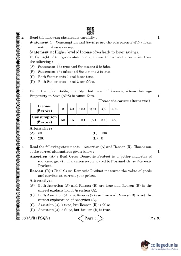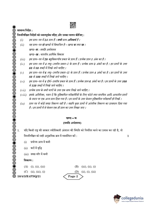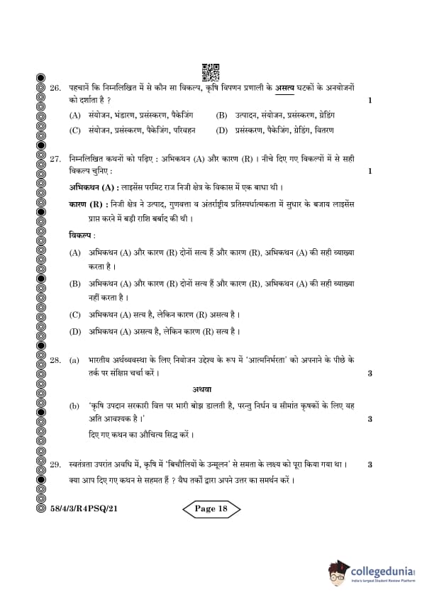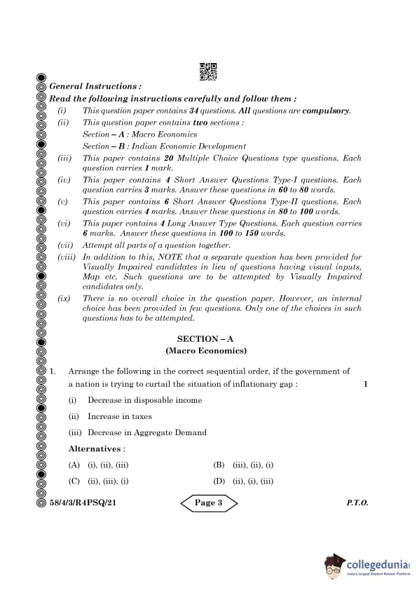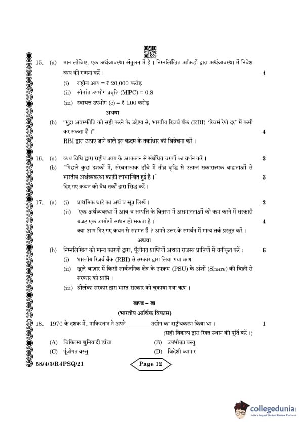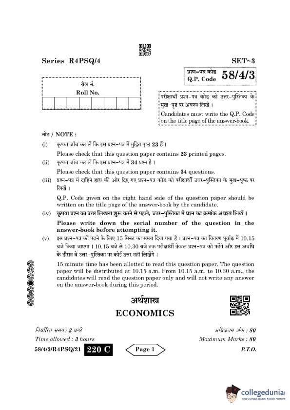 CBSE Class 12 Economics Question Paper 2024 PDF (Set 3- 58/4/3) is available for download here. CBSE conducted the Economics exam on March 18, 2024 from 10:30 AM to 1:30 PM. The total marks for the theory paper are 80. The question paper contains 20% MCQ-based questions, 40% competency-based questions, and 40% short and long answer type questions. Candidates can use the link below to download the CBSE Class 12 Economics Set 3 Question Paper with detailed solutions.