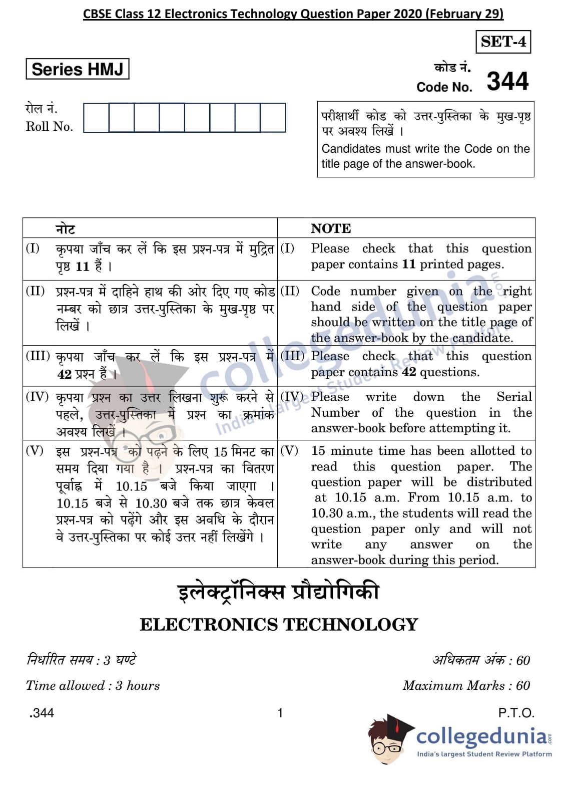 CBSE Class 12 Electronics Technology Question Paper 2020 with Answer Key Set 4 is available for download. The exam was conducted by the Central Board of Secondary Education on February 29, 2020 in the Morning Session 10:30 AM to 1:30 PM. The medium of paper was English & Hindi. The question paper comprised a total of 42 questions divided among 2 sections.