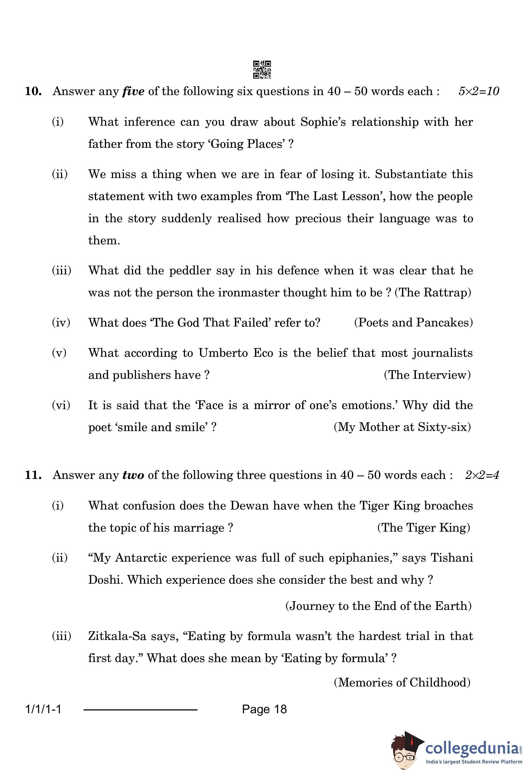 CBSE Class 12 English Question Paper 2024 Set 1 (Code - 1/1/1) with Answer Key