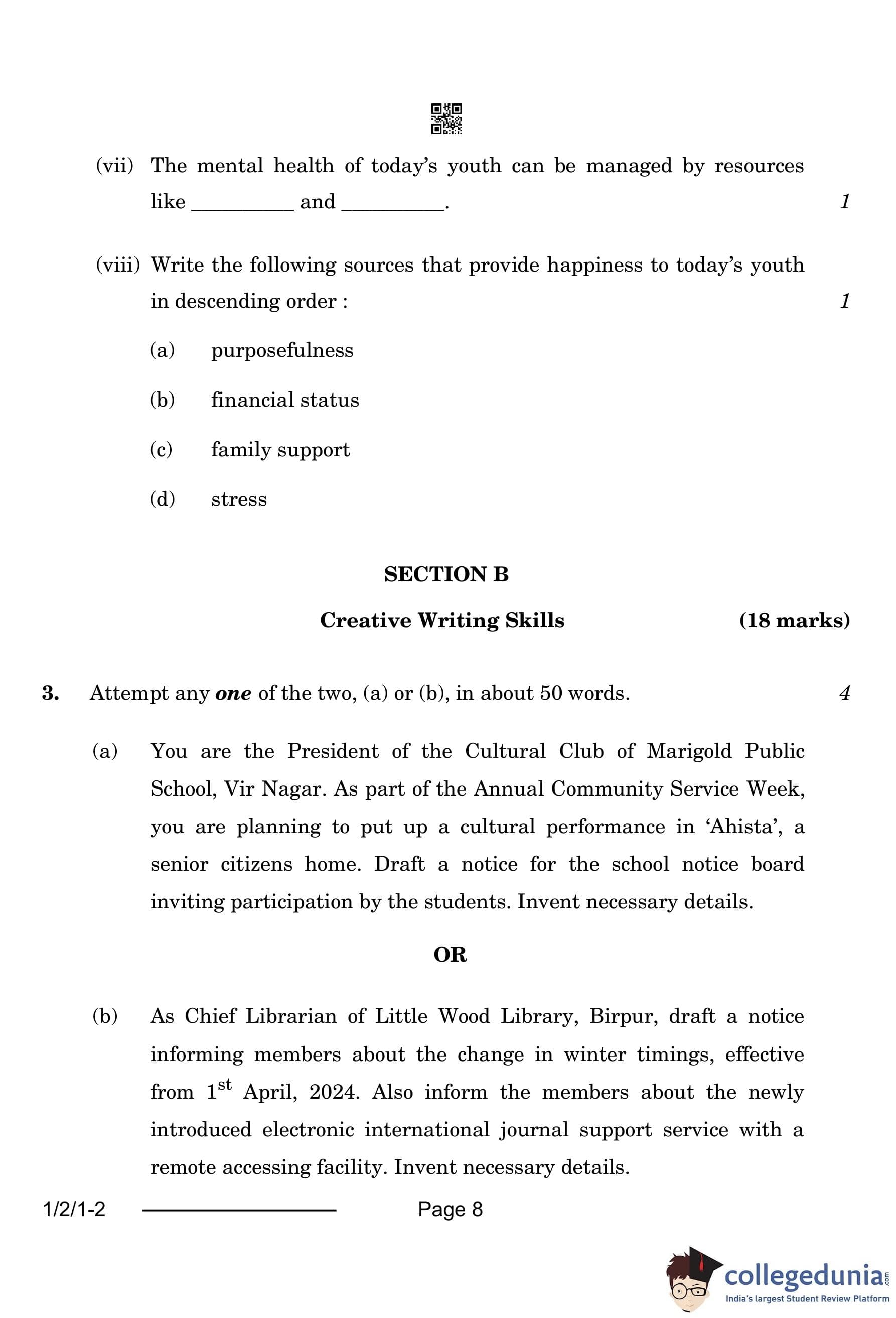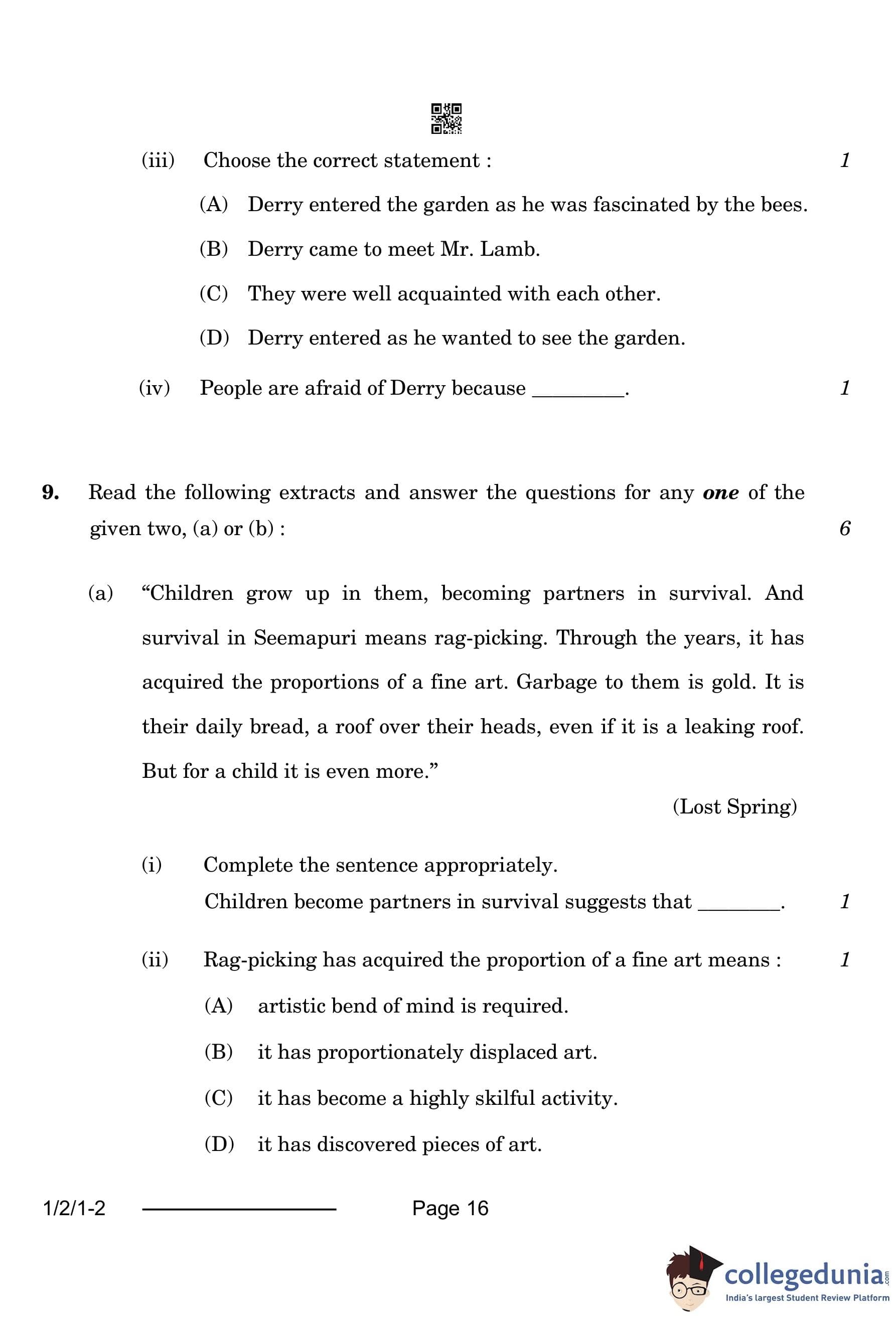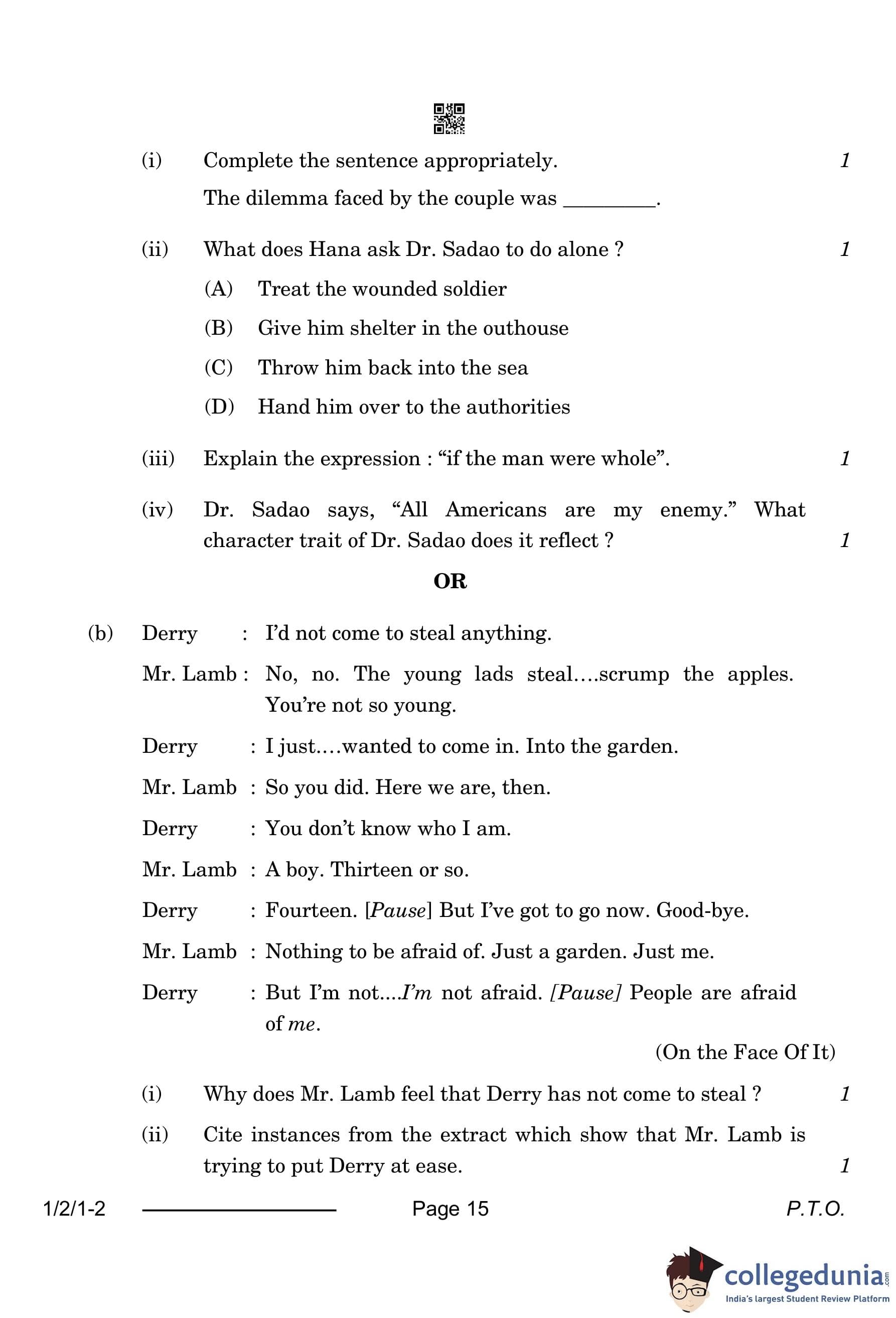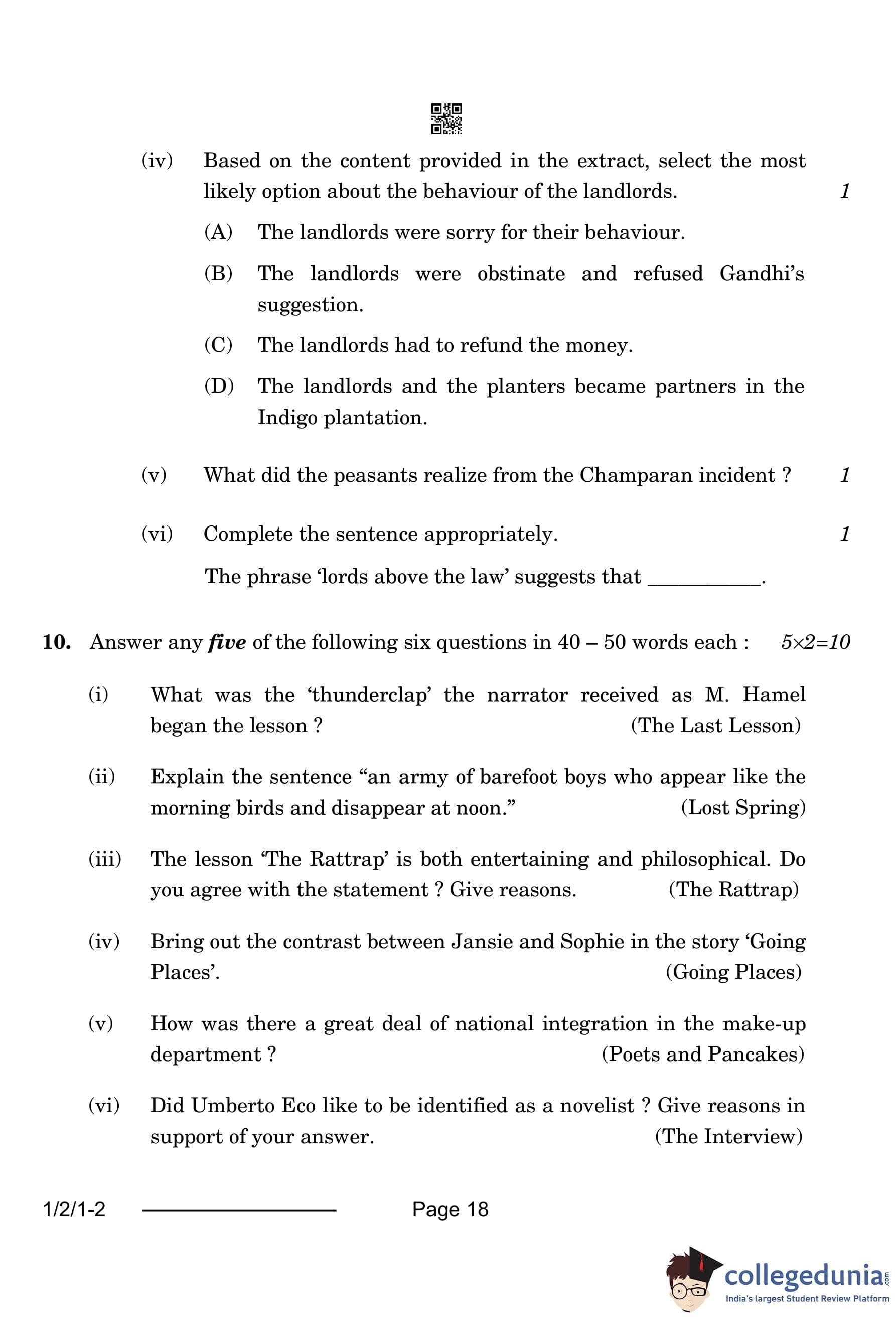 CBSE Class 12 English Question Paper 2024 (Set 1 - 1/2/1) with Answer Key