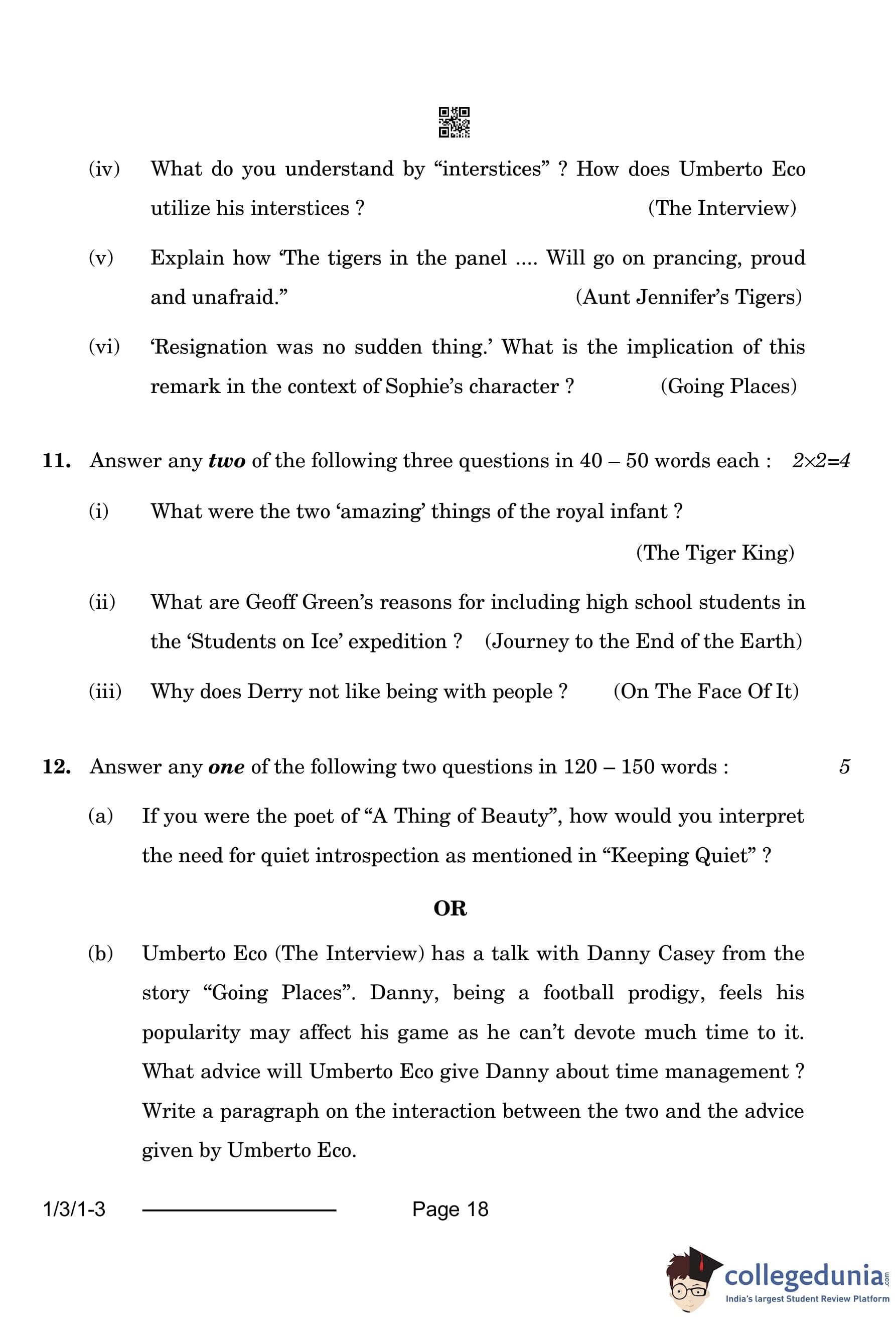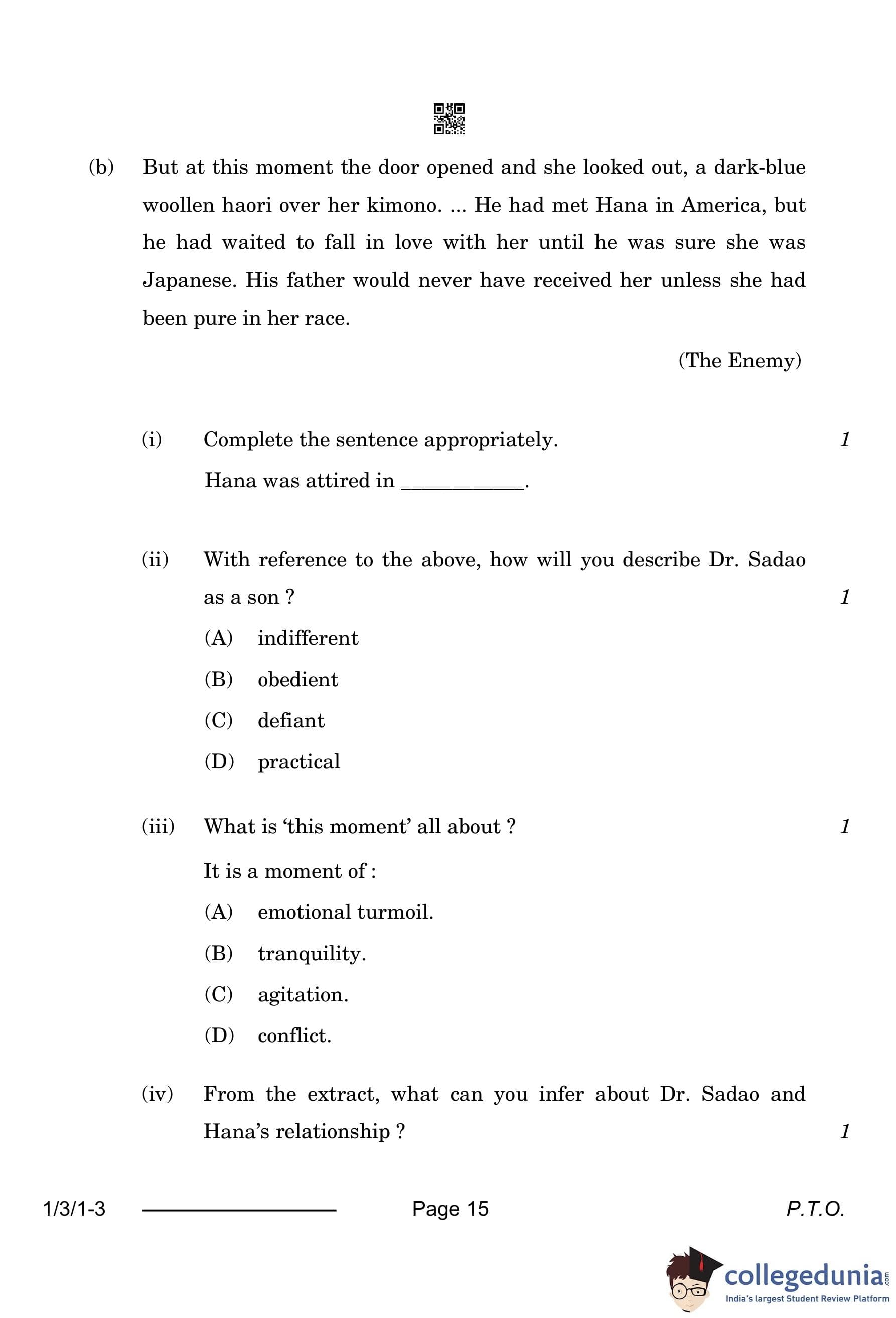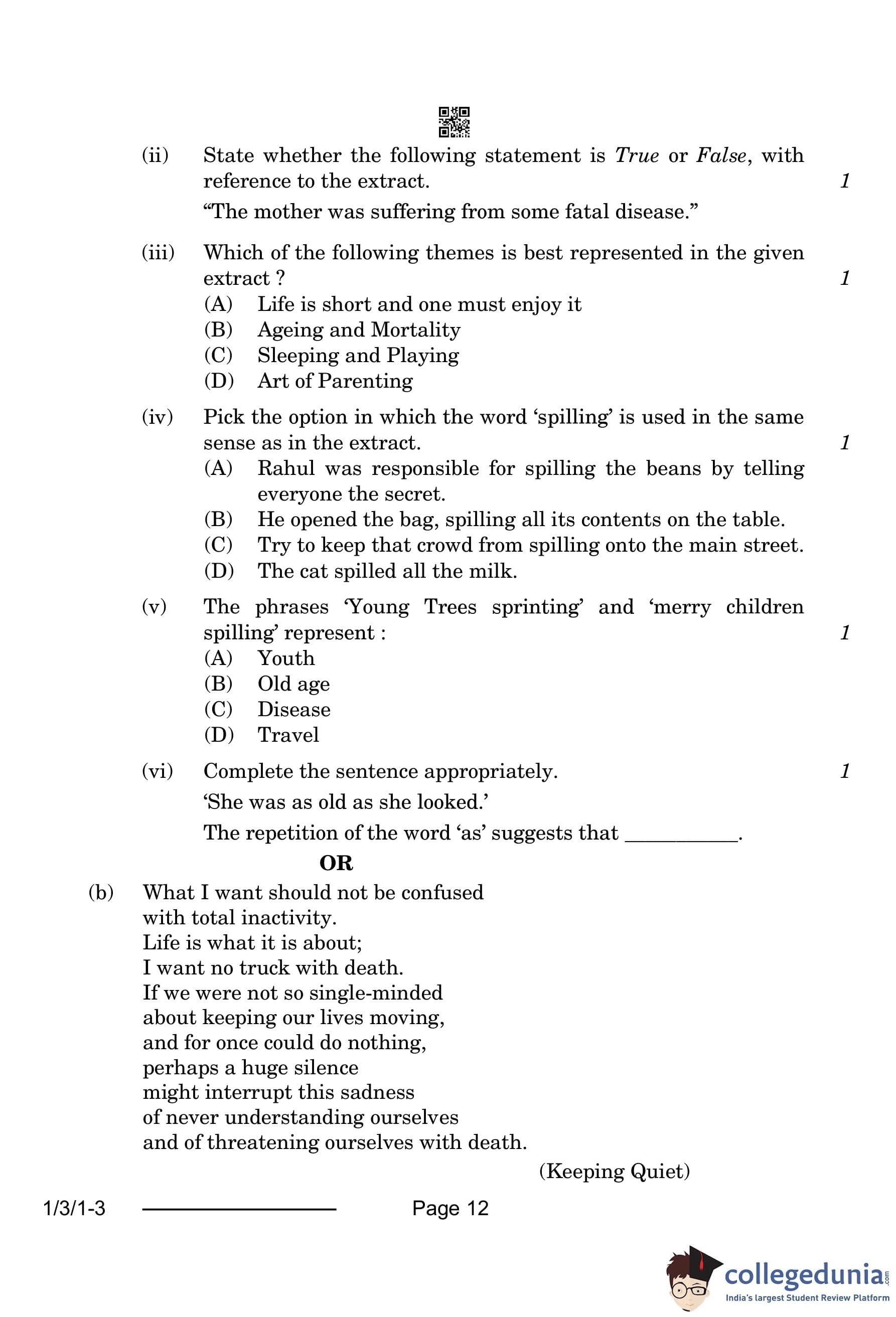 CBSE Class 12 English Question Paper 2024 (Set 1 - 1/3/1) with Answer Key