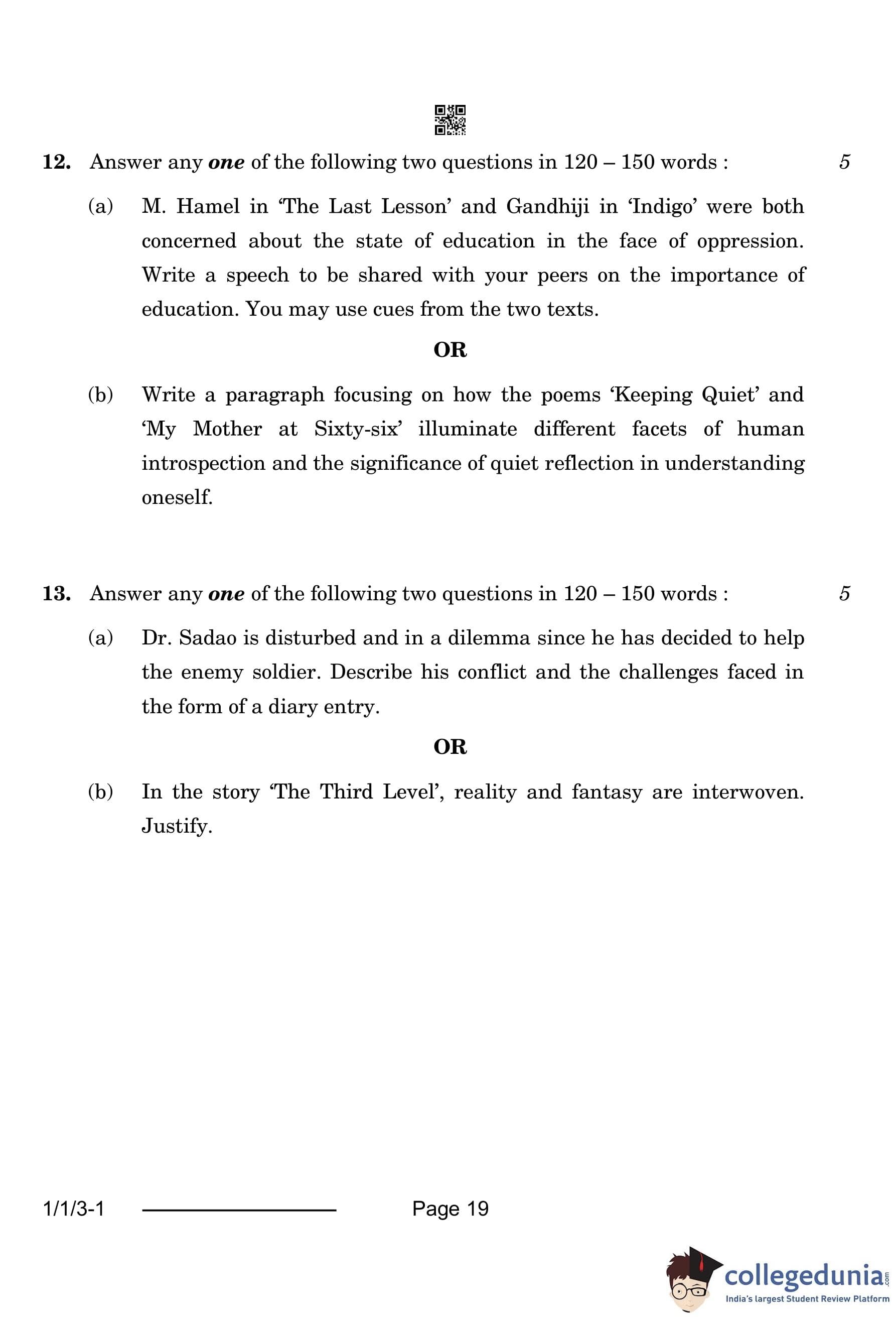 CBSE Class 12 English Question Paper 2024 (Set 3 - 1/1/3) with Answer Key