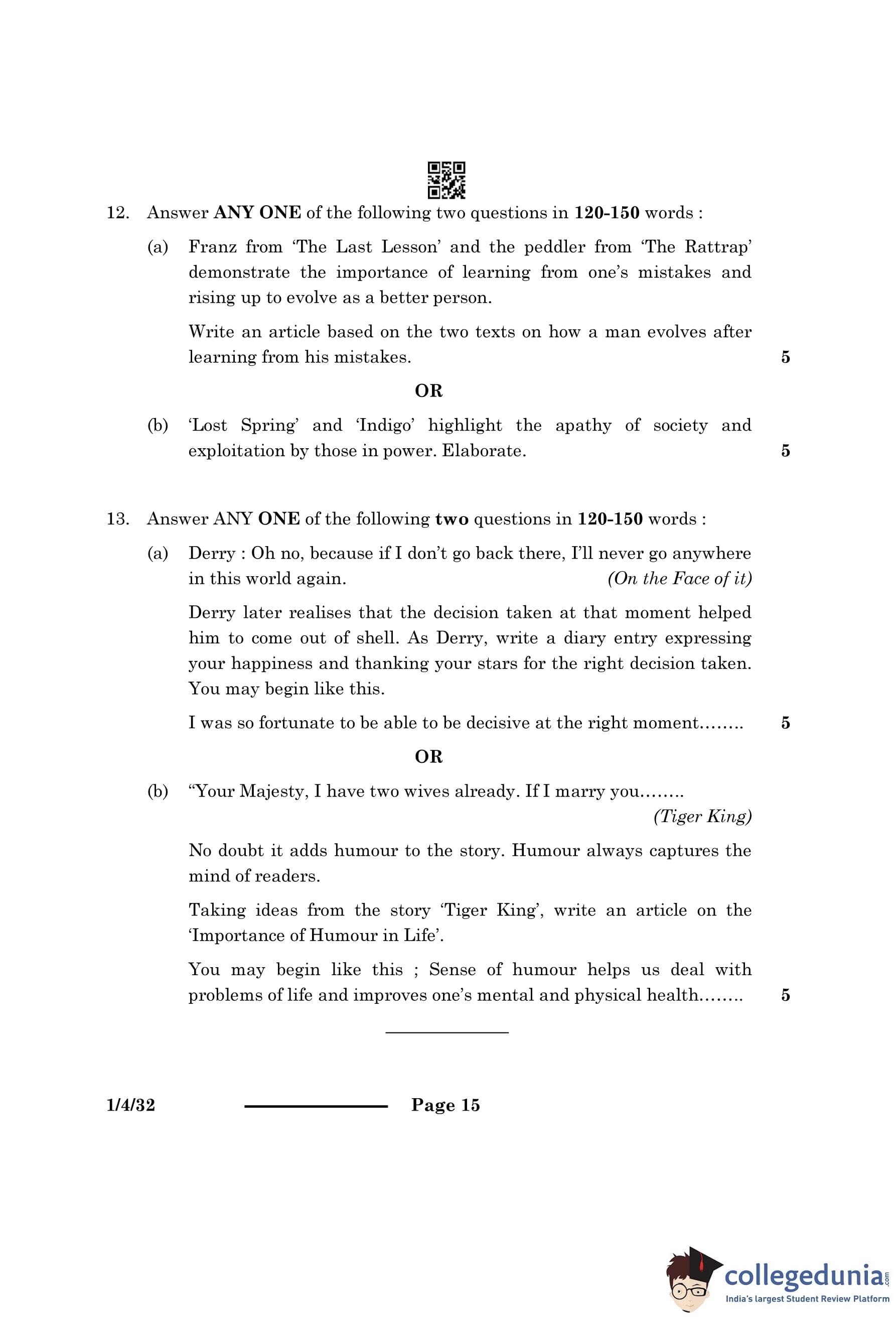 CBSE Class 12 English Question Paper 2024 (Set 3 - 1/4/3) with Answer Key