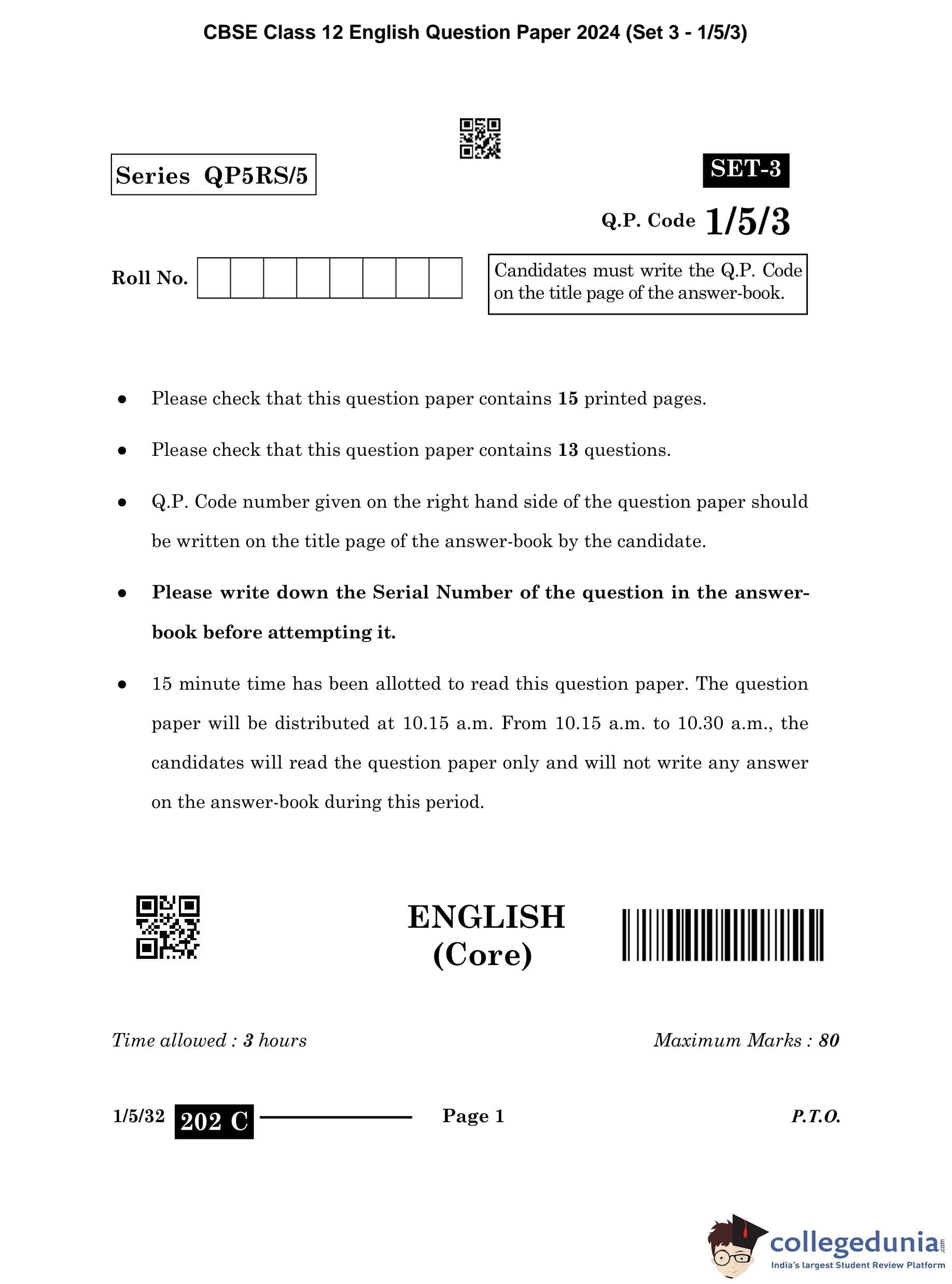 CBSE Class 12 English Question Paper 2024 PDF (Set 3 - 1/5/3) is available for download here. CBSE conducted the English exam on February 22, 2024, from 10:30 AM to 1:30 PM. The total marks for the theory paper are 80. The question paper contains 20% MCQ-based questions, 40% competency-based questions, and 40% short and long answer type questions.