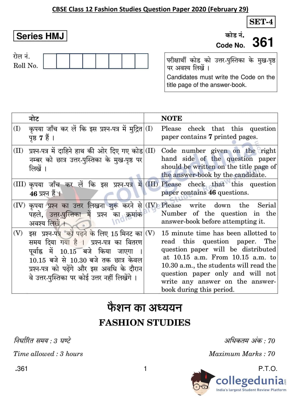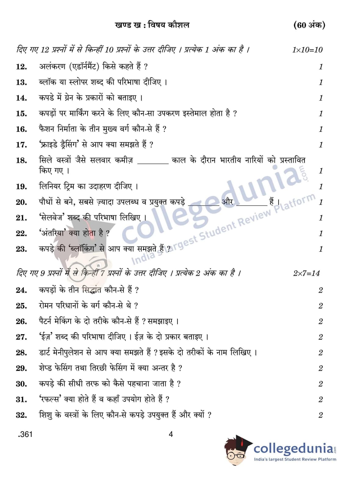CBSE Class 12 Fashion Studies Question Paper 2020 with Answer Key Set 4 is available for download. The exam was conducted by the Central Board of Secondary Education on February 29, 2020 in the Morning Session 10:30 AM to 1:30 PM. The medium of paper was English & Hindi. The question paper comprised a total of 46 questions divided among 2 sections.