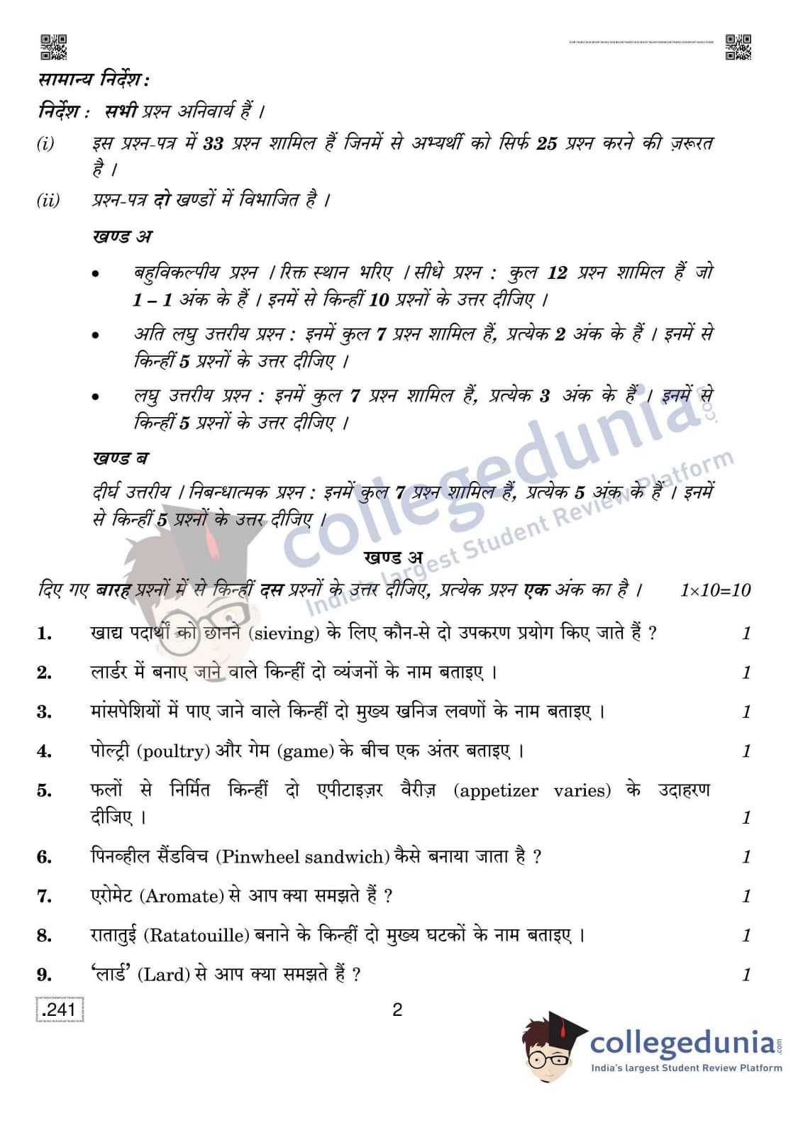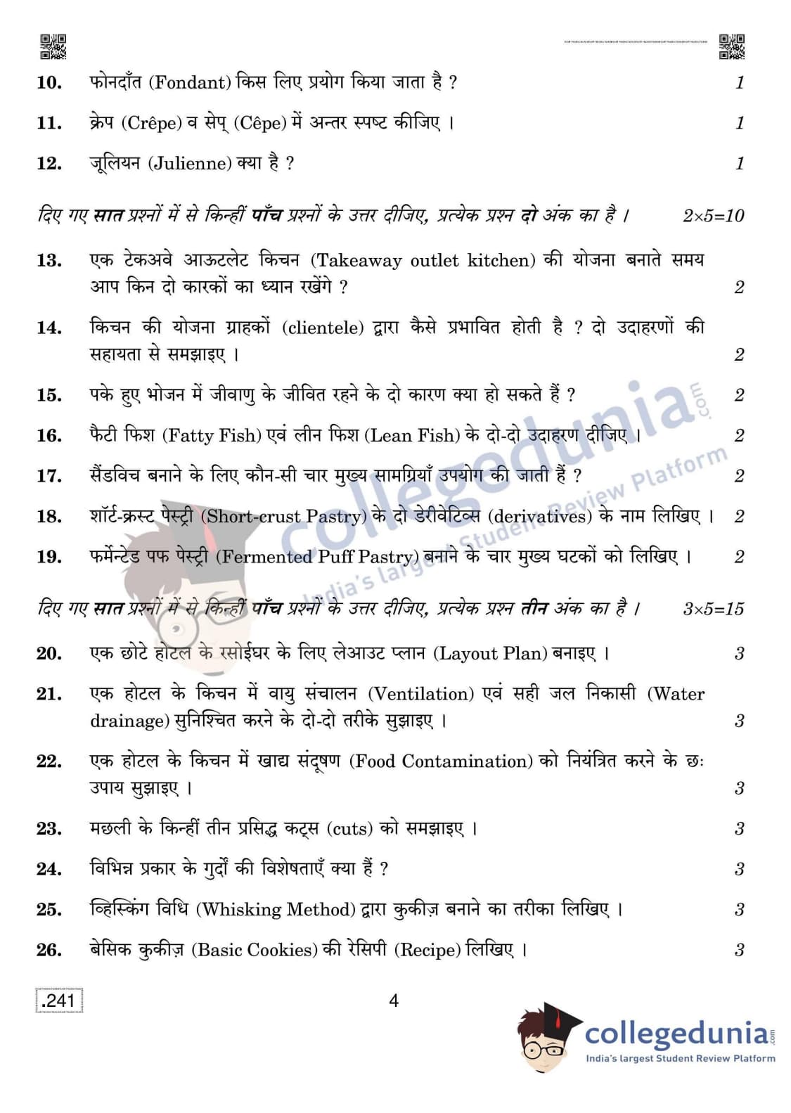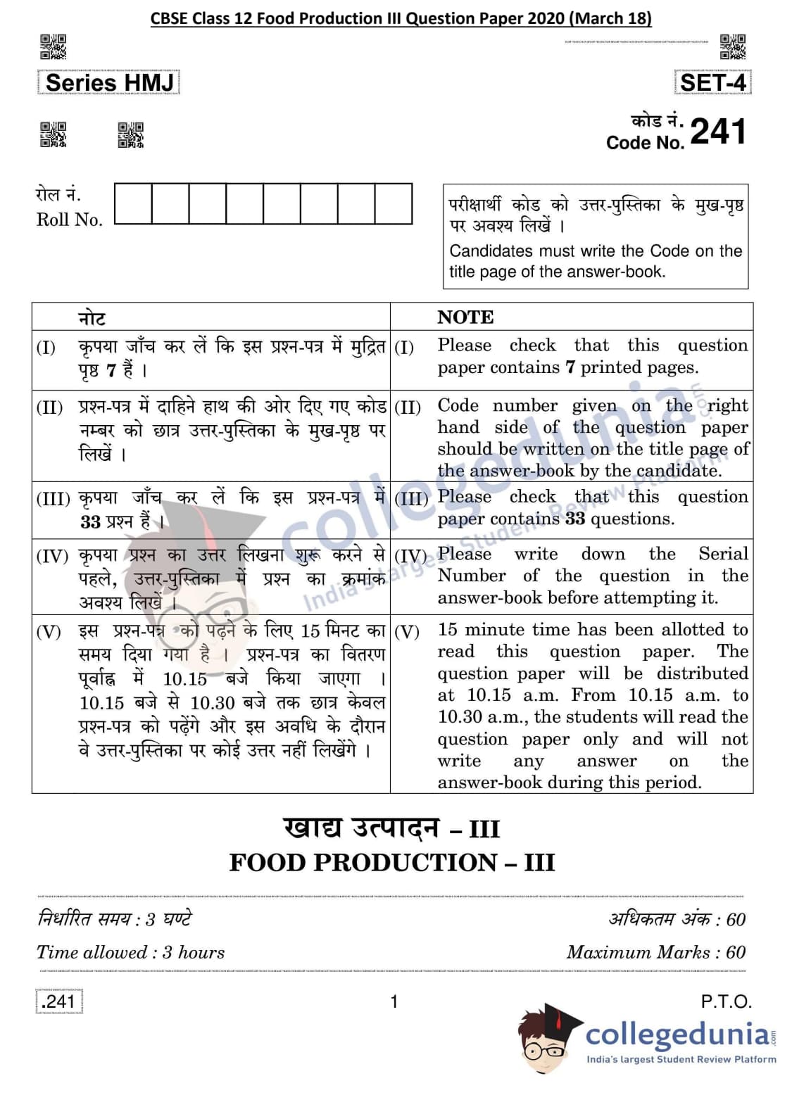 CBSE Class 12 Food Production III Question Paper 2020 with Answer Key Set 4 - 241 is available for download. The exam was conducted by the Central Board of Secondary Education on March 18, 2020 in the Morning Session 10:30 AM to 1:30 PM. The medium of paper was English & Hindi. The question paper comprised a total of 33 questions divided among 2 sections.