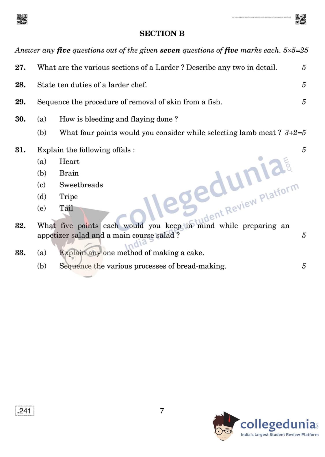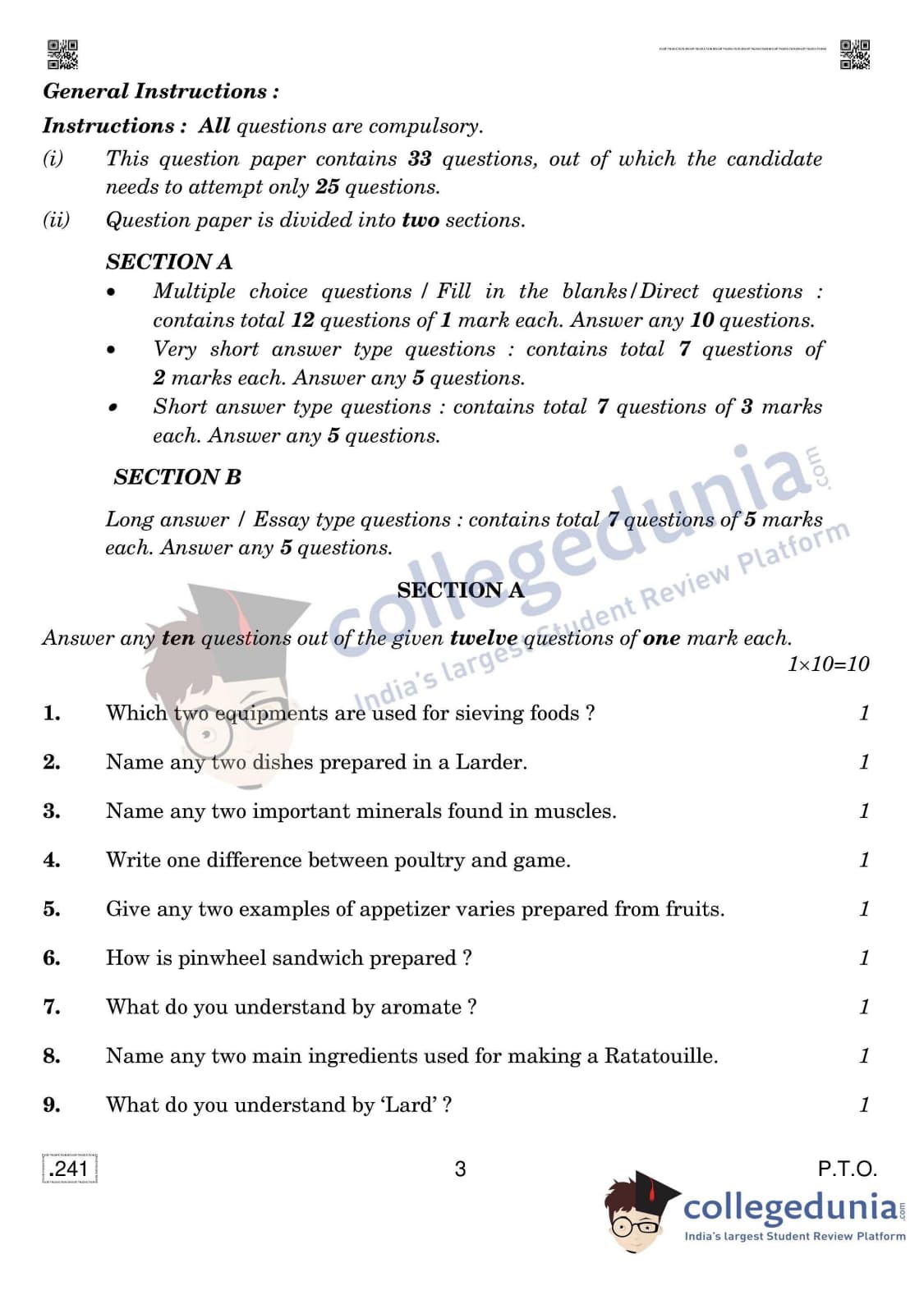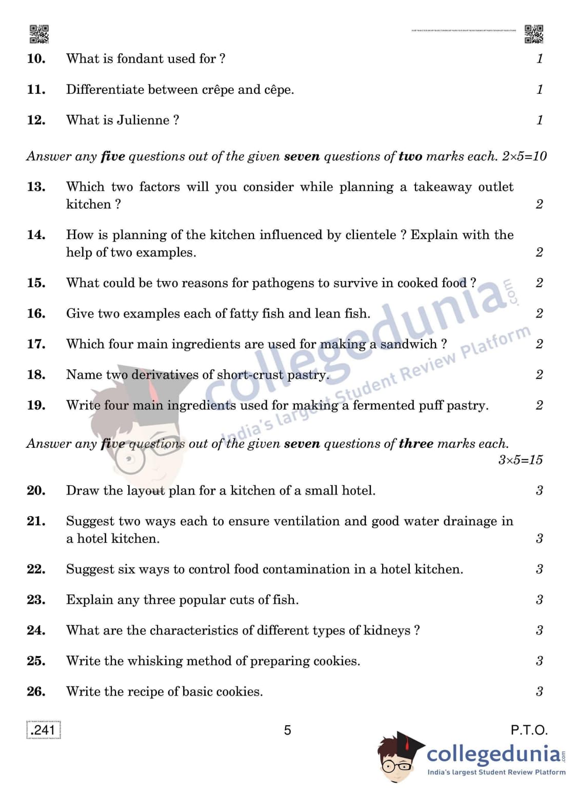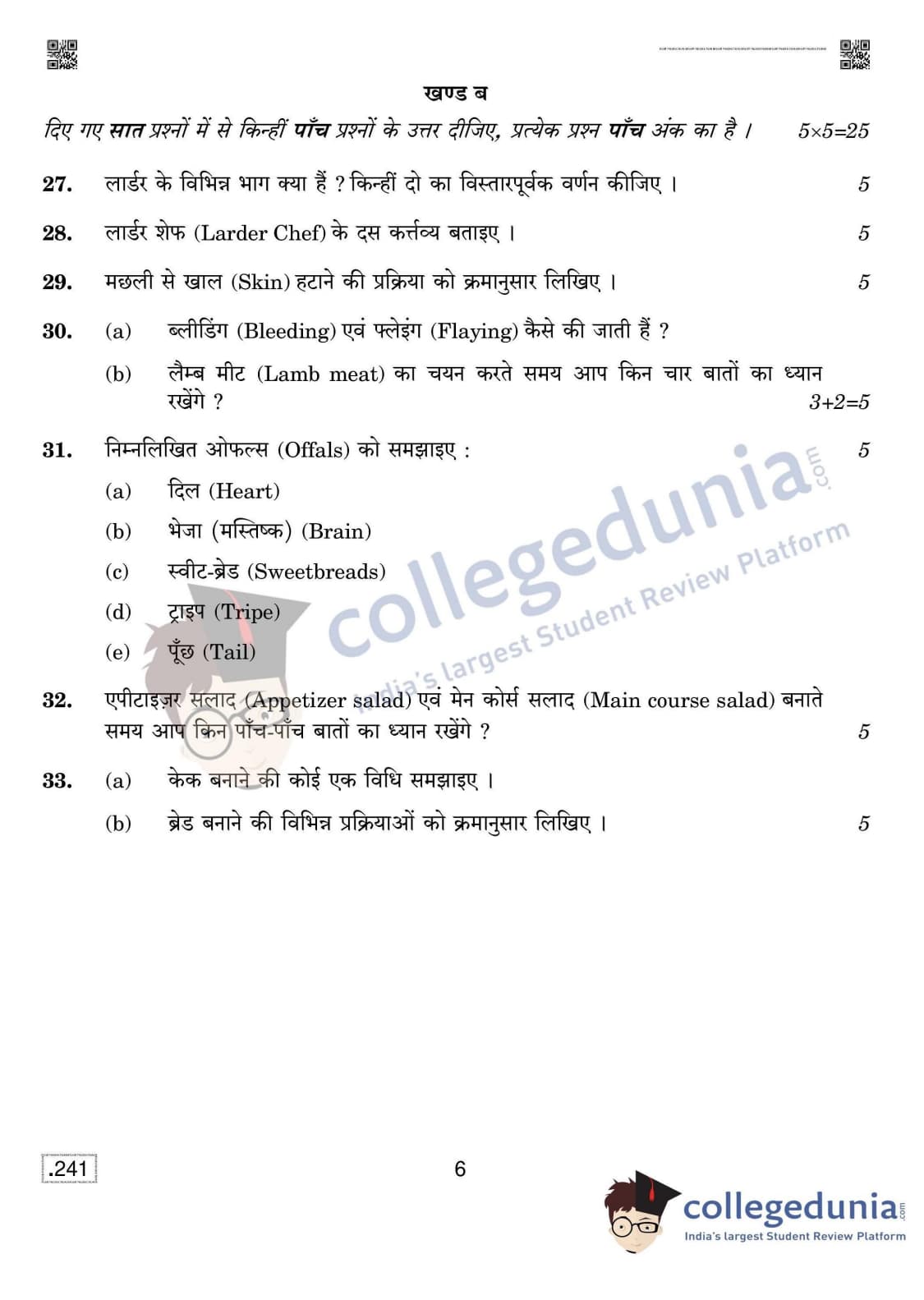 CBSE Class 12 Food Production III Question Paper 2020 with Answer Key Set 4 - 241 is available for download. The exam was conducted by the Central Board of Secondary Education on March 18, 2020 in the Morning Session 10:30 AM to 1:30 PM. The medium of paper was English & Hindi. The question paper comprised a total of 33 questions divided among 2 sections.