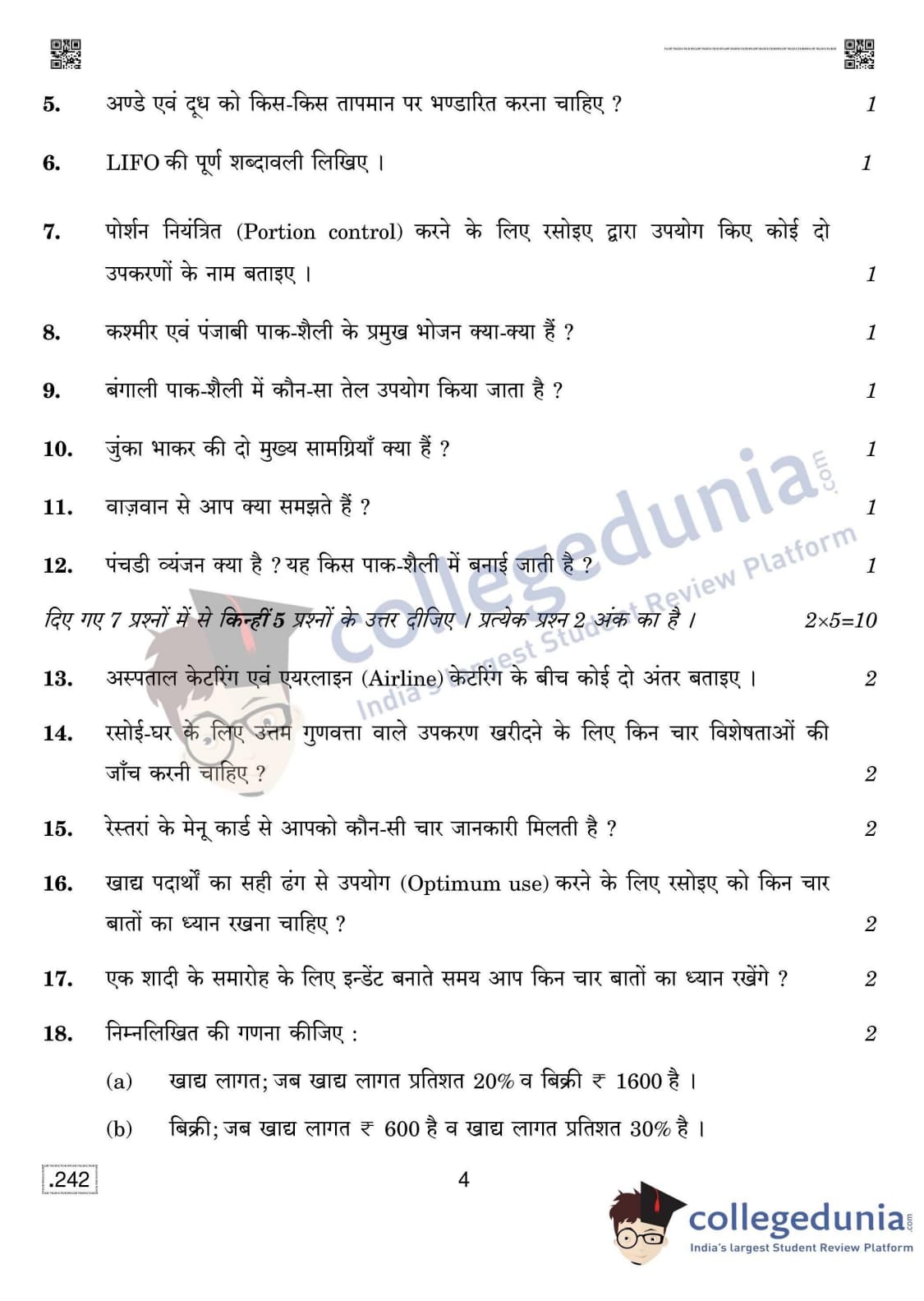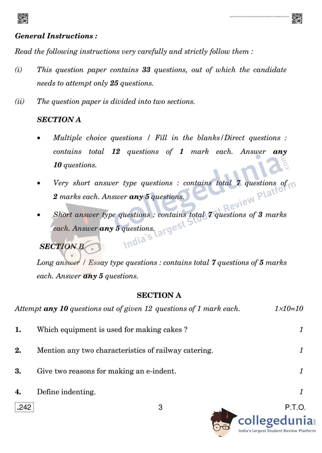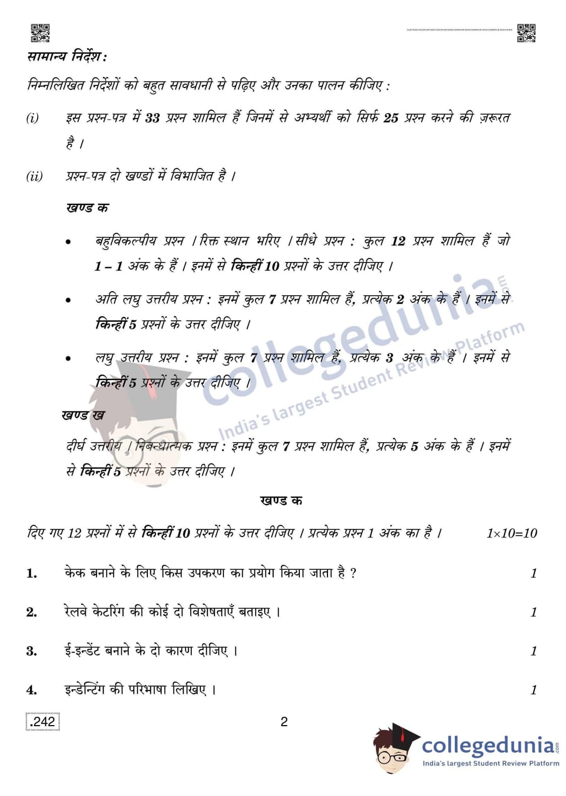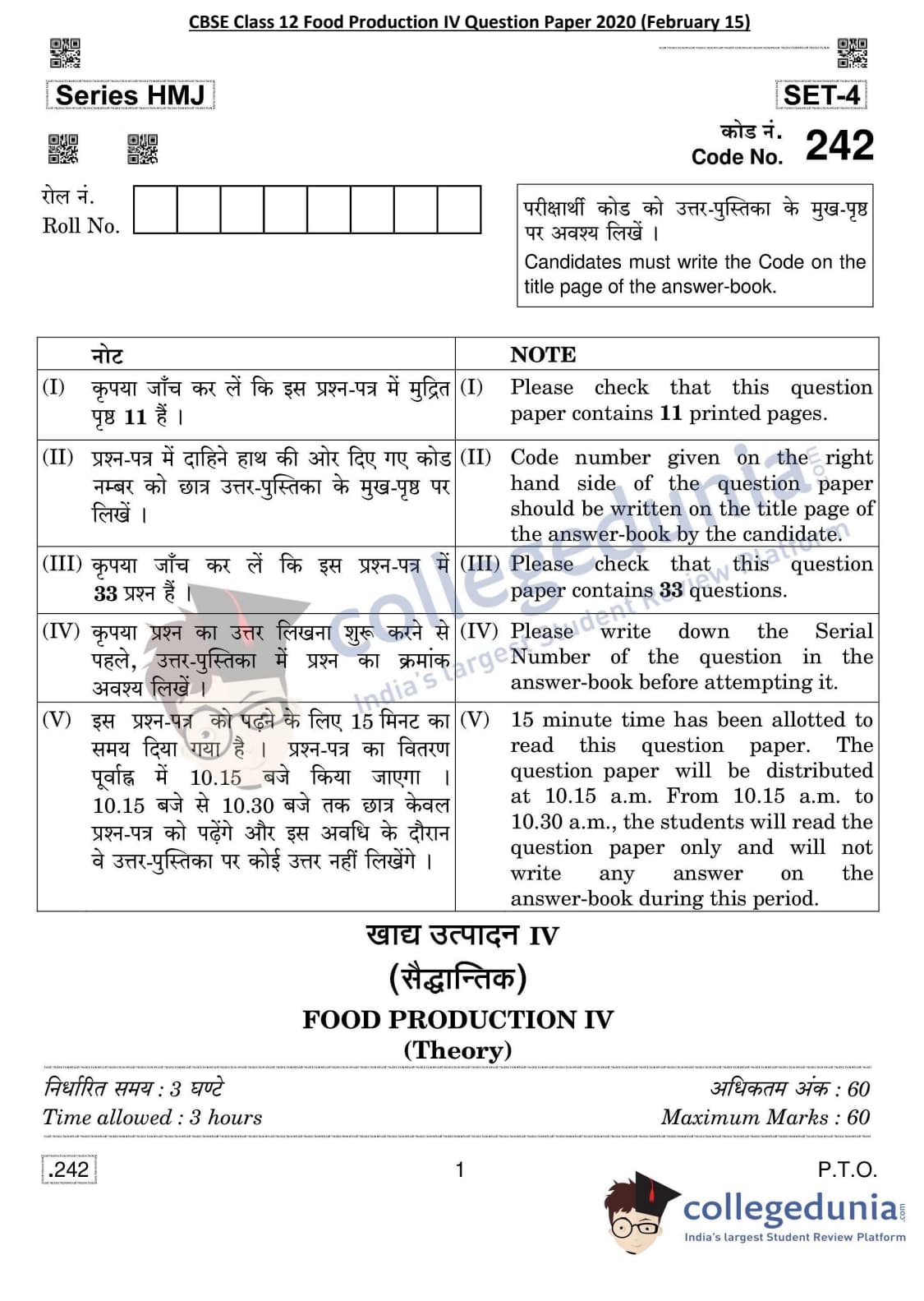 CBSE Class 12 Food Production IV Question Paper 2020 with Answer Key Set 4 - 242 is available for download. The exam was conducted by the Central Board of Secondary Education on February 15, 2020 in the Morning Session 10:30 AM to 1:30 PM. The medium of paper was English & Hindi. The question paper comprised a total of 33 questions divided among 2 sections.
