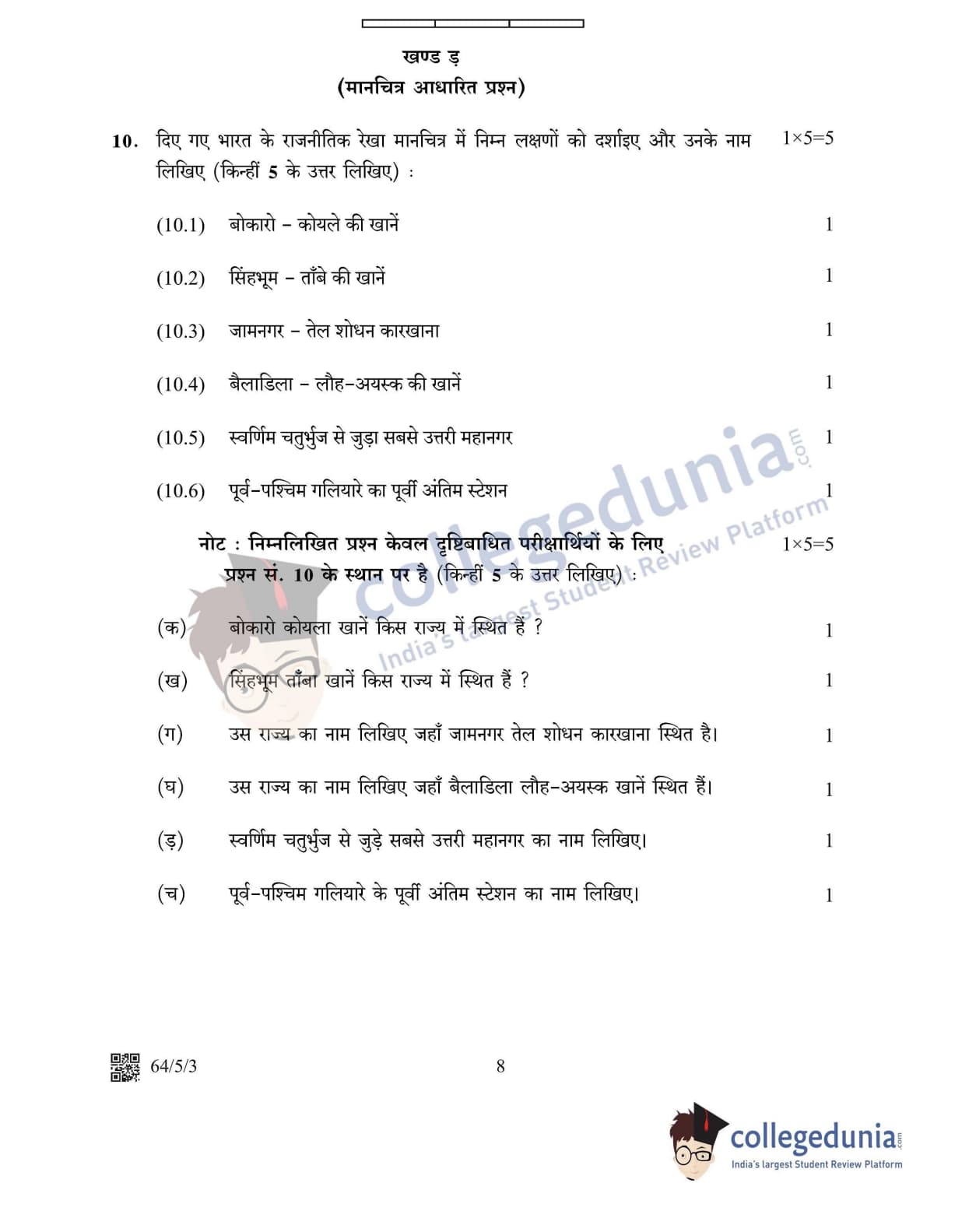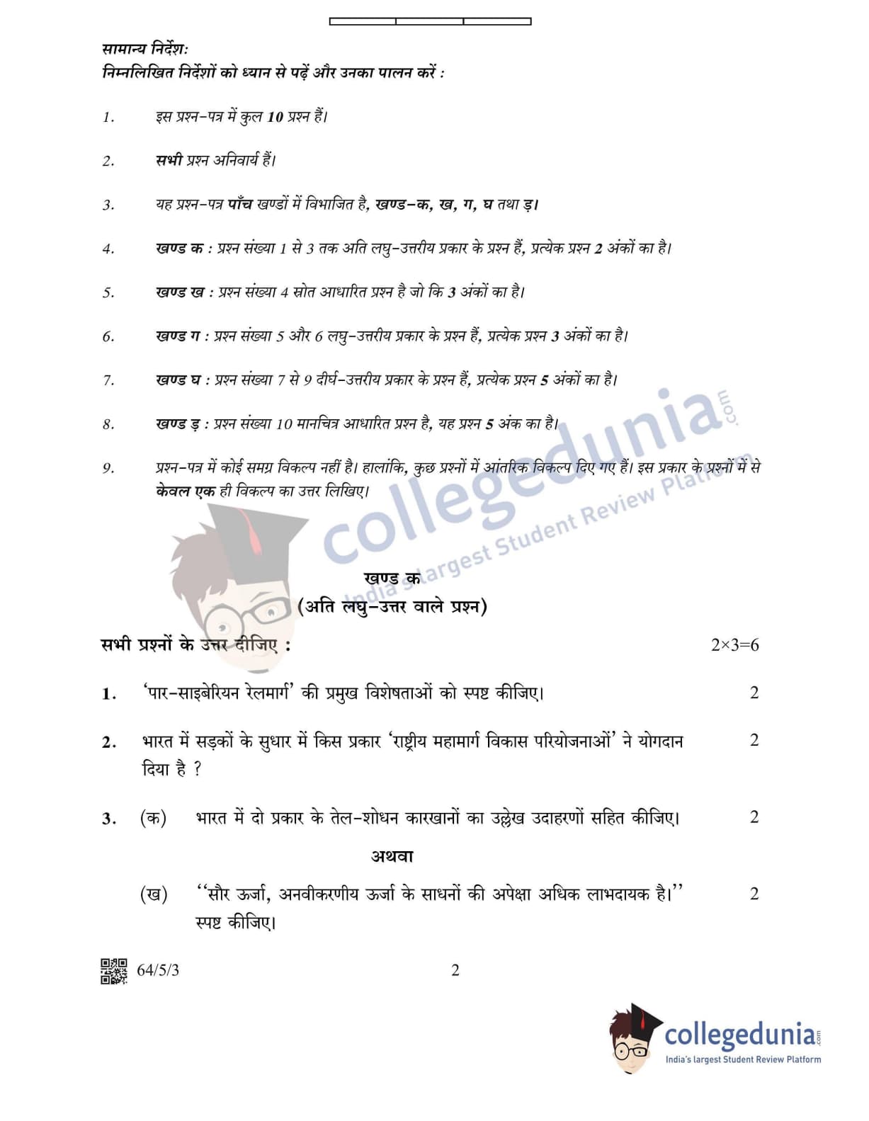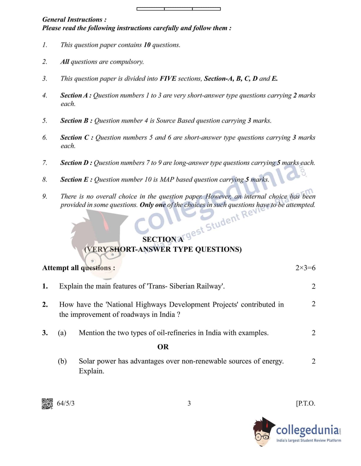 CBSE Class 12 2022 Geography Question Paper Set 3 - 64/5/3 with Answer Key pdf is available for download. The exam was conducted by Central Board of Secondary Education on May 20, 2022 in the Morning Session 10:30 AM to 12:30 PM. The medium of paper was English & Hindi. In terms of difficulty level, CBSE Class 12 Geography paper was of Moderate level. The question paper comprised a total of 10 questions divided among 5 sections.