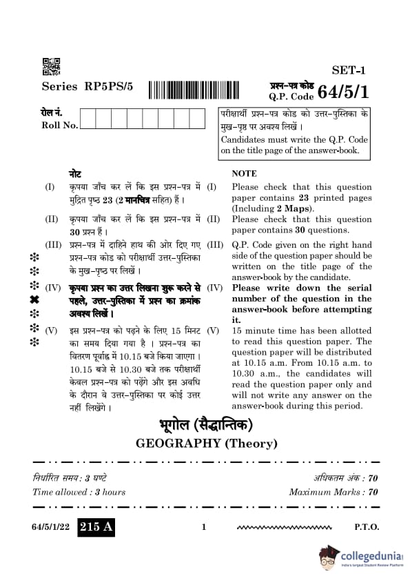 CBSE Class 12 Geography Question Paper 2024 PDF (Set 1 - 64/5/1) is available for download here. CBSE conducted the Geography exam on February 29, 2024 from 10:30 AM to 1:30 PM. The total marks for the theory paper are 70. The question paper will contain 20% MCQ-based questions, 40% competency-based questions, and 40% short and long answer type questions.
