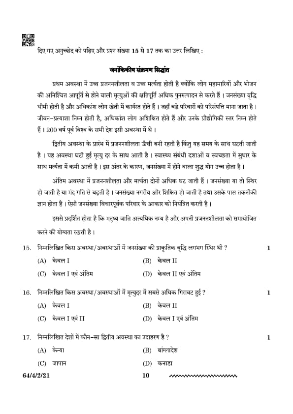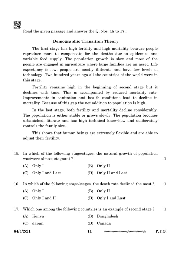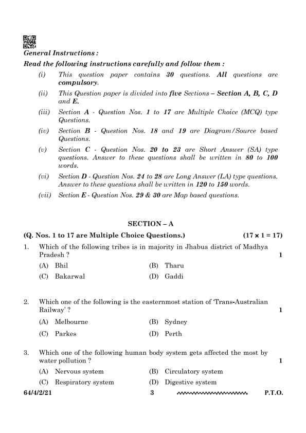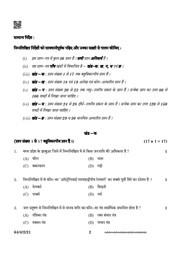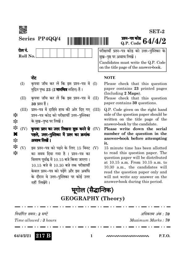 CBSE Class 12 Geography Question Paper 2024 PDF (Set 2 - 64/4/2) is available for download here. CBSE conducted the Geography exam on February 29, 2024 from 10:30 AM to 1:30 PM. The total marks for the theory paper are 70. The question paper will contain 20% MCQ-based questions, 40% competency-based questions, and 40% short and long answer type questions