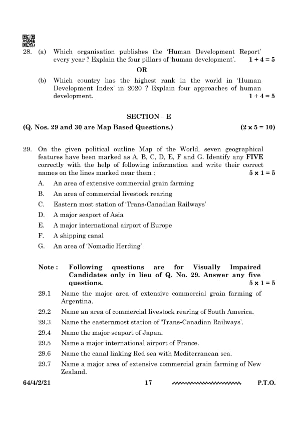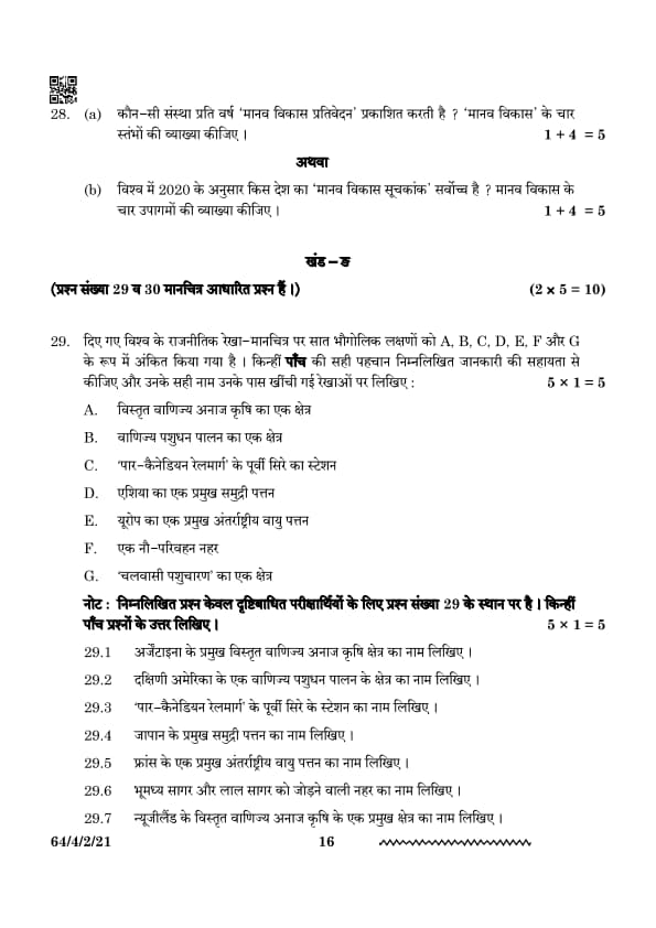 CBSE Class 12 Geography Question Paper 2024 (Set 2 - 64/4/2) with Answer Key
