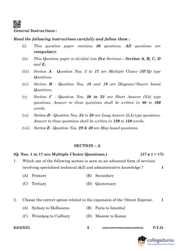 CBSE Class 12 Geography Question Paper 2024 PDF (Set 3 - 64/4/3) is available for download here. CBSE conducted the Geography exam on February 29, 2024 from 10:30 AM to 1:30 PM. The total marks for the theory paper are 70. The question paper contains 20% MCQ-based questions, 40% competency-based questions, and 40% short and long answer type questions.