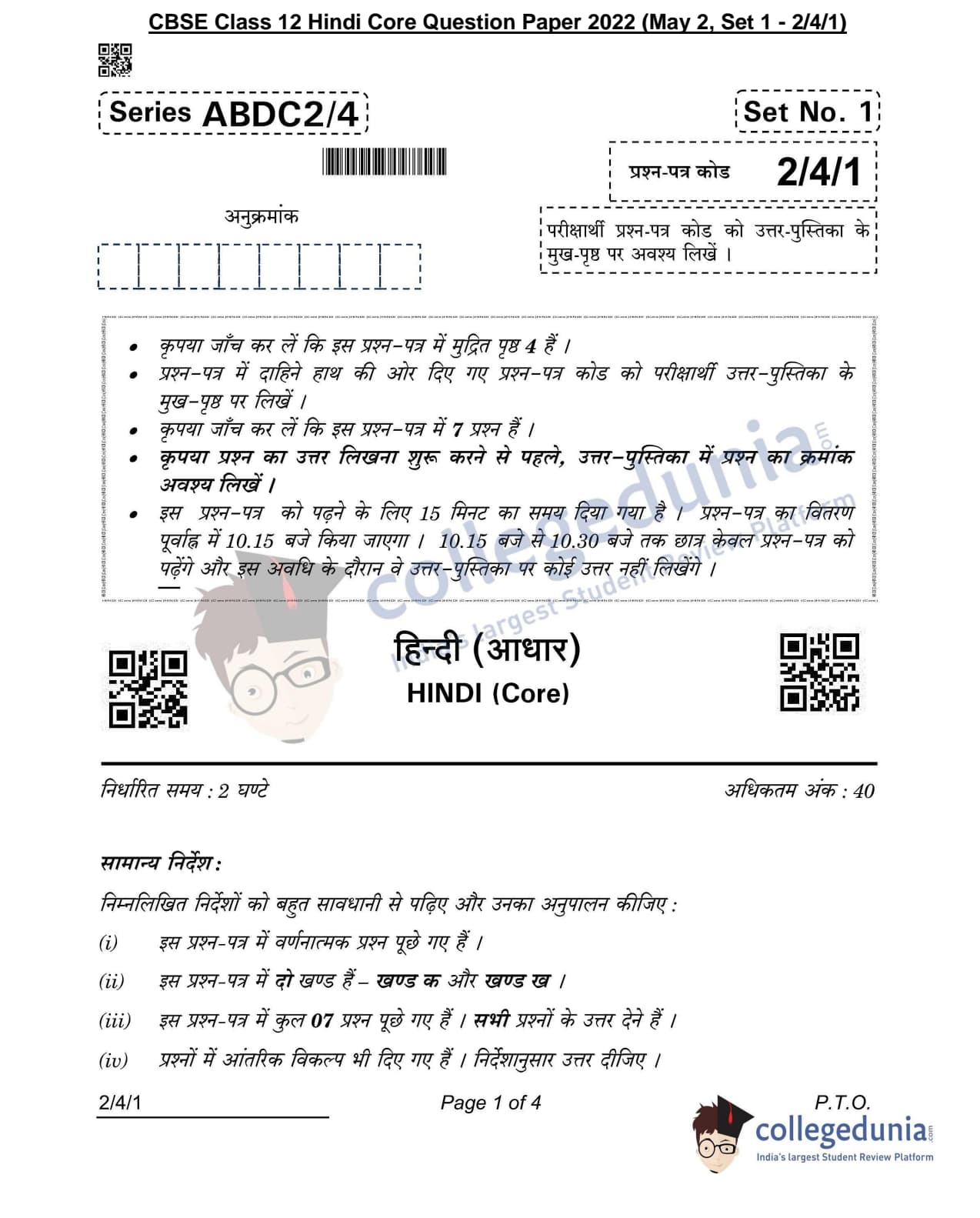CBSE Class 12 2022 Hindi Core Question Paper Set 1 - 2/4/1 with Answer Key pdf is available for download. The exam was conducted by Central Board of Secondary Education on May 2, 2022 in the Morning Session 10:30 AM to 12:30 PM. The medium of paper was Hindi. In terms of difficulty level, CBSE Class 12 Hindi Core paper was of Moderate to Difficult level. The question paper comprised a total of 7 questions divided among 2 sections.