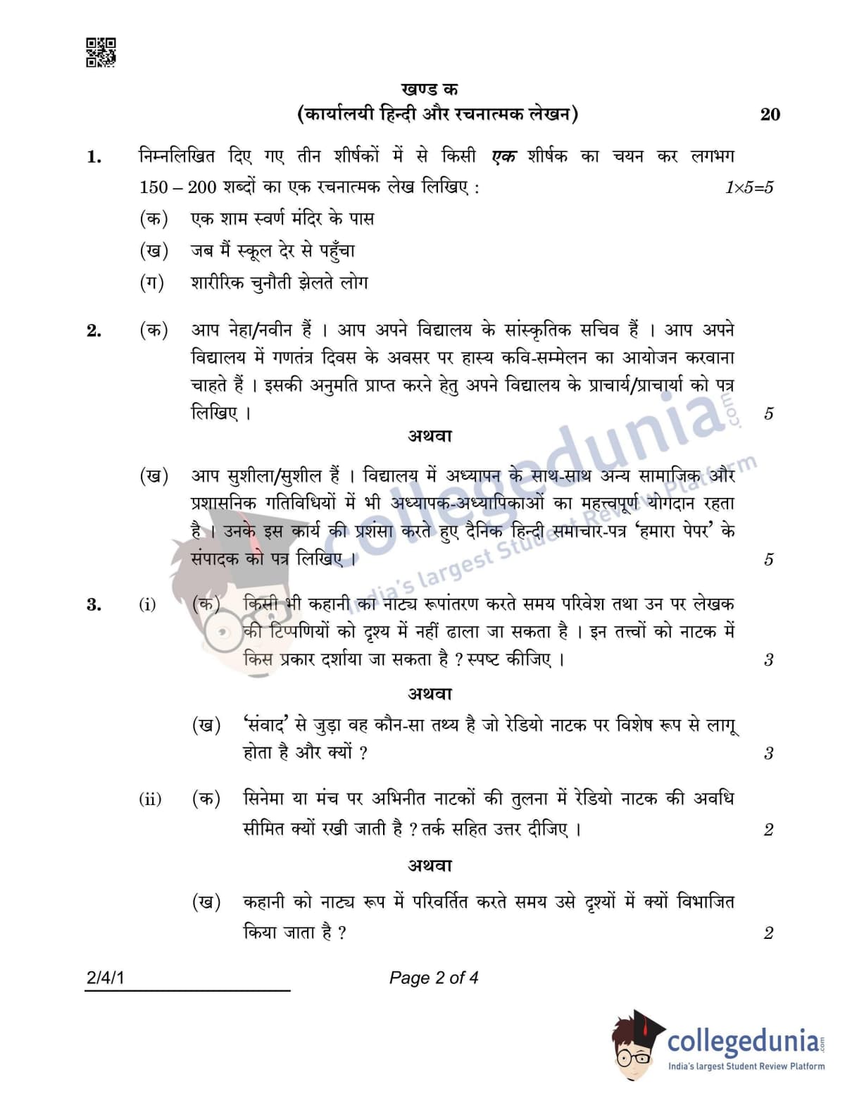 CBSE Class 12 Hindi Core Set 1 - 2/4/1 Question Paper 2022 with Answer Key (May 2)