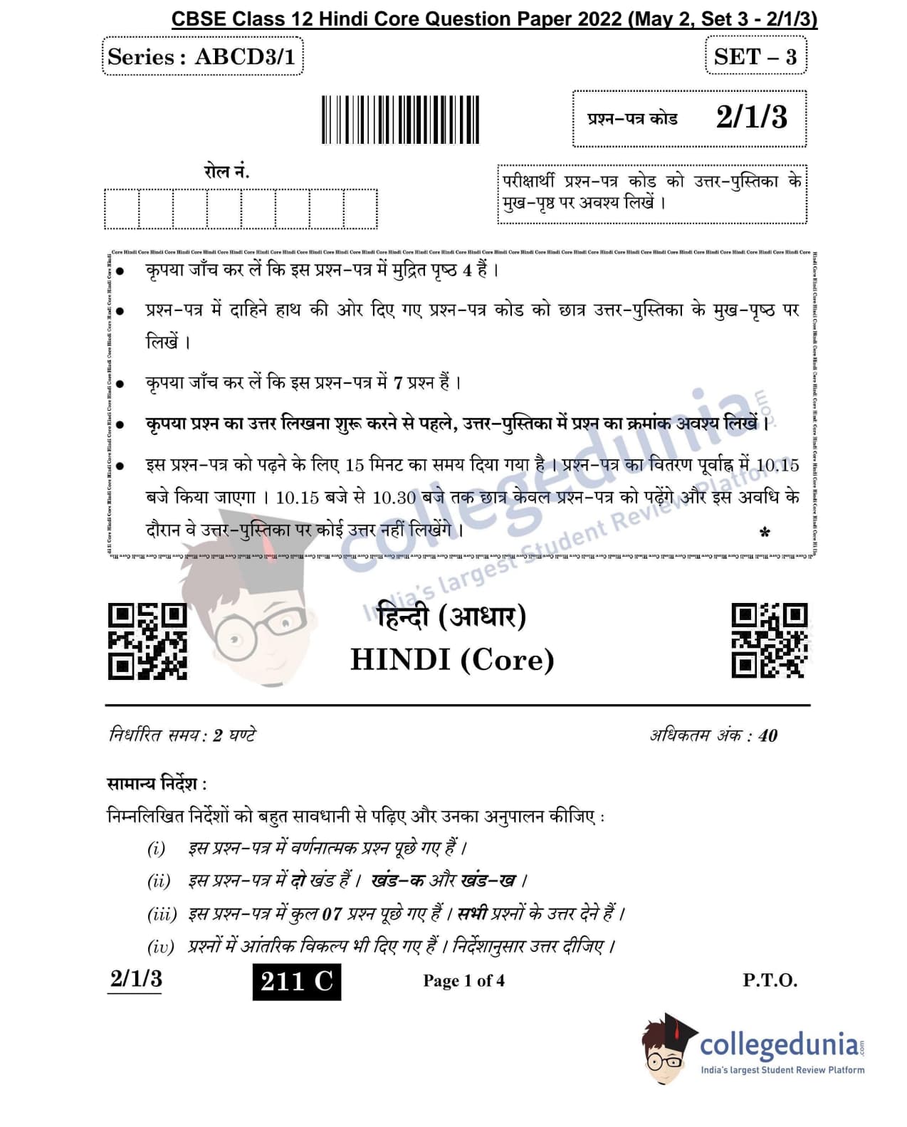 CBSE Class 12 2022 Hindi Core Question Paper Set 3 - 2/1/3 with Answer Key pdf is available for download. The exam was conducted by Central Board of Secondary Education on May 2, 2022 in the Morning Session 10:30 AM to 12:30 PM. The medium of paper was Hindi. In terms of difficulty level, CBSE Class 12 Hindi Core paper was of Moderate to Difficult level. The question paper comprised a total of 7 questions divided among 2 sections.