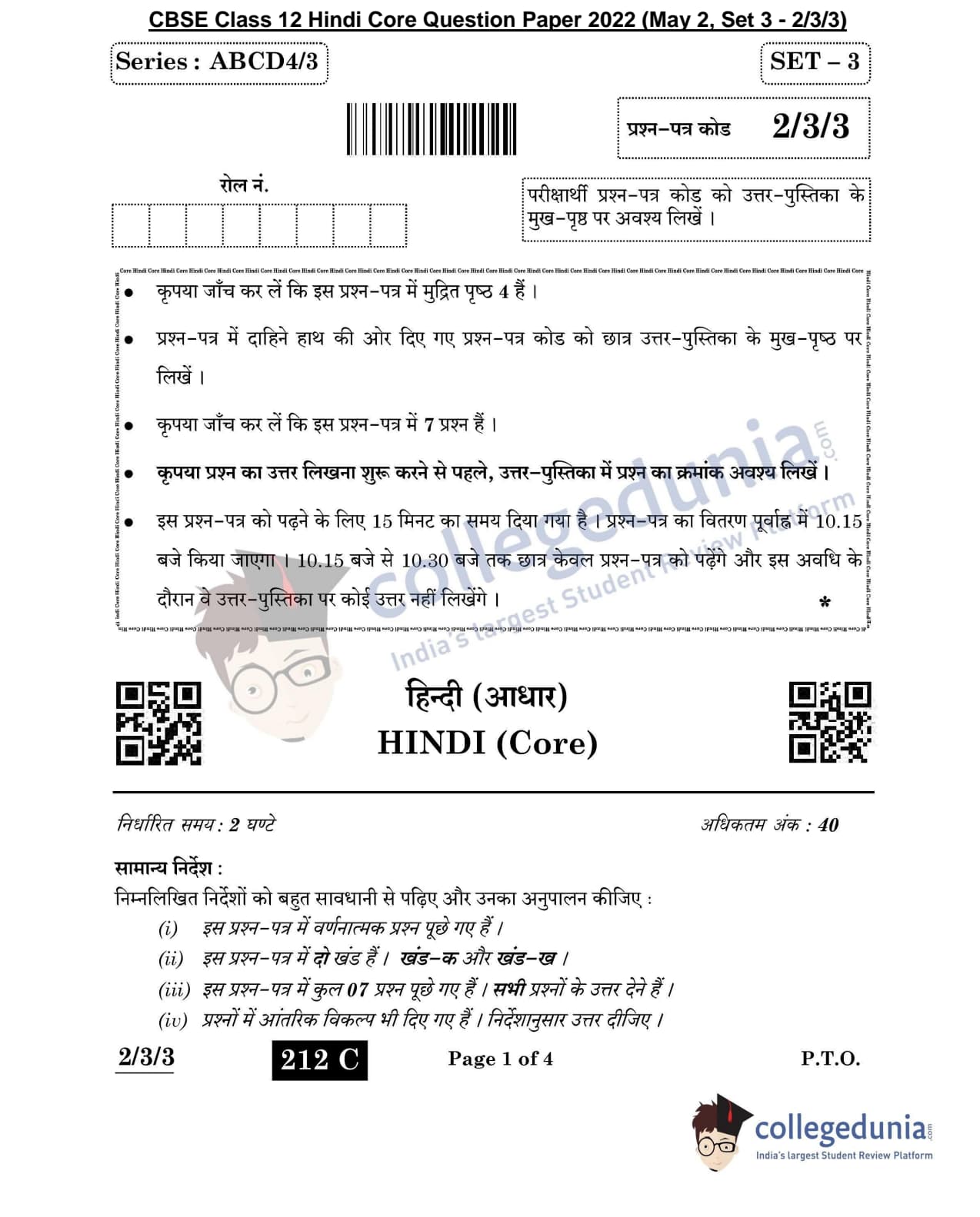 CBSE Class 12 2022 Hindi Core Question Paper Set 3 - 2/3/3 with Answer Key pdf is available for download. The exam was conducted by Central Board of Secondary Education on May 2, 2022 in the Morning Session 10:30 AM to 12:30 PM. The medium of paper was Hindi. In terms of difficulty level, CBSE Class 12 Hindi Core paper was of Moderate to Difficult level. The question paper comprised a total of 7 questions divided among 2 sections.