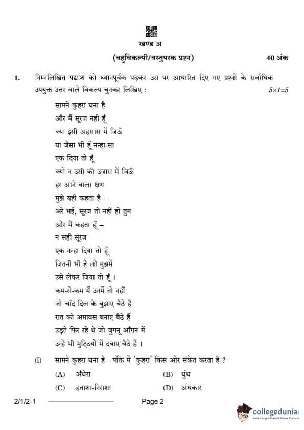 निम्नलिखित पद्यांश को ध्यानपूर्वक पढ़कर दिए गए प्रश्नों के सर्वाधिक उपयुक्त उत्तर वाले विकल्प चुनकर लिखिए।