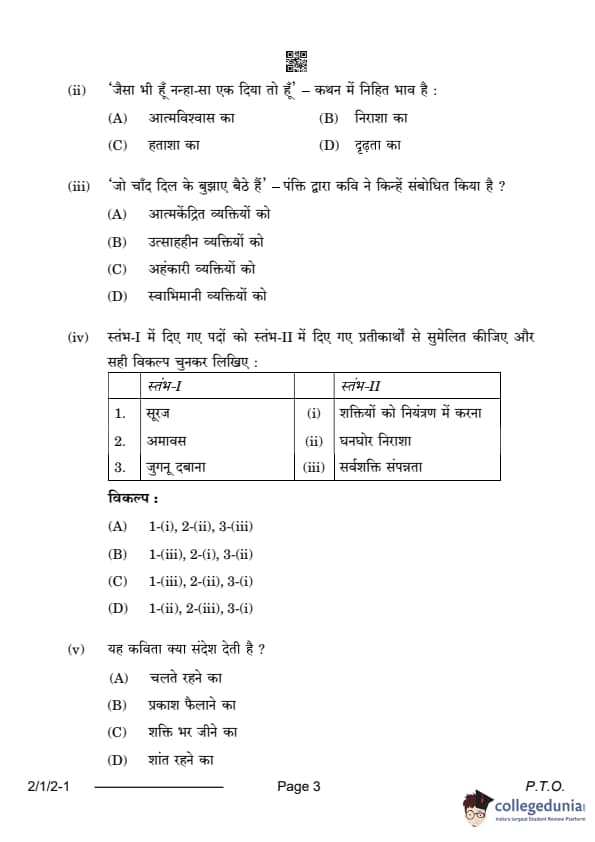 यह पंक्ति उन लोगों की ओर संकेत करती है, जो जीवन में निराश होकर प्रयास करना छोड़ चुके हैं। वे अपने मन की रोशनी को बुझाकर बैठे हैं और जीवन को अमावस्या जैसा बना दिया है।(iv) स्तंभ-1 में दिए गए पदों को स्तंभ-2 में दिए गए प्रतीकार्थों से सुमेलित कीजिए और सही विकल्प चुनकर लिखिए।