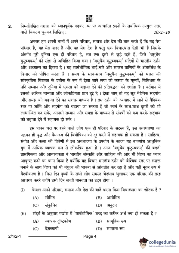 गद्यांश में 'वसुधैव कुटुम्बकम्' के व्यापक दृष्टिकोण की बात की गई है, जिसमें पूरी दुनिया को एक परिवार के रूप में देखा जाता है। केवल अपने परिवार, समाज और देश की बात करना एक संकुचित विचारधारा को दर्शाता है क्योंकि यह वैश्विक भाईचारे की भावना को सीमित कर देता है।(ii) संदर्भ के अनुसार गद्यांश में 'सार्वभौमिक' शब्द का सटीक अर्थ क्या हो सकता है?