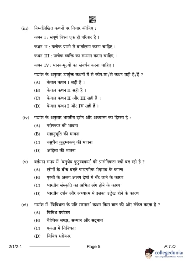 गद्यांश में 'वसुधैव कुटुम्बकम्' को सार्वभौमिक भाई-चारे और समस्त प्राणियों के अंतर्संबंध के विचार को पोषित करने वाला बताया गया है। यहाँ 'सार्वभौमिक' का अर्थ 'व्यापक दृष्टिकोण' से है, जो संपूर्ण विश्व को एकता के सूत्र में बांधने का प्रतीक है।(iii) निम्नलिखित कथनों में से कौन-सा/से कथन सही है/हैं?