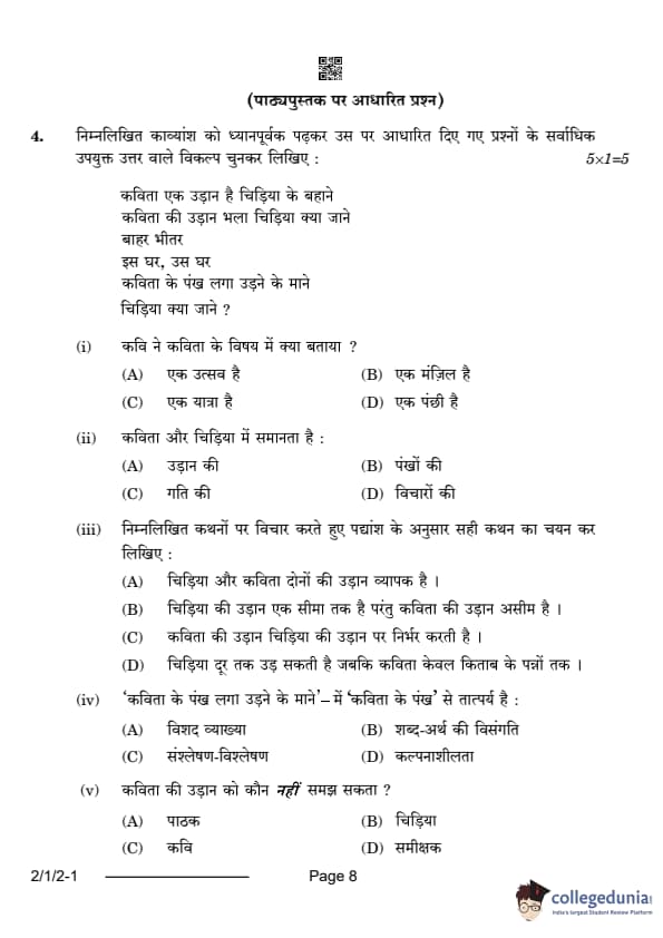 कविता और चिड़िया दोनों की उड़ान होती है, लेकिन कविता की उड़ान विचारों और भावनाओं की होती है, जबकि चिड़िया की उड़ान भौतिक होती है।(iii) निम्नलिखित कथनों पर विचार करते हुए पद्यांश के अनुसार सही कथन का चयन करें।