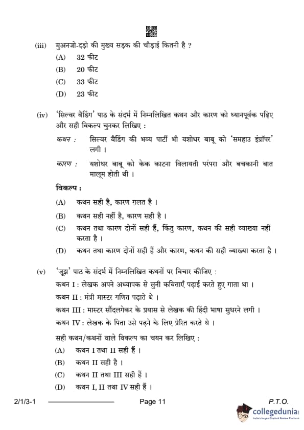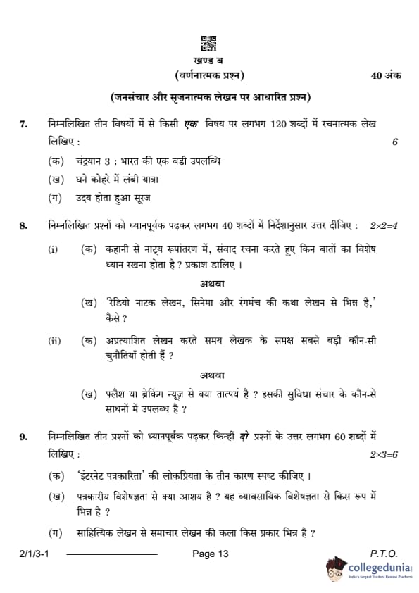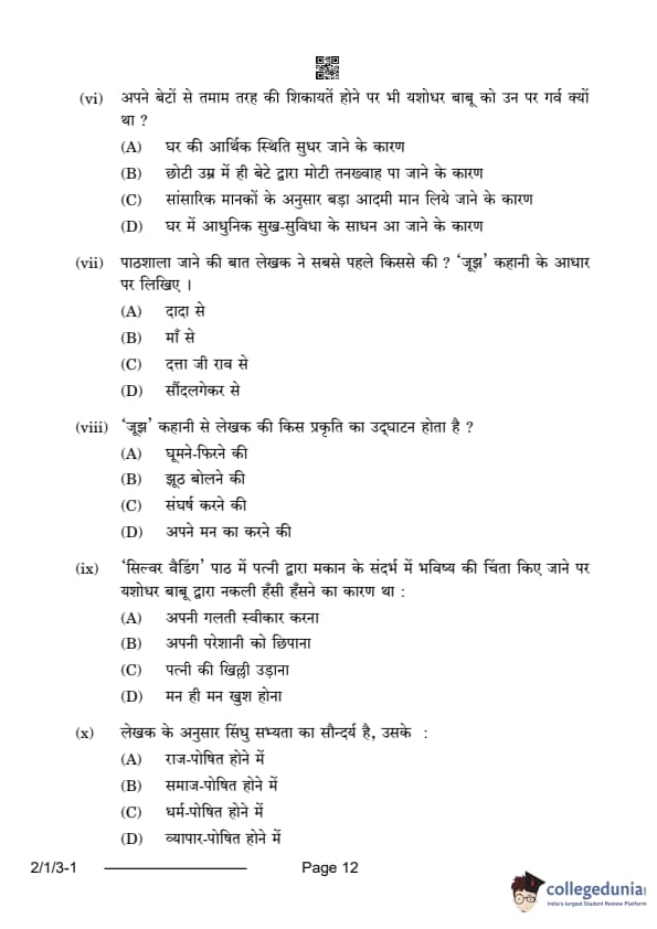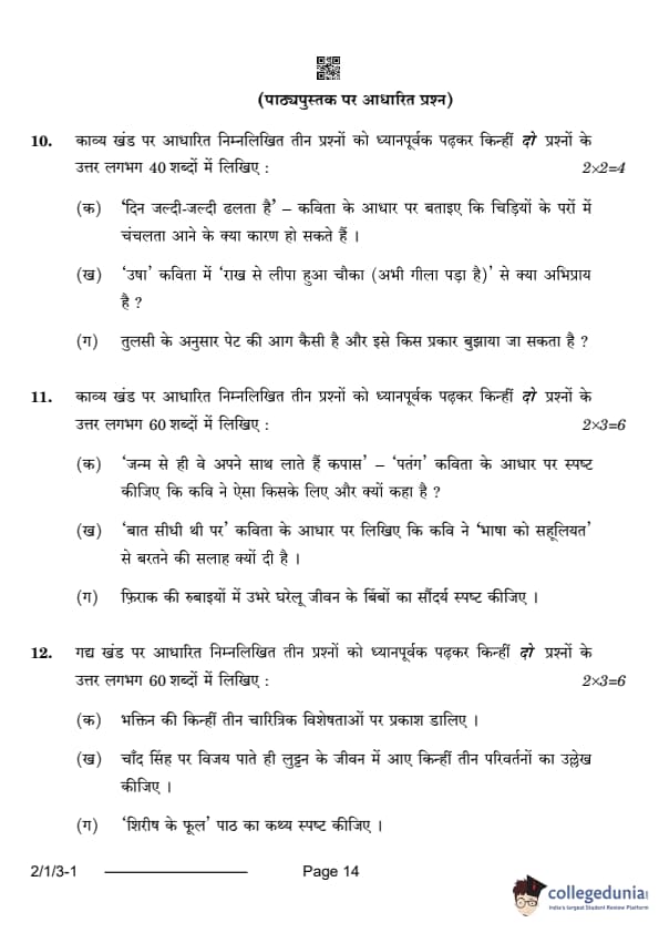 CBSE Class 12 Hindi Core Question Paper 2024 (Set 3- 2/1/3) with Answer Key