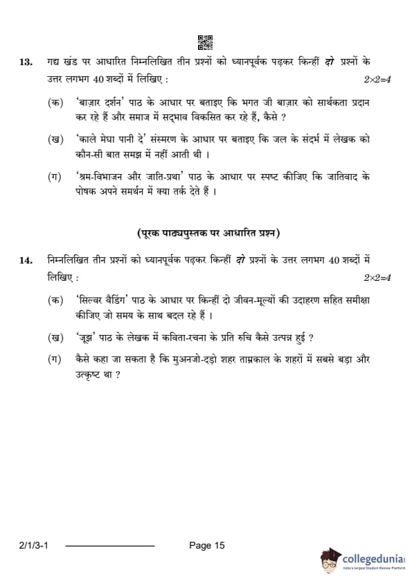 CBSE Class 12 Hindi Core Question Paper 2024 PDF (Set 3- 2/1/3) is available for download here. CBSE conducted the Hindi Core exam on February 19, 2024 from 10:30 AM to 1:30 PM. The total marks for the theory paper are 80. The question paper contains 20% MCQ-based questions, 40% competency-based questions, and 40% short and long answer type questions.