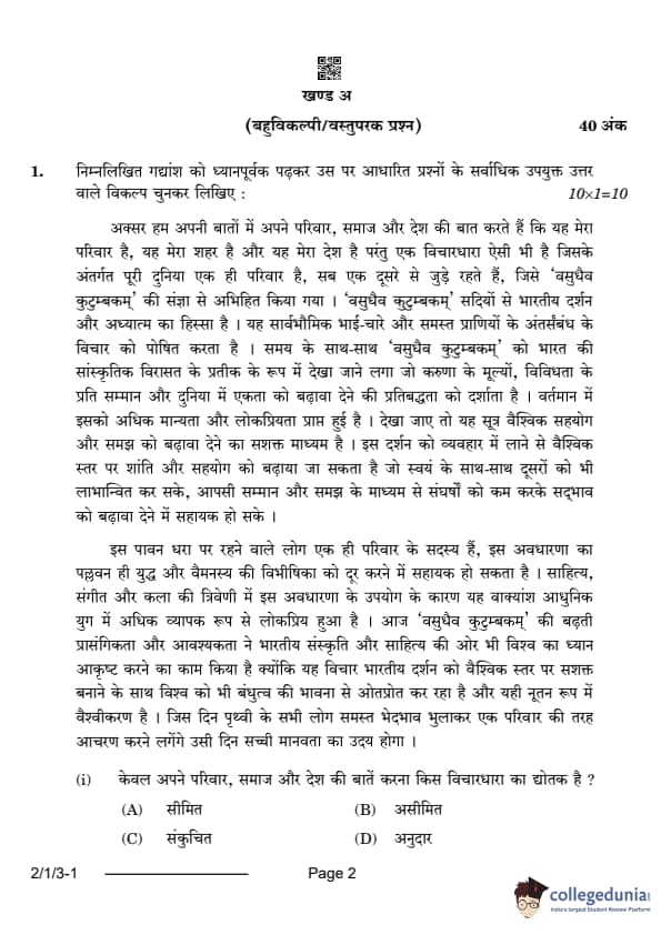 गद्यांश में 'वसुधैव कुटुम्बकम्' के व्यापक दृष्टिकोण की बात की गई है, जिसमें पूरी दुनिया को एक परिवार के रूप में देखा जाता है। केवल अपने परिवार, समाज और देश की बात करना एक संकुचित विचारधारा को दर्शाता है क्योंकि यह वैश्विक भाईचारे की भावना को सीमित कर देता है।(ii) संदर्भ के अनुसार गद्यांश में 'सार्वभौमिक' शब्द का सटीक अर्थ क्या हो सकता है?