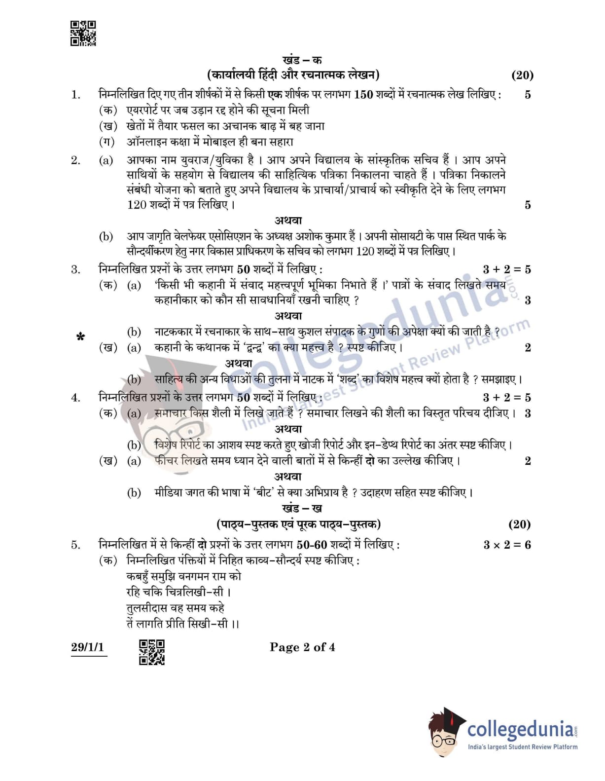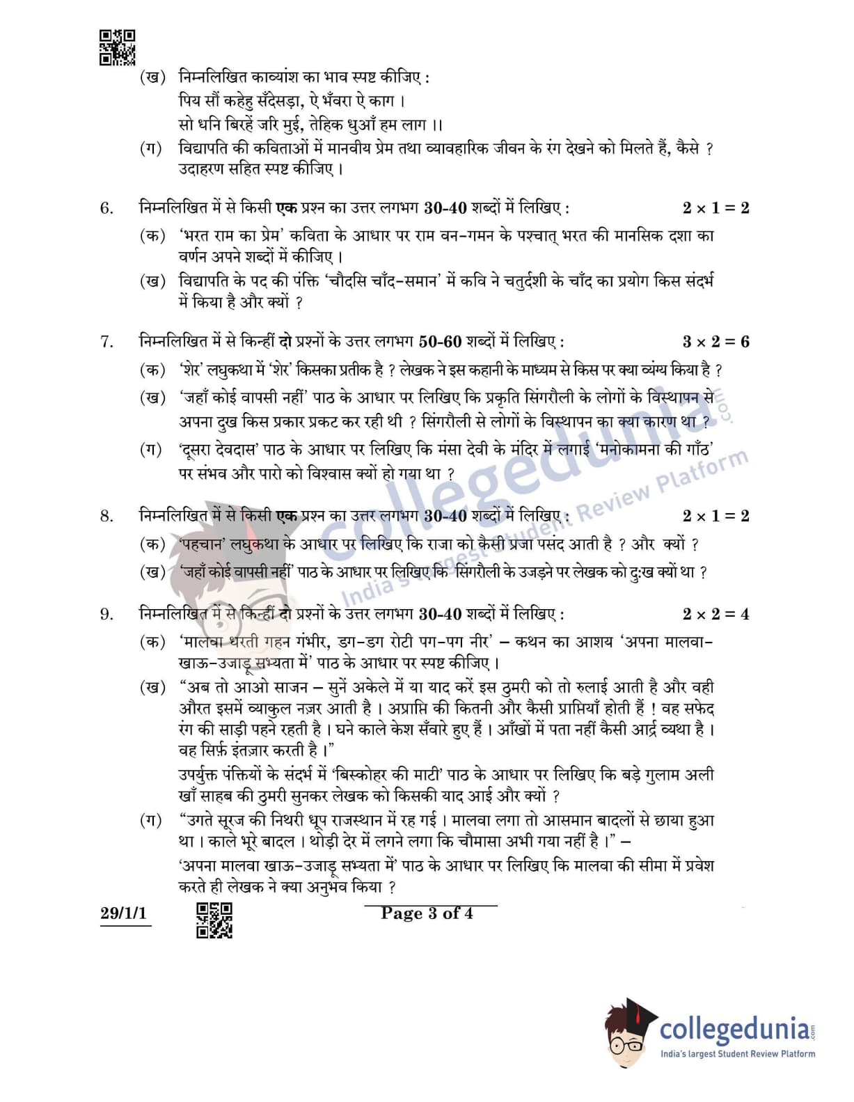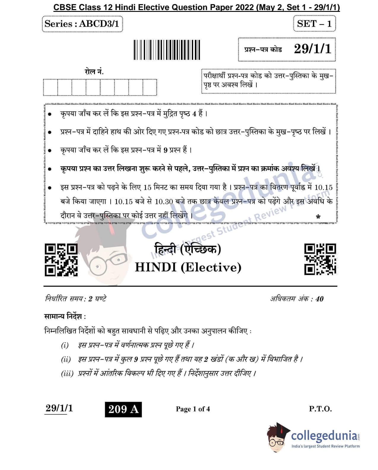 CBSE Class 12 Hindi Elective Set 1 - 29/1/1 Question Paper 2022 with Answer Key (May 2)