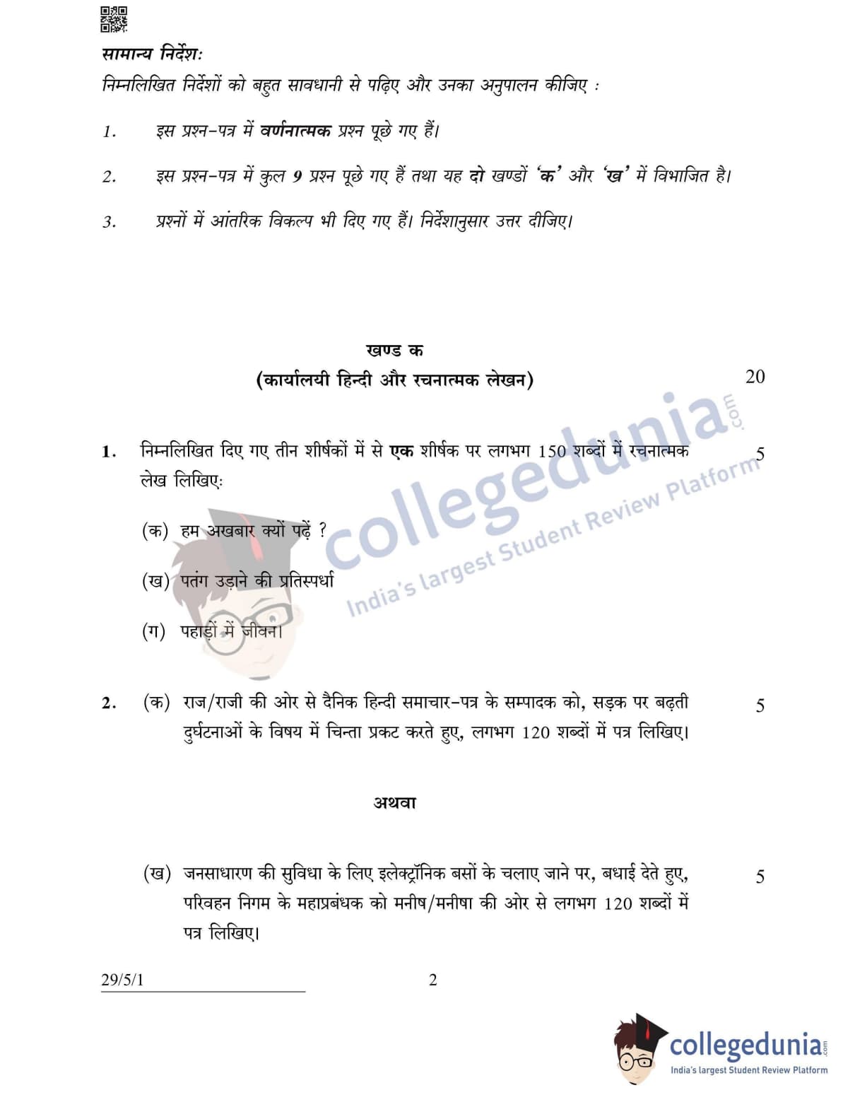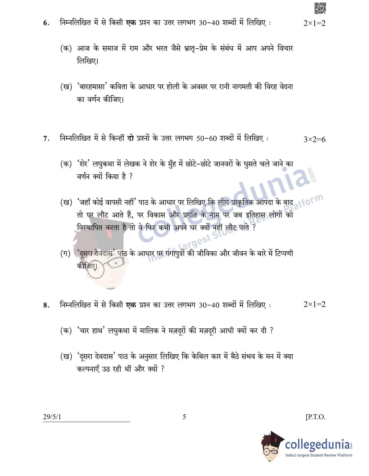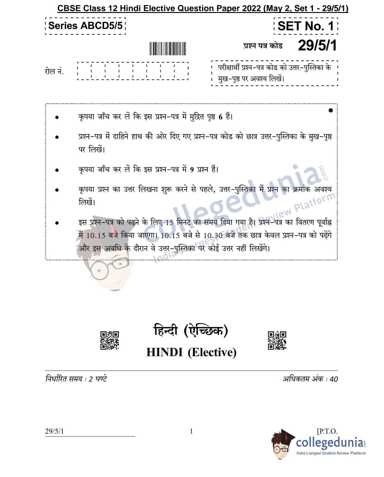CBSE Class 12 Hindi Elective Set 1 - 29/5/1 Question Paper 2022 with Answer Key (May 2)