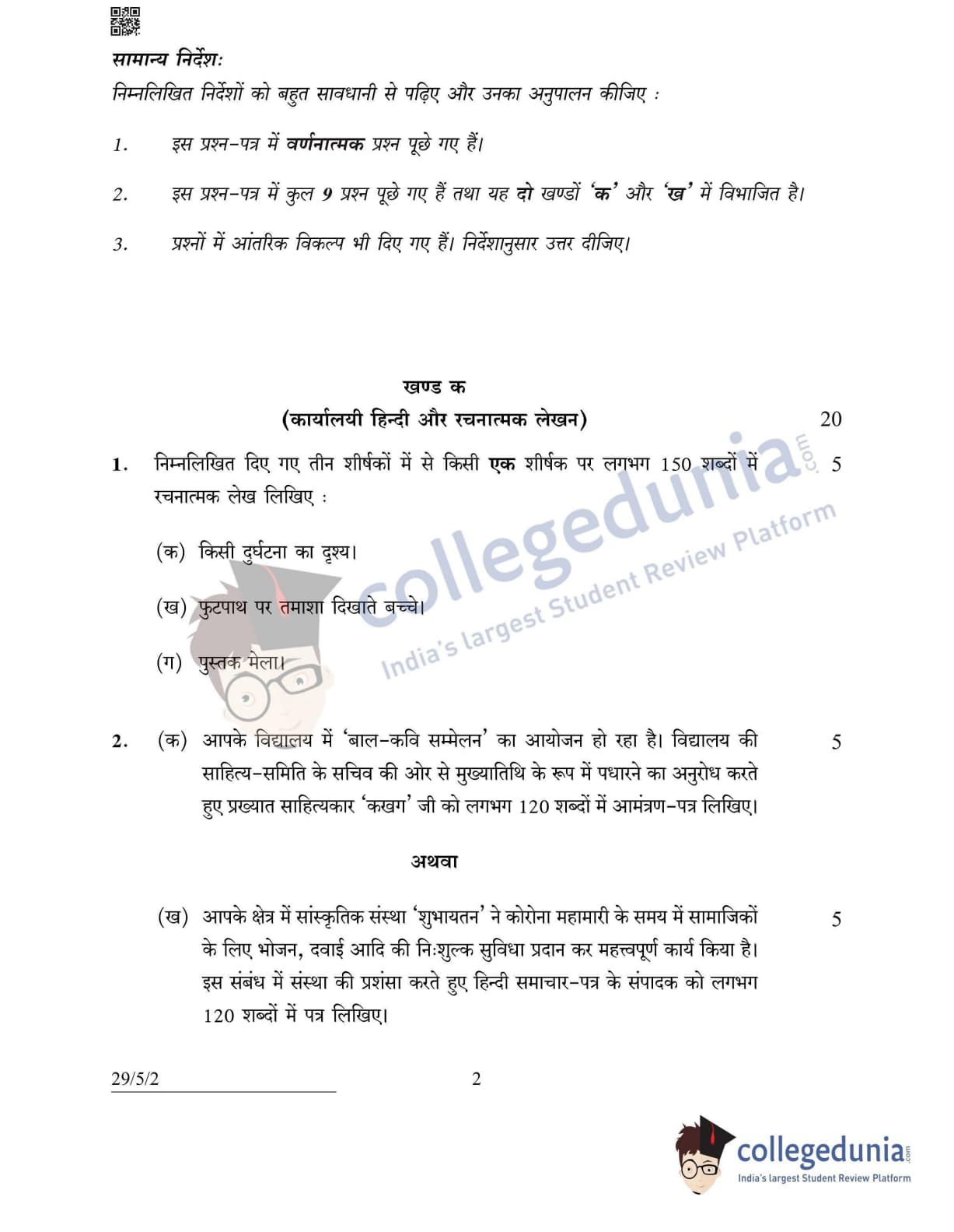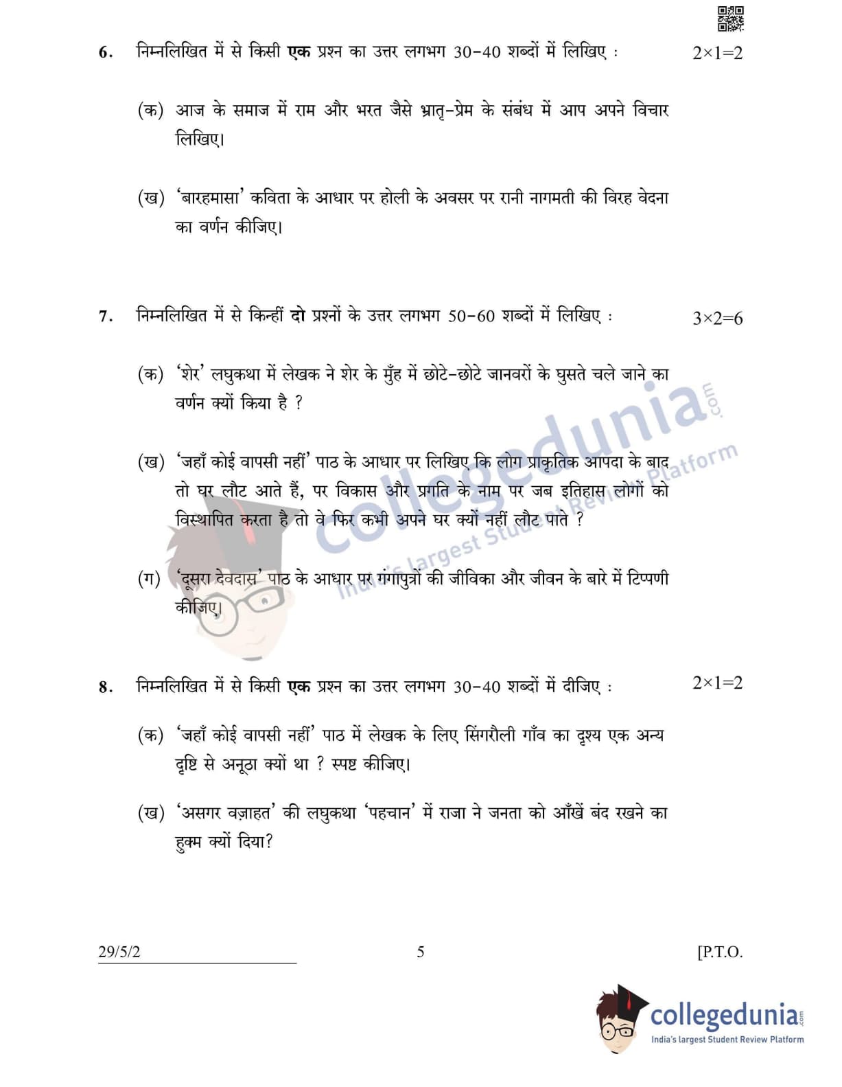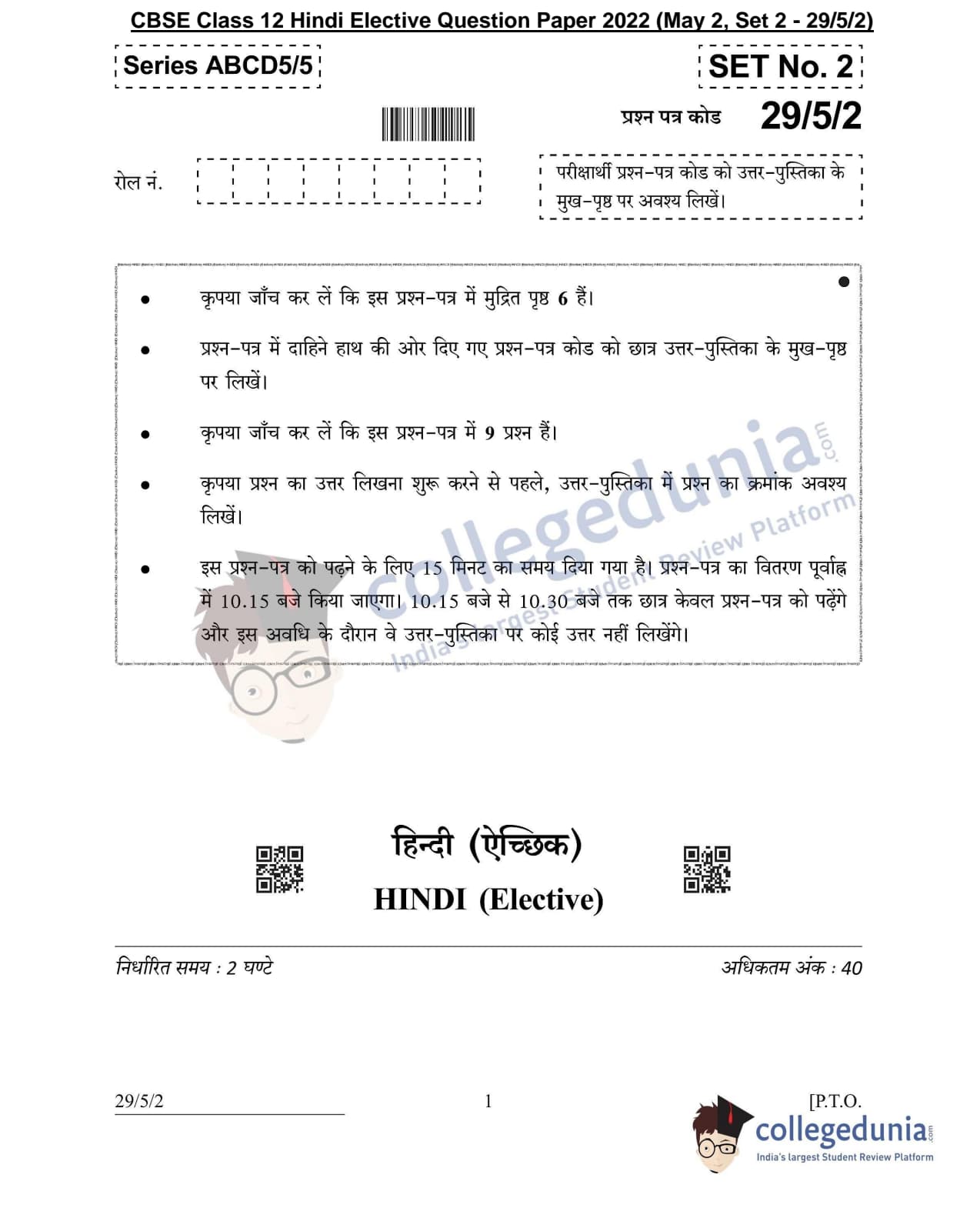 CBSE Class 12 Hindi Elective Set 2 - 29/5/2 Question Paper 2022 with Answer Key (May 2)