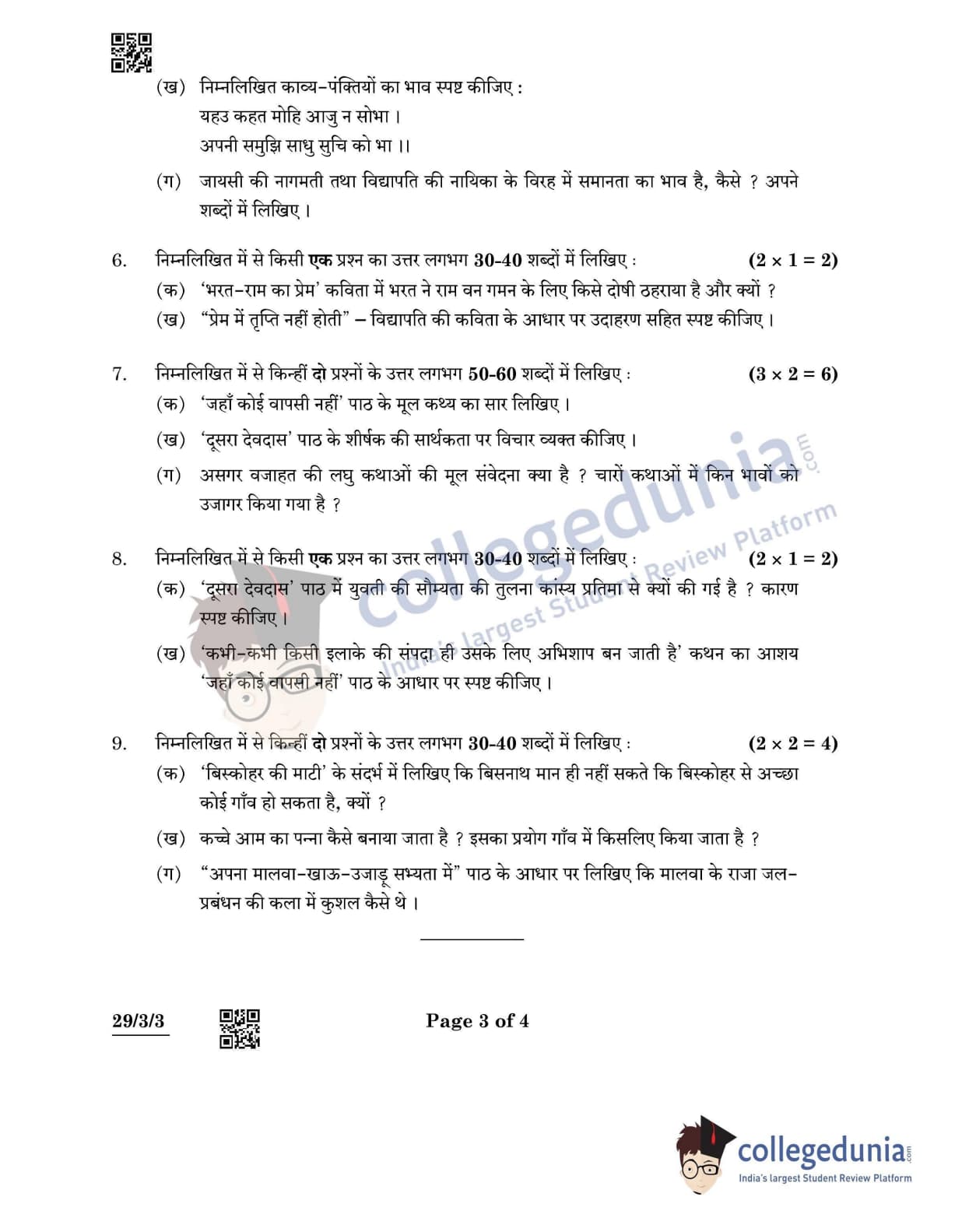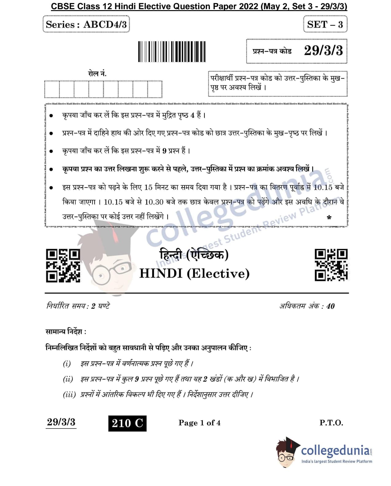 CBSE Class 12 Hindi Elective Set 3 - 29/3/3 Question Paper 2022 with Answer Key (May 2)