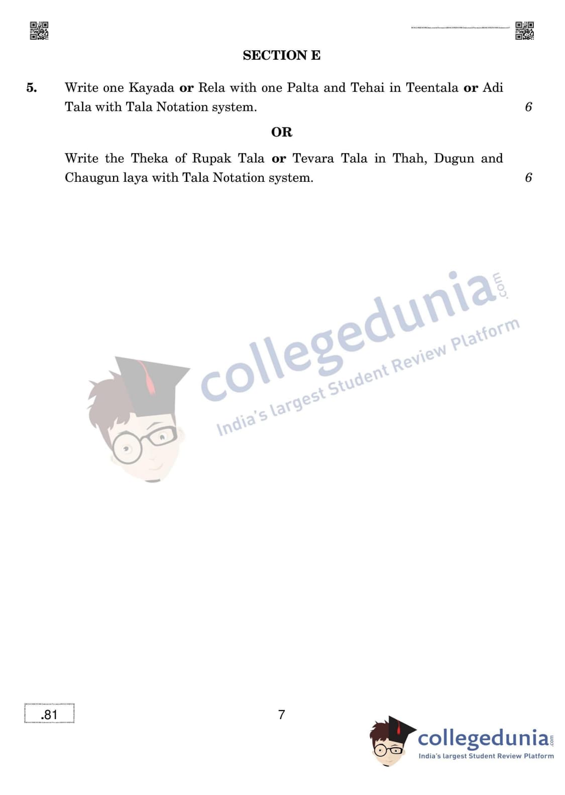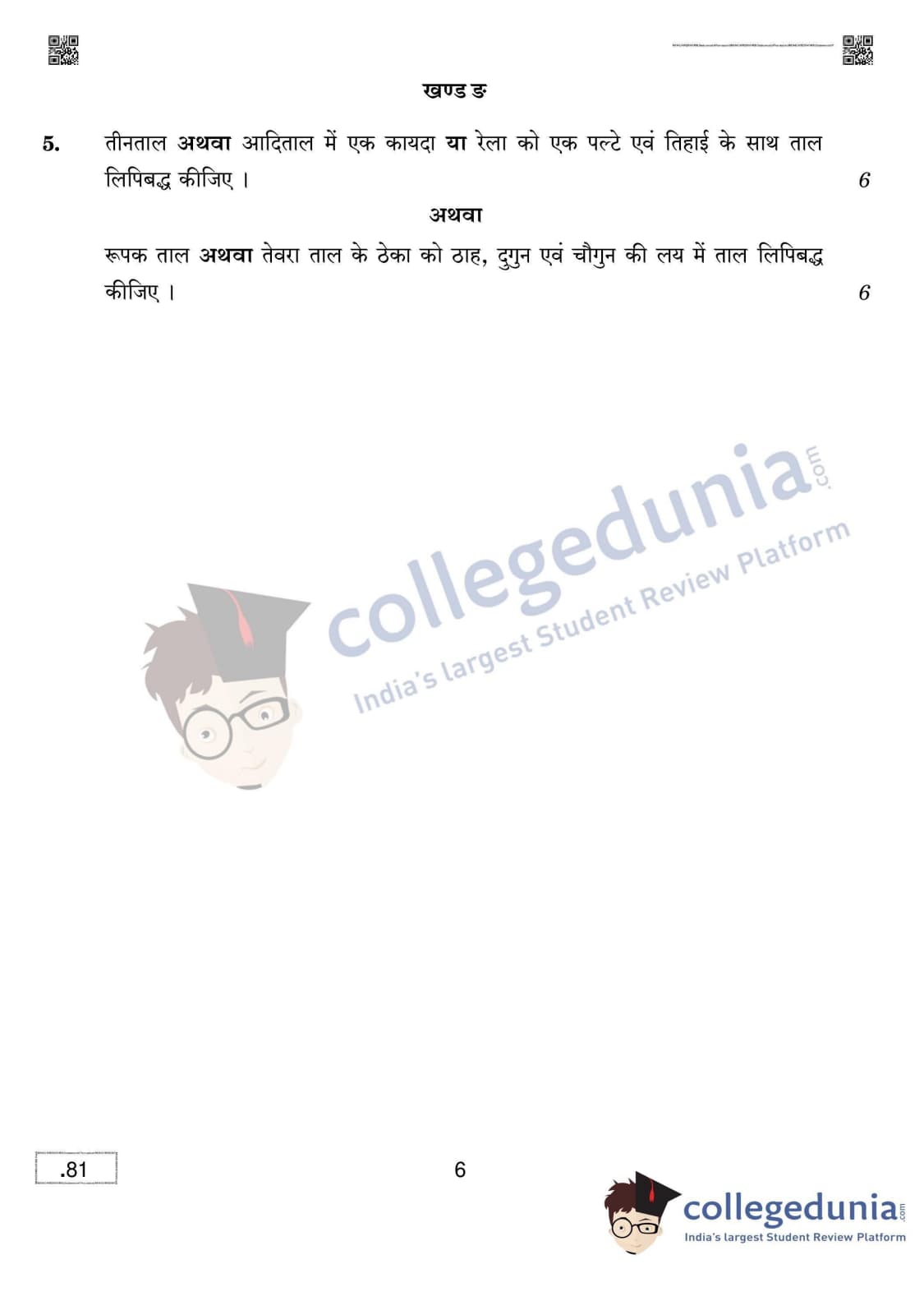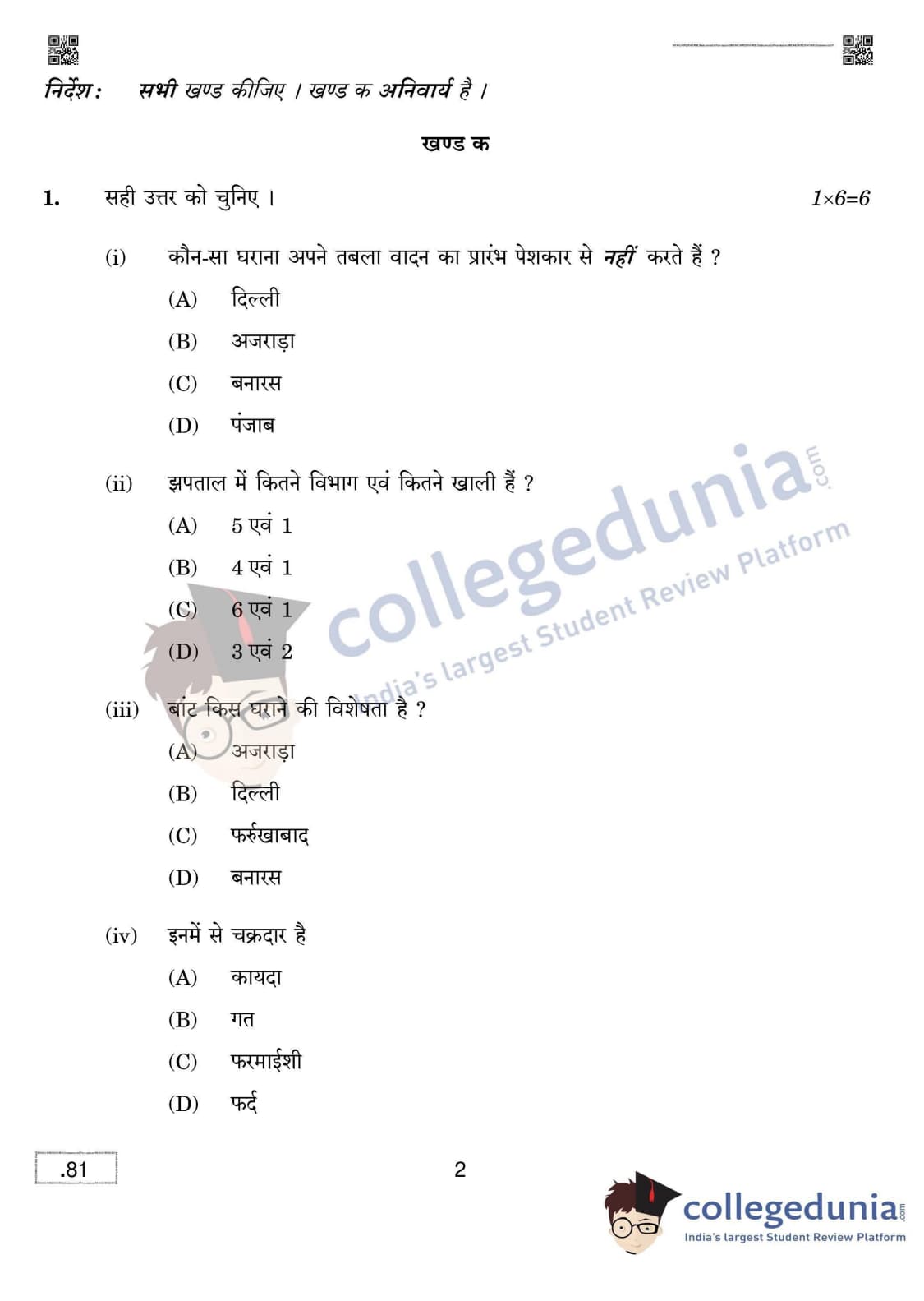 CBSE Class 12 Hindustani Music (Percussion Instruments) Question Paper 2020 with Answer Key (March 16)