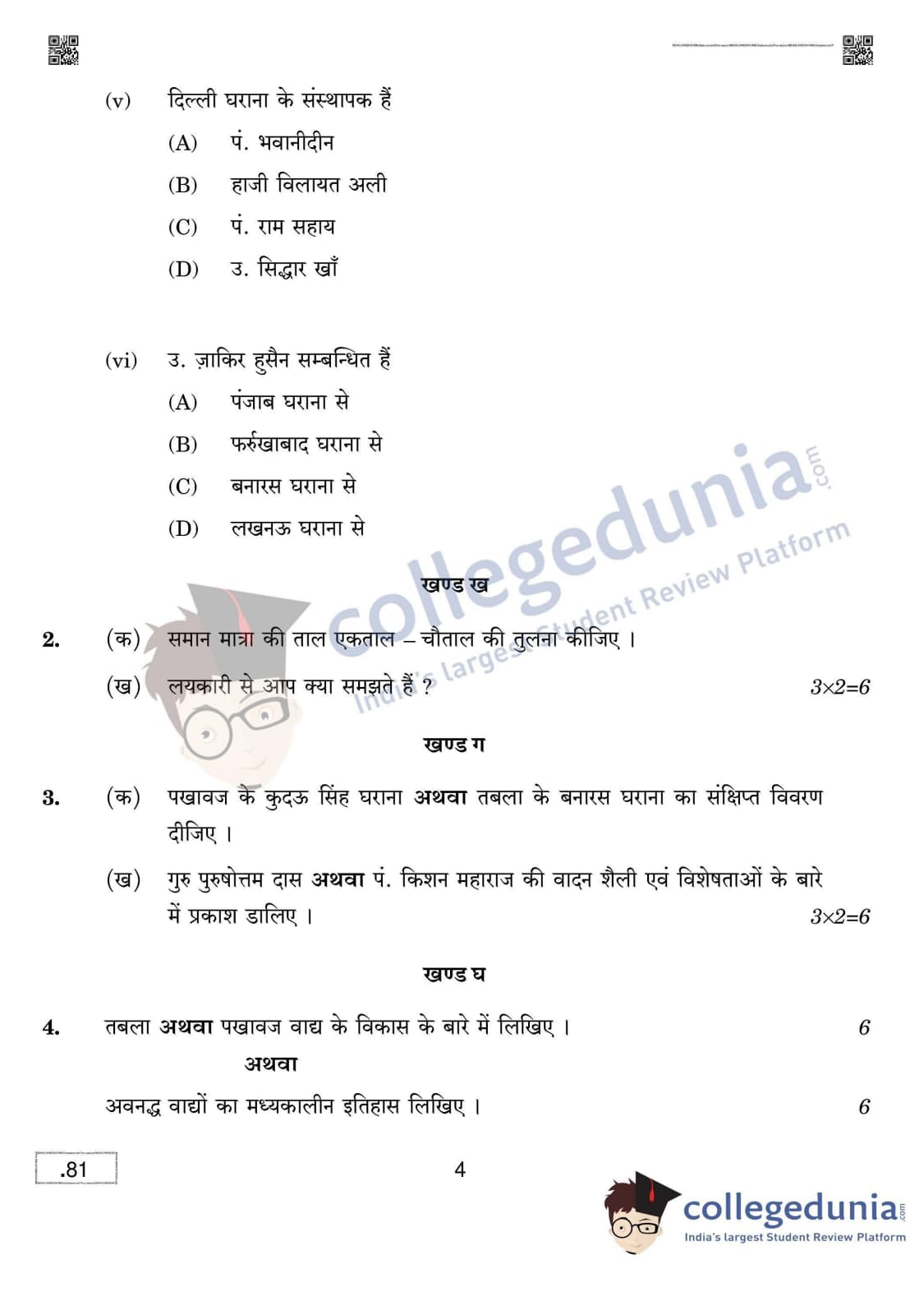 CBSE Class 12 Hindustani Music (Percussion Instruments) Question Paper 2020 with Answer Key Set 4 is available for download. The exam was conducted by the Central Board of Secondary Education on March 16, 2020 in the Morning Session 10:30 AM to 12:30 PM. The medium of paper was English & Hindi. The question paper comprised a total of 5 questions divided among 5 sections.