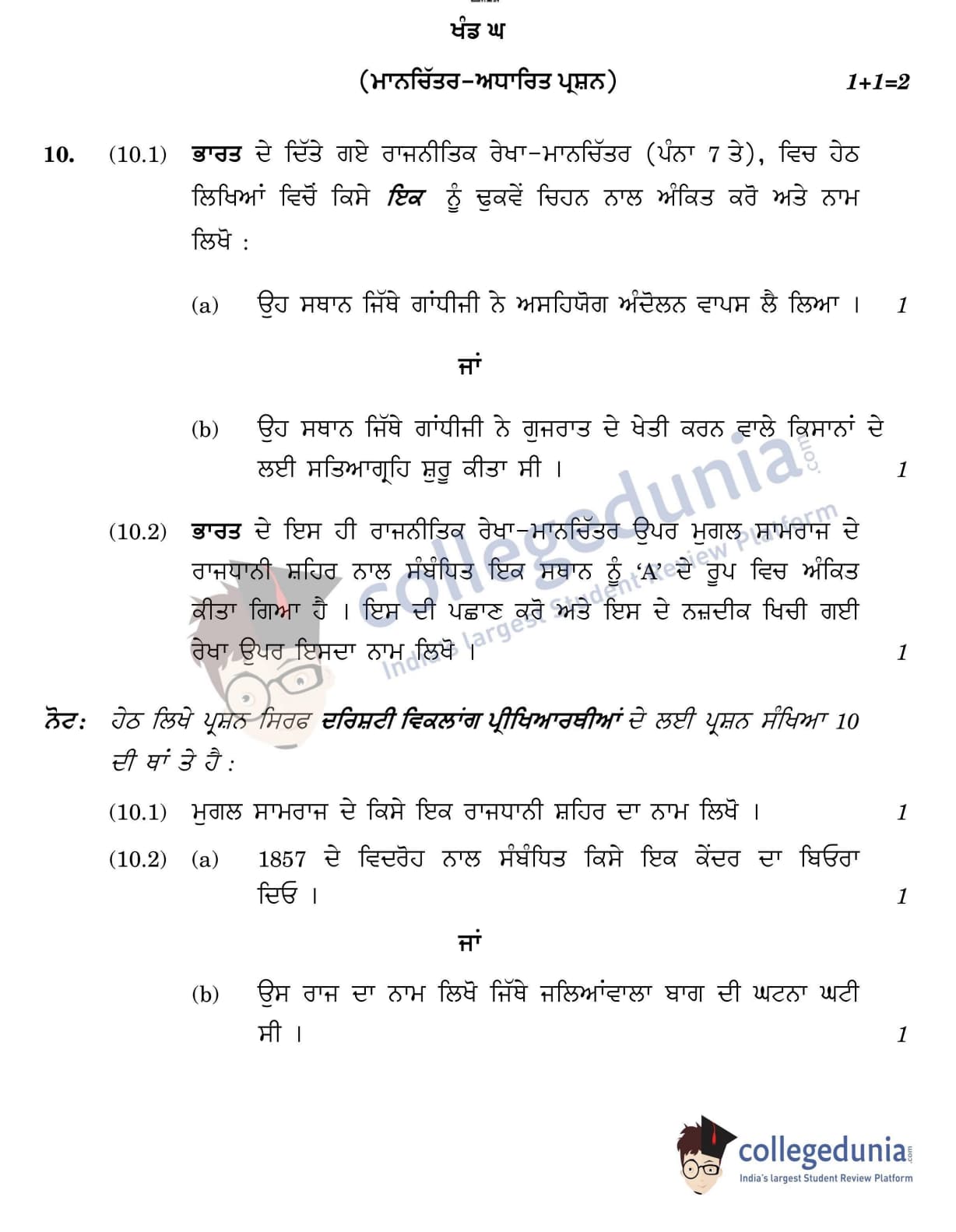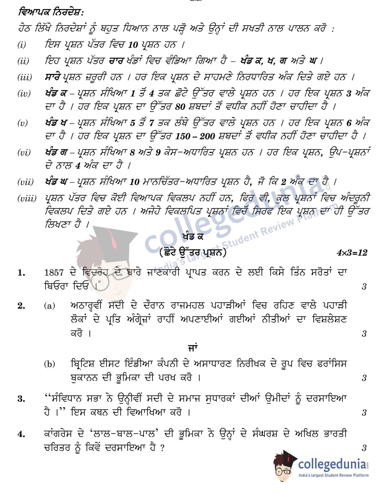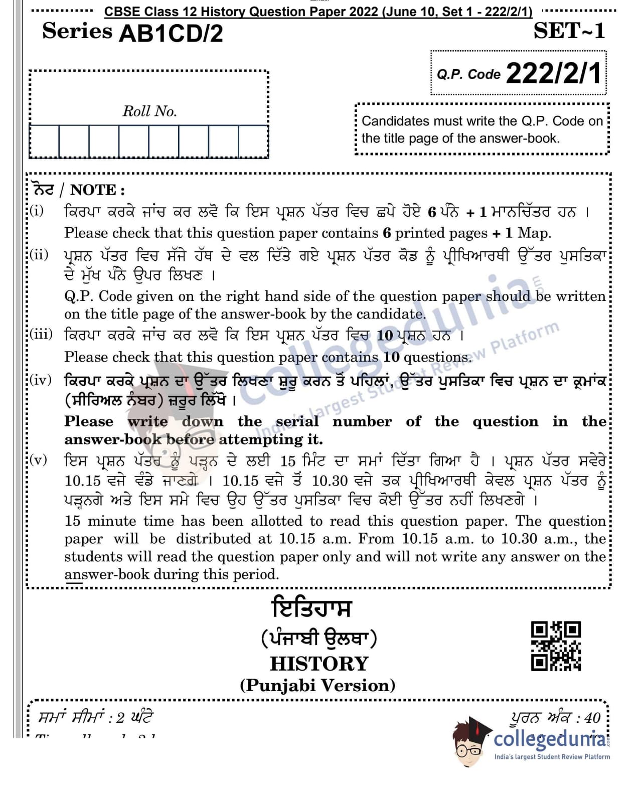 CBSE Class 12 2022 History Question Paper Set 1 - 222/2/1 with Answer Key pdf is available for download. The exam was conducted by Central Board of Secondary Education on June 10, 2022 in the Morning Session 10:30 AM to 12:30 PM. The medium of paper was Punjabi. In terms of difficulty level, CBSE Class 12 History paper was of Easy level. The question paper comprised a total of 10 questions divided among 4 sections.